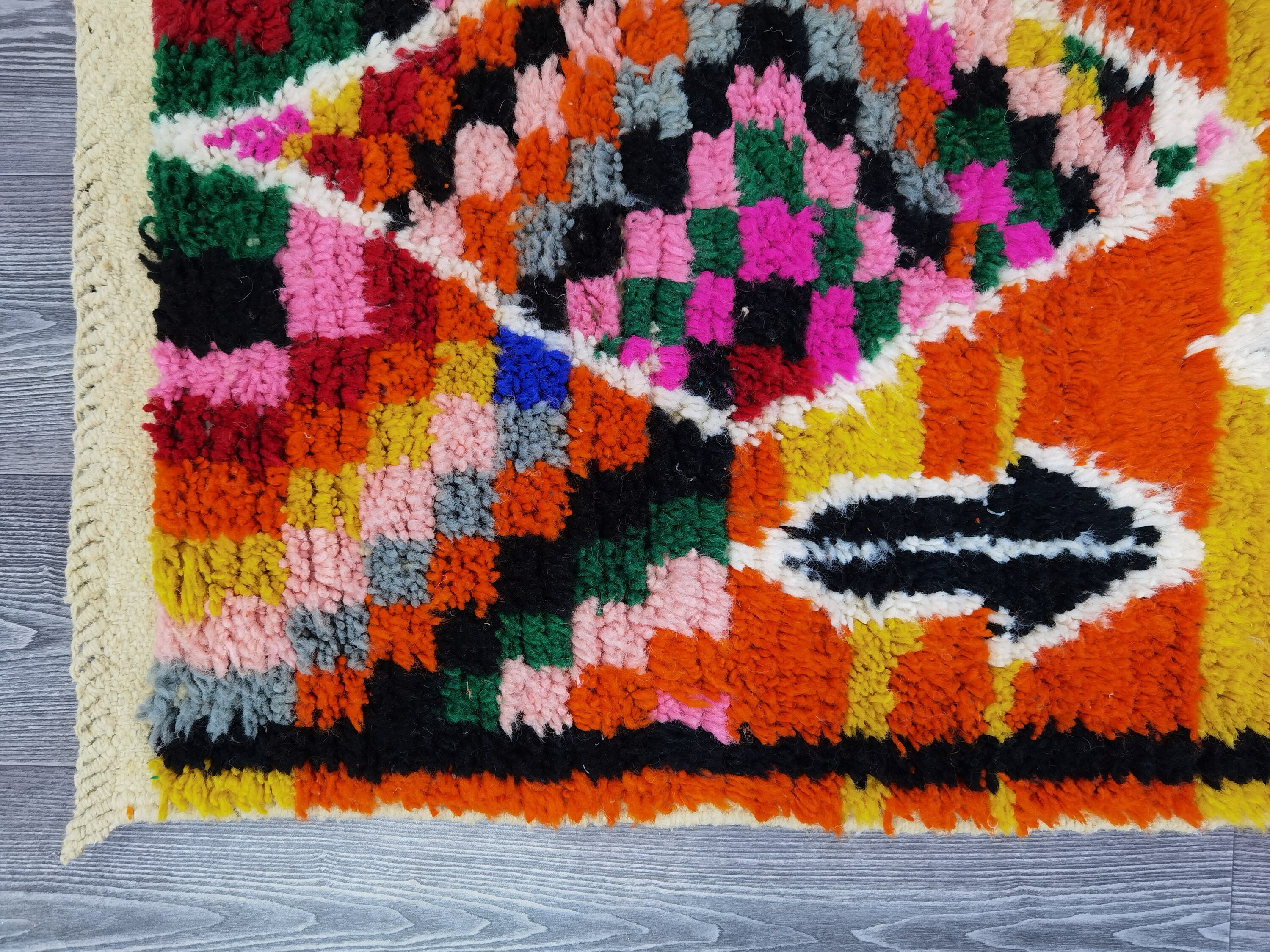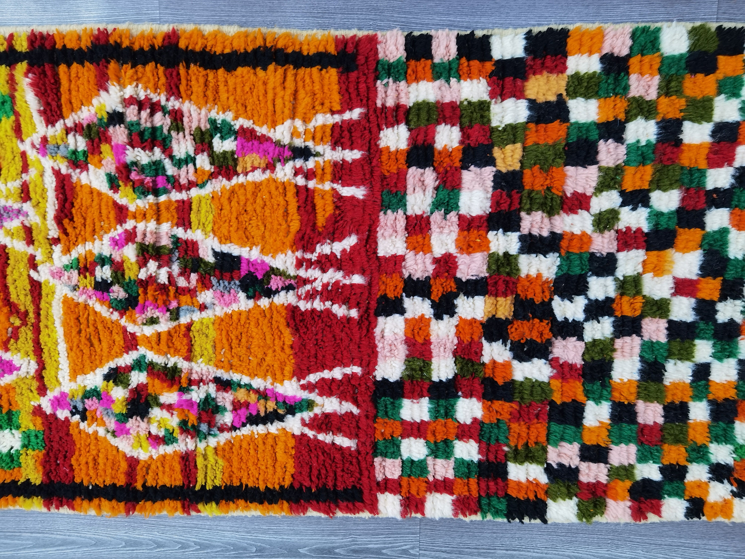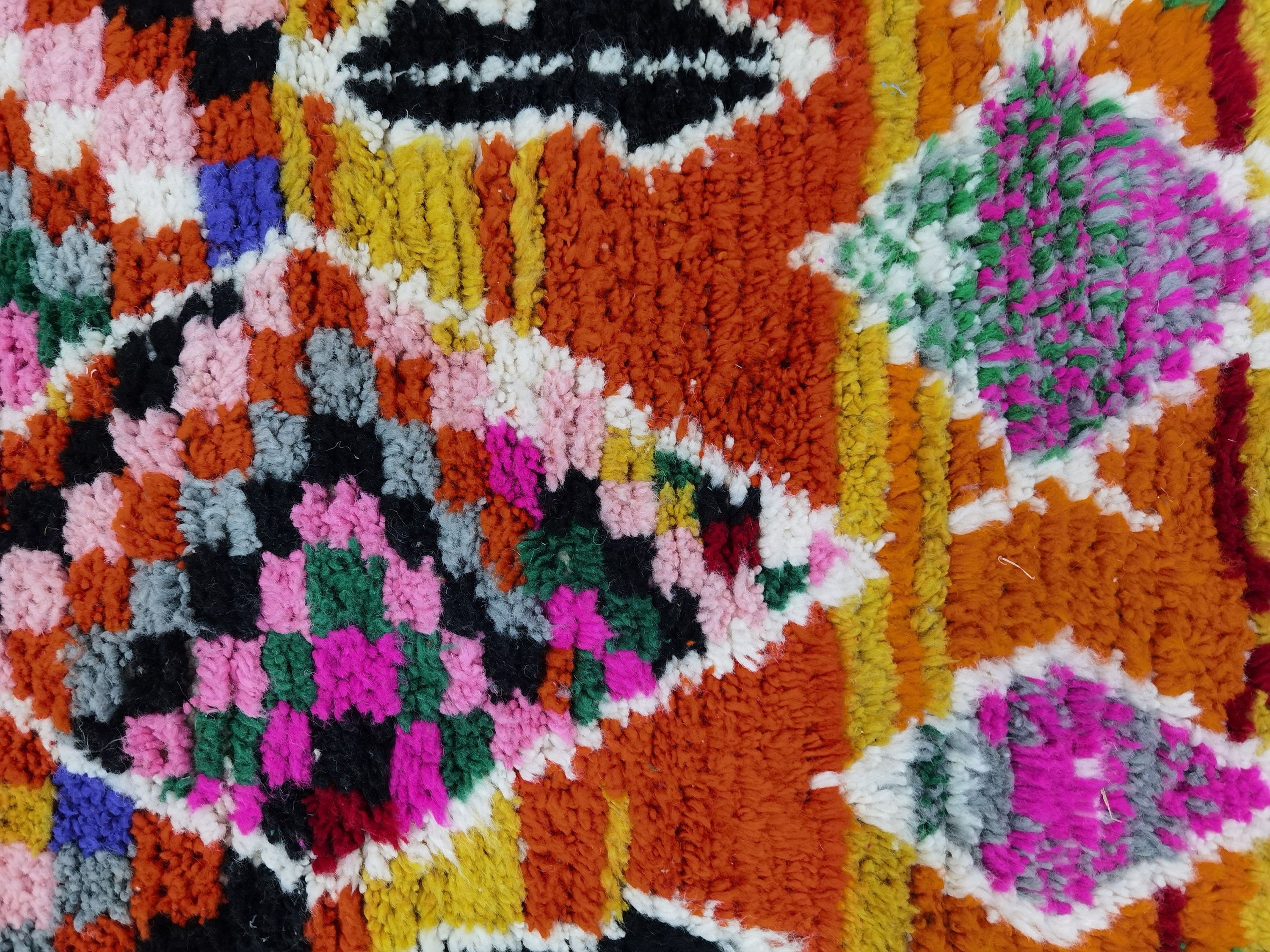 This unique Handwoven Moroccan Boujaad wool rug is one of a kind. A unique rare artistic handmade art, a beautiful combination of colors. which makes it the best choice whether for your house or your showroom. The famous Boujaad rug is now on the cover of the worldโs leading home decoration magazines. This rug with character goes perfectly with all interior styles, Bohemian, Modern, Minimalist, Scandinavian, Traditional, which makes it the best choice for your needs.