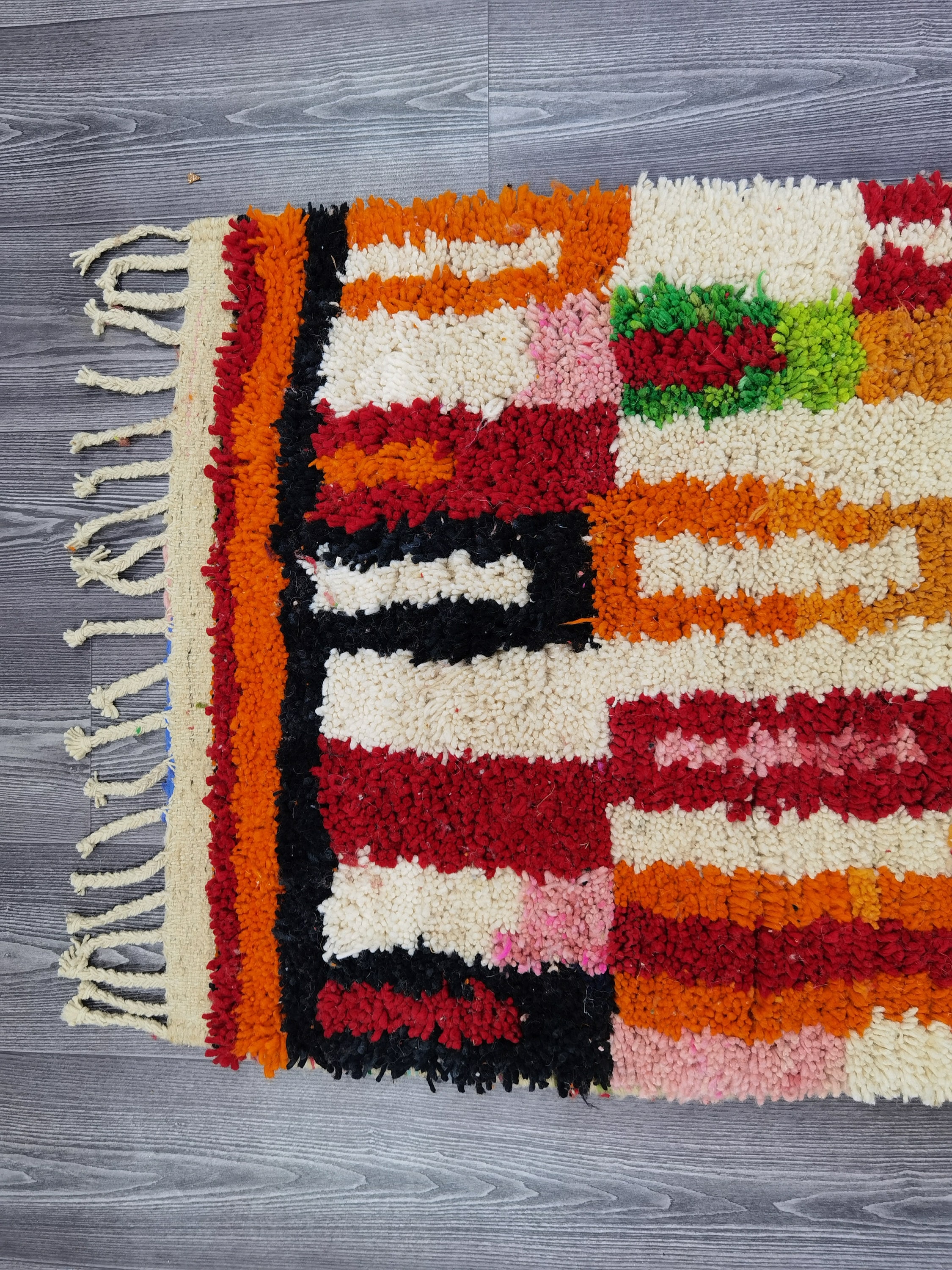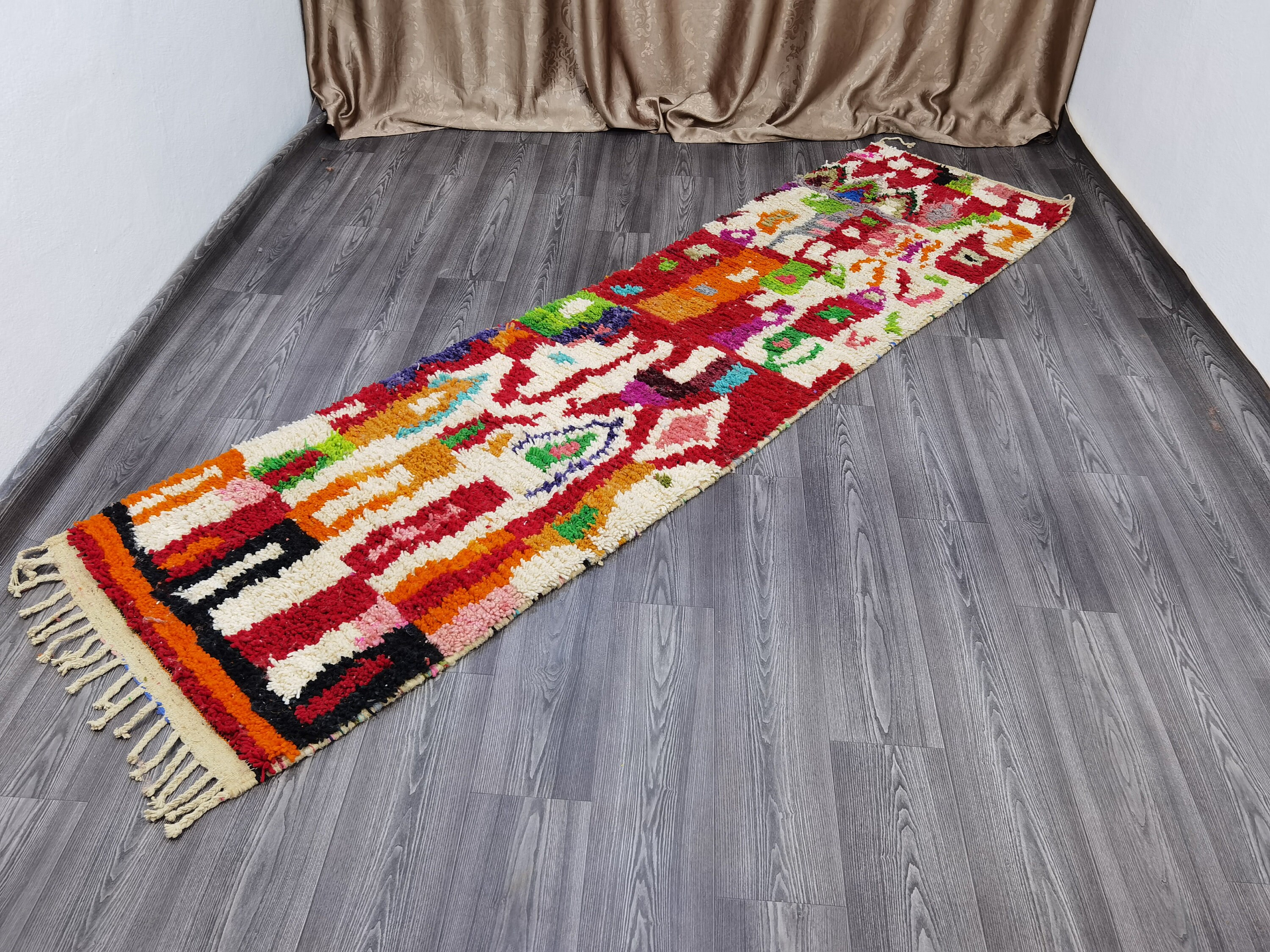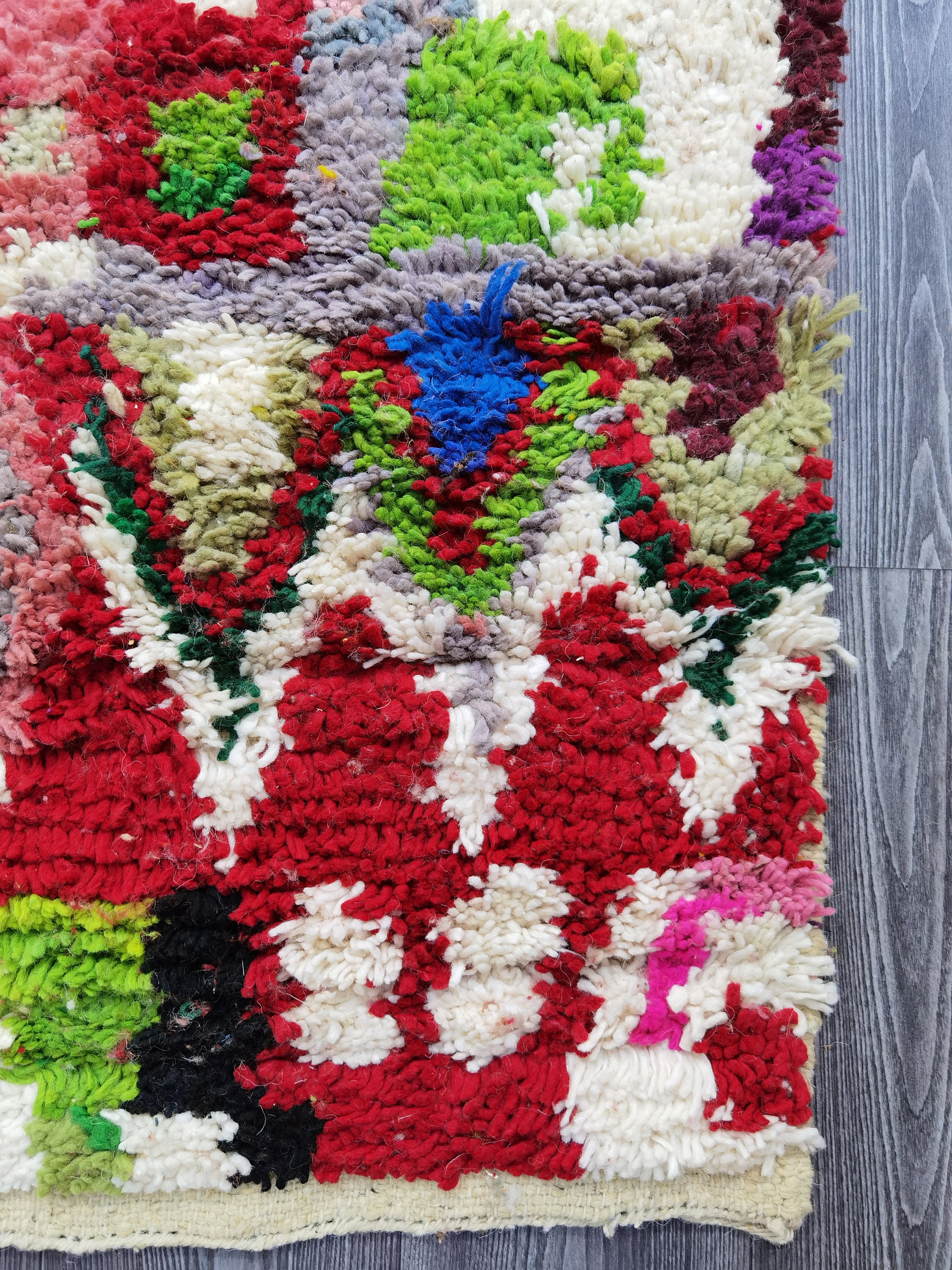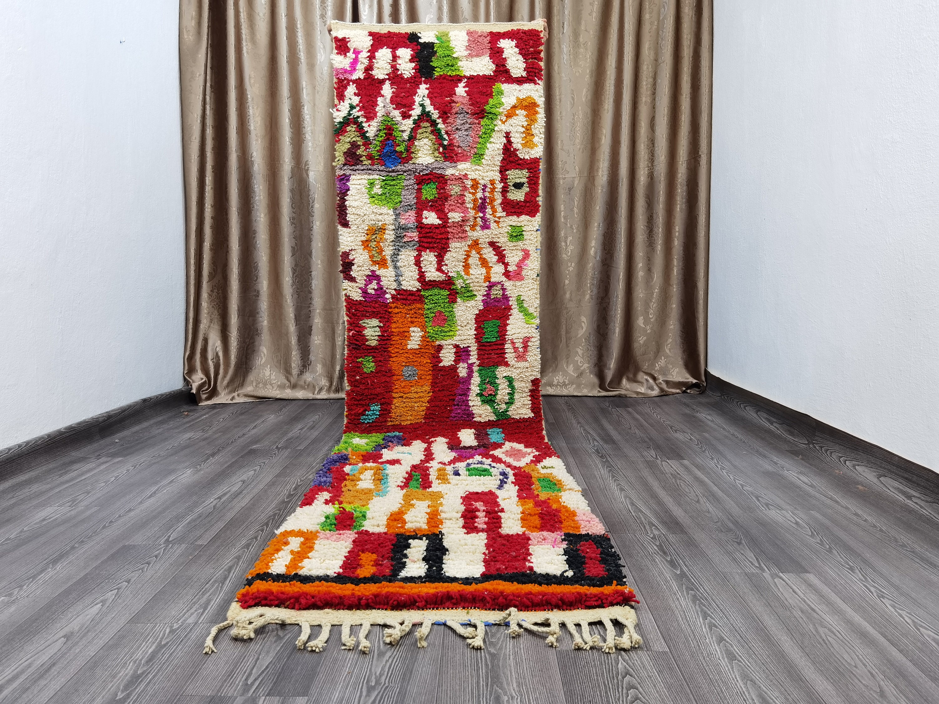 This unique Handwoven Moroccan Boujaad wool rug is one of a kind. A unique rare artistic handmade art, a beautiful combination of colors. which makes it the best choice whether for your house or your showroom. The famous Boujaad rug is now on the cover of the worldโs leading home decoration magazines. This rug with character goes perfectly with all interior styles, Bohemian, Modern, Minimalist, Scandinavian, Traditional, which makes it the best choice for your needs.
