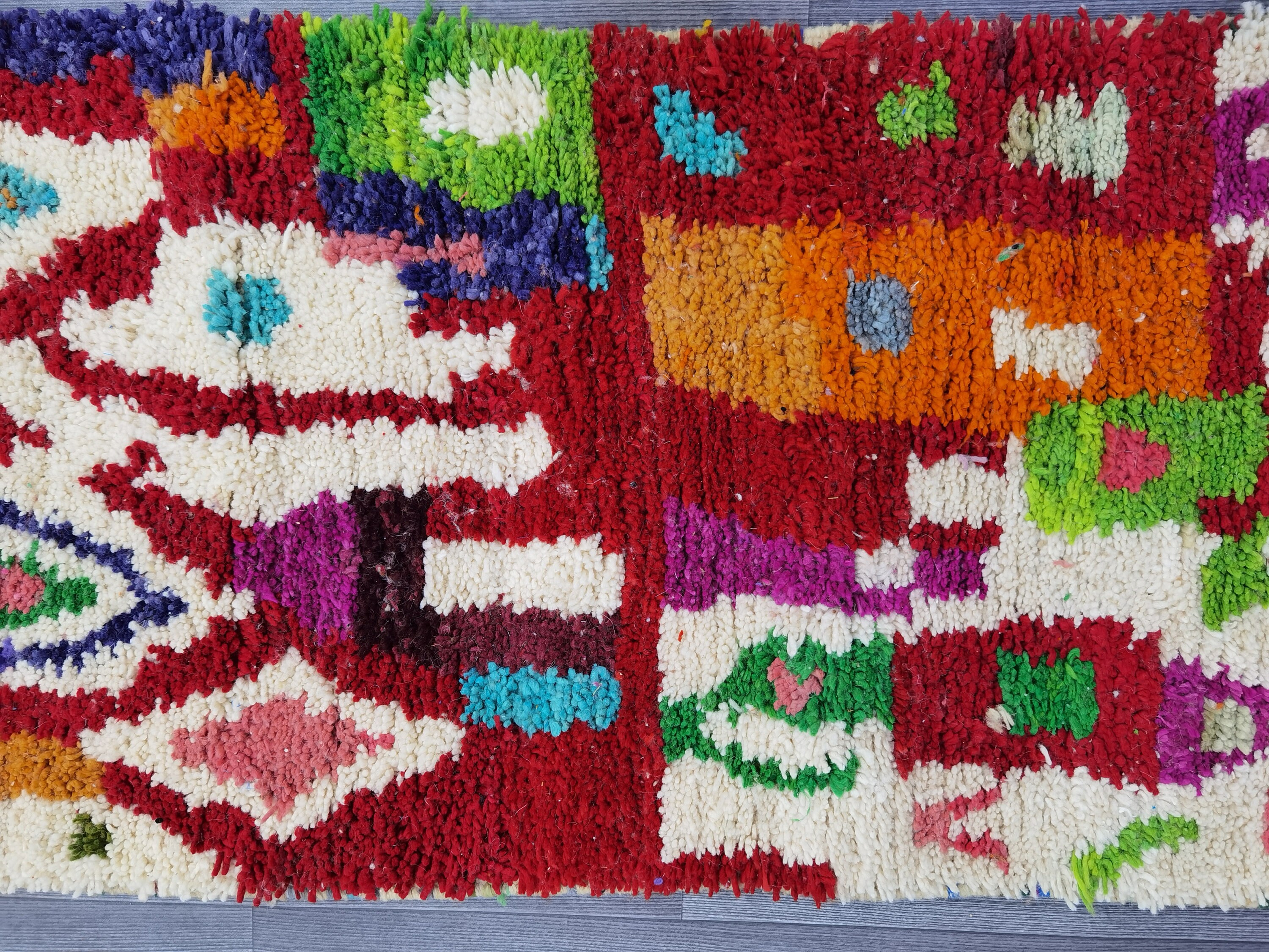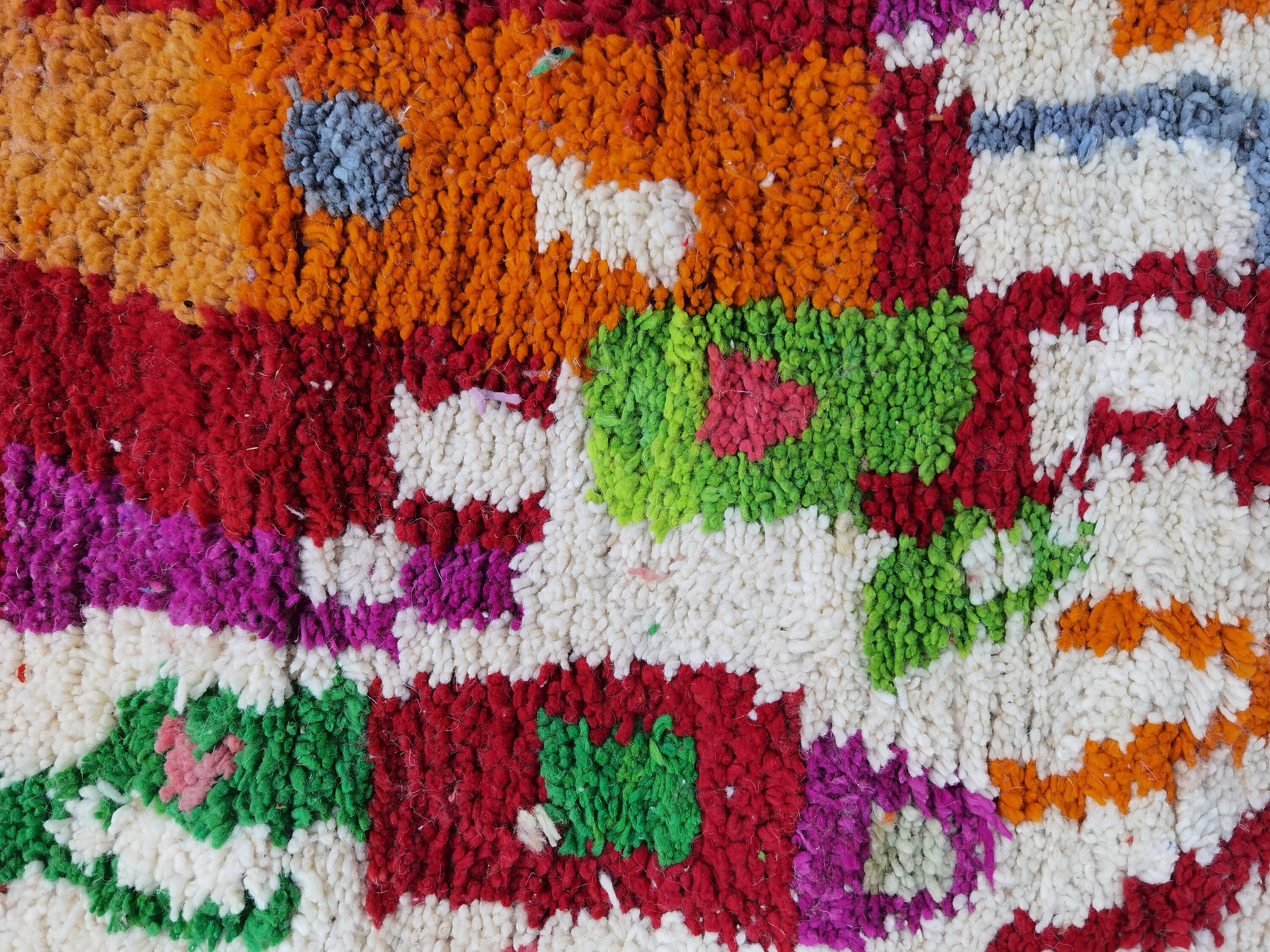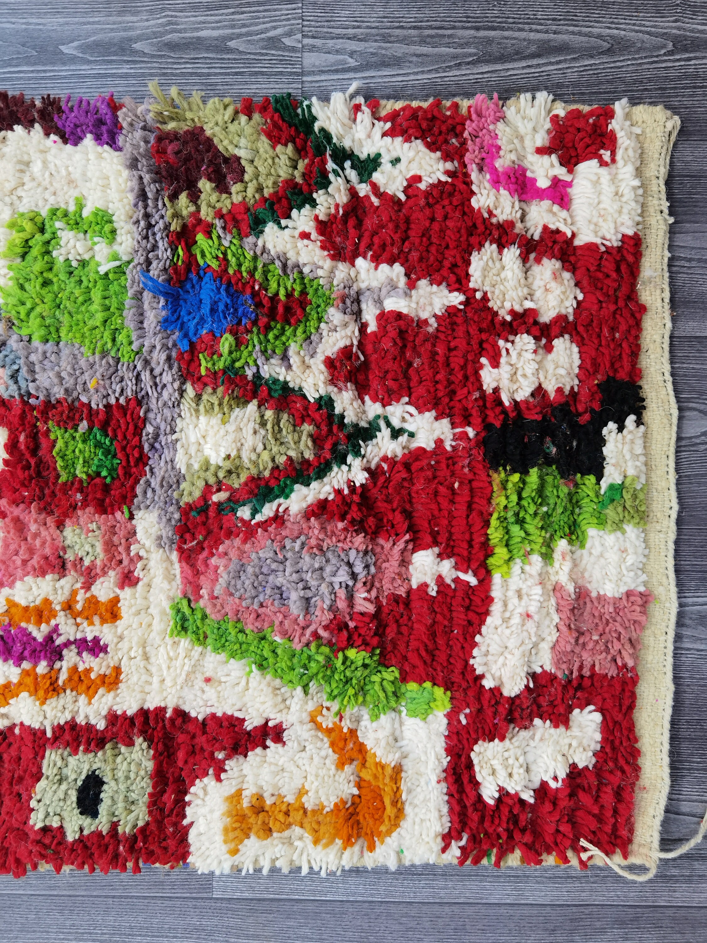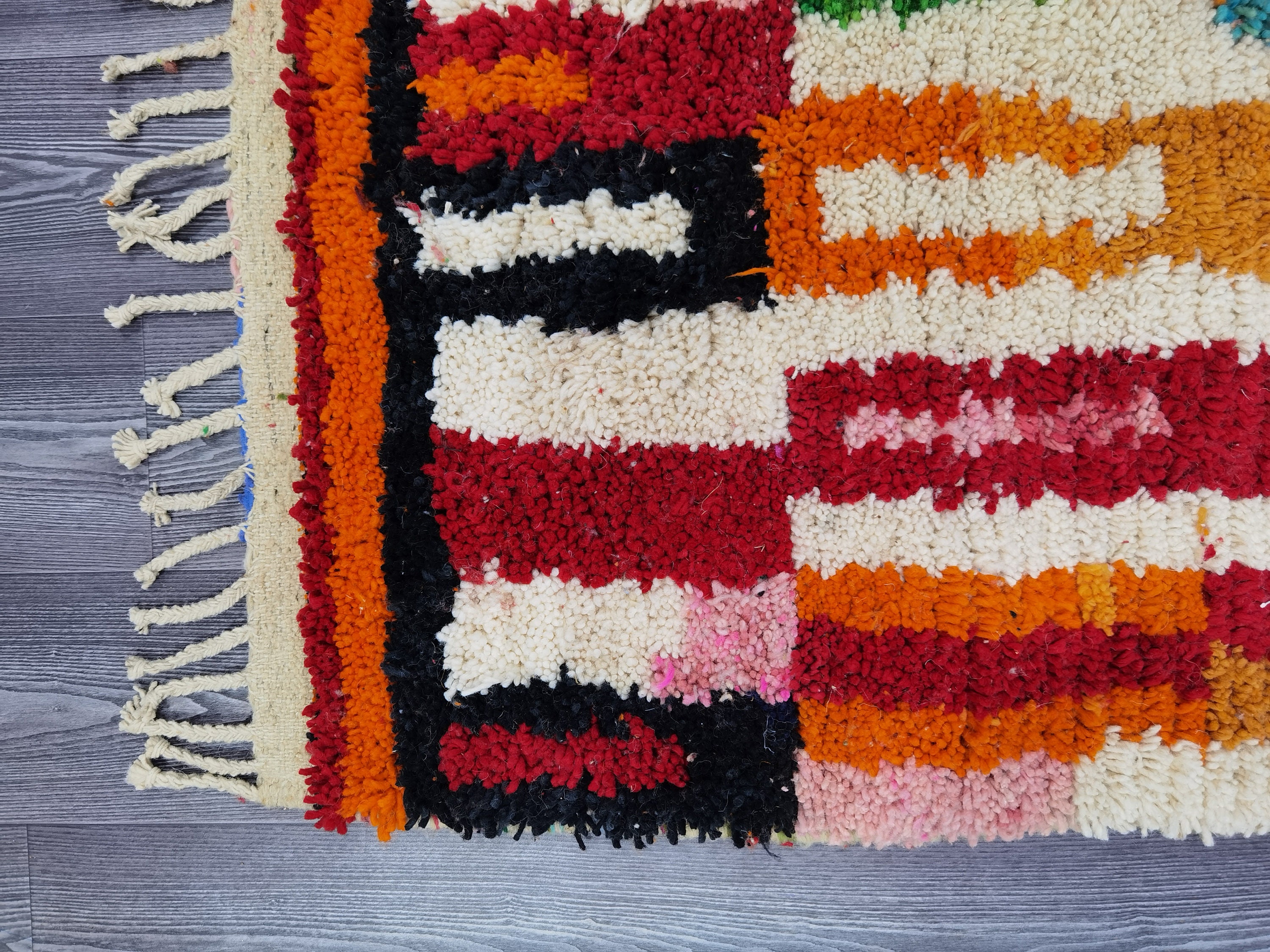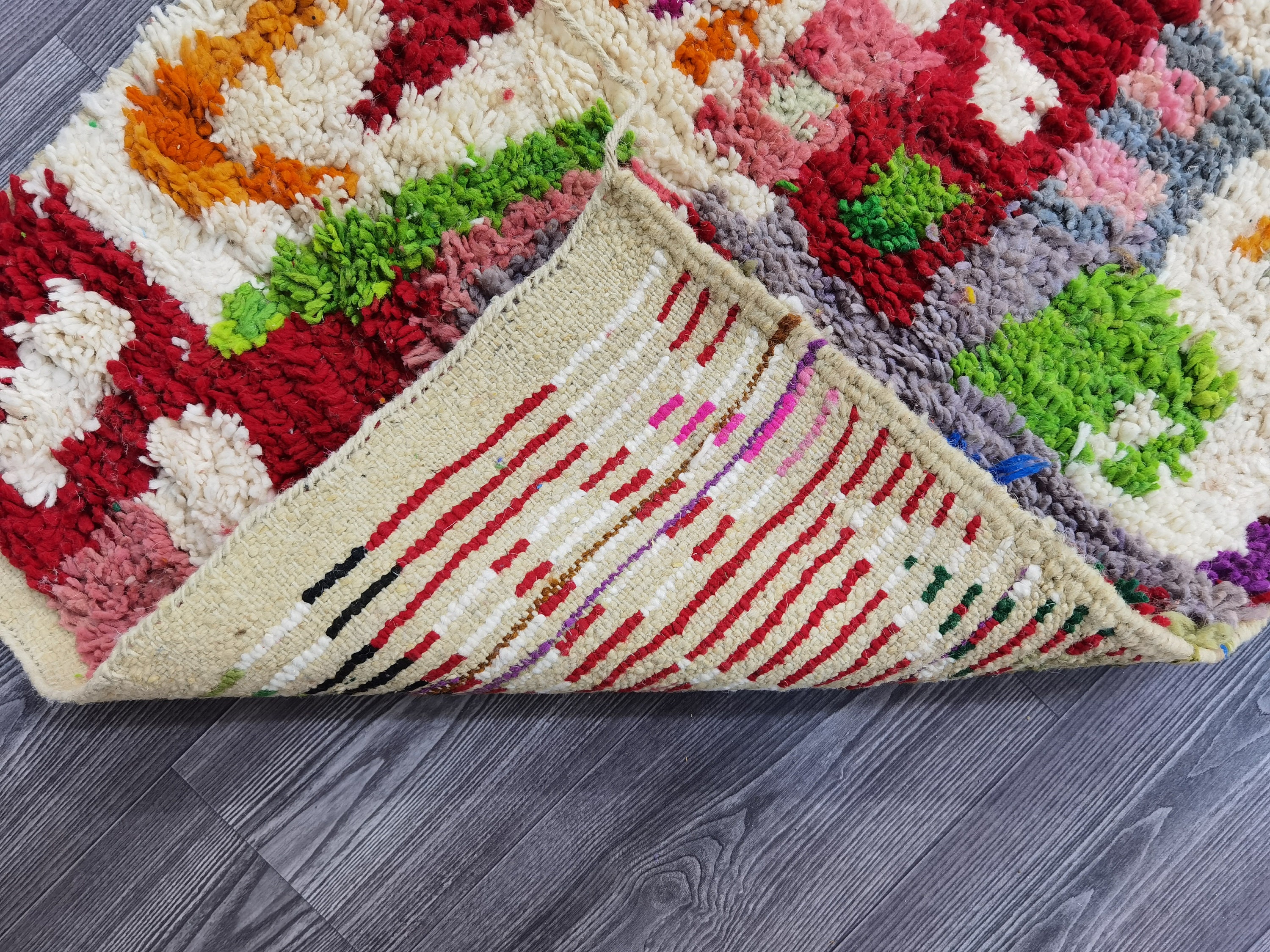This unique Handwoven Moroccan Boujaad wool rug is one of a kind. A unique rare artistic handmade art, a beautiful combination of colors. which makes it the best choice whether for your house or your showroom. The famous Boujaad rug is now on the cover of the worldโs leading home decoration magazines. This rug with character goes perfectly with all interior styles, Bohemian, Modern, Minimalist, Scandinavian, Traditional, which makes it the best choice for your needs.
