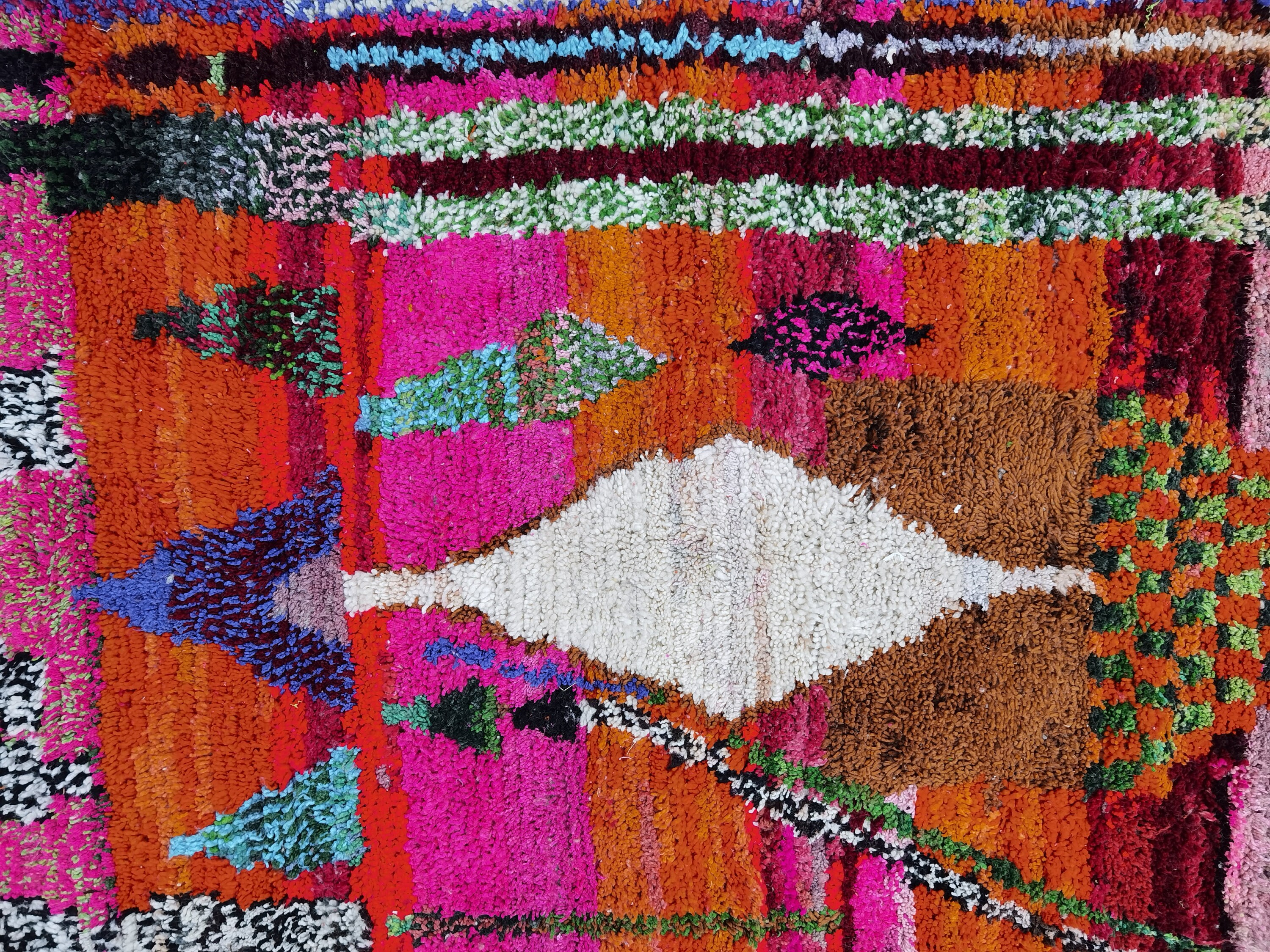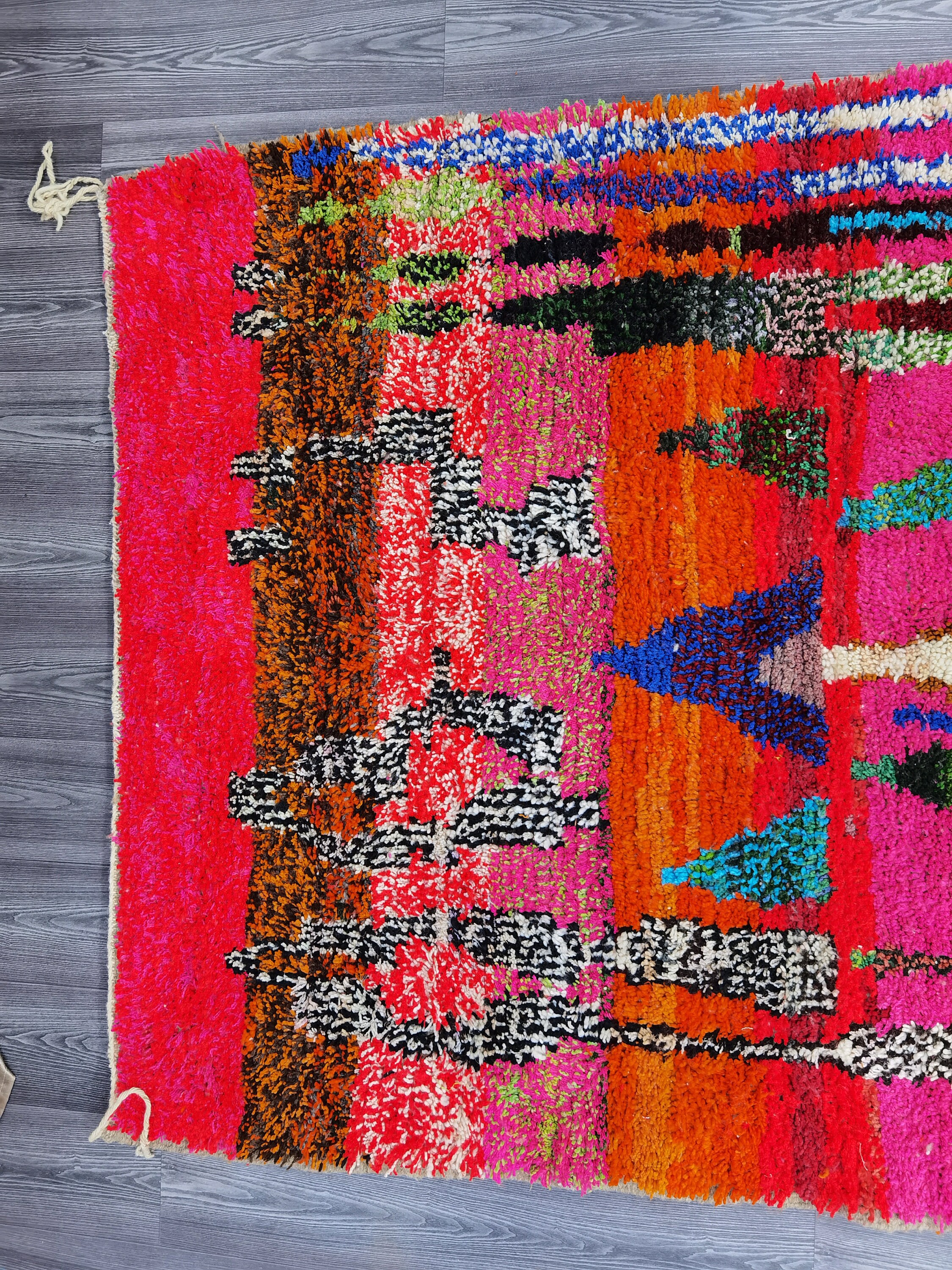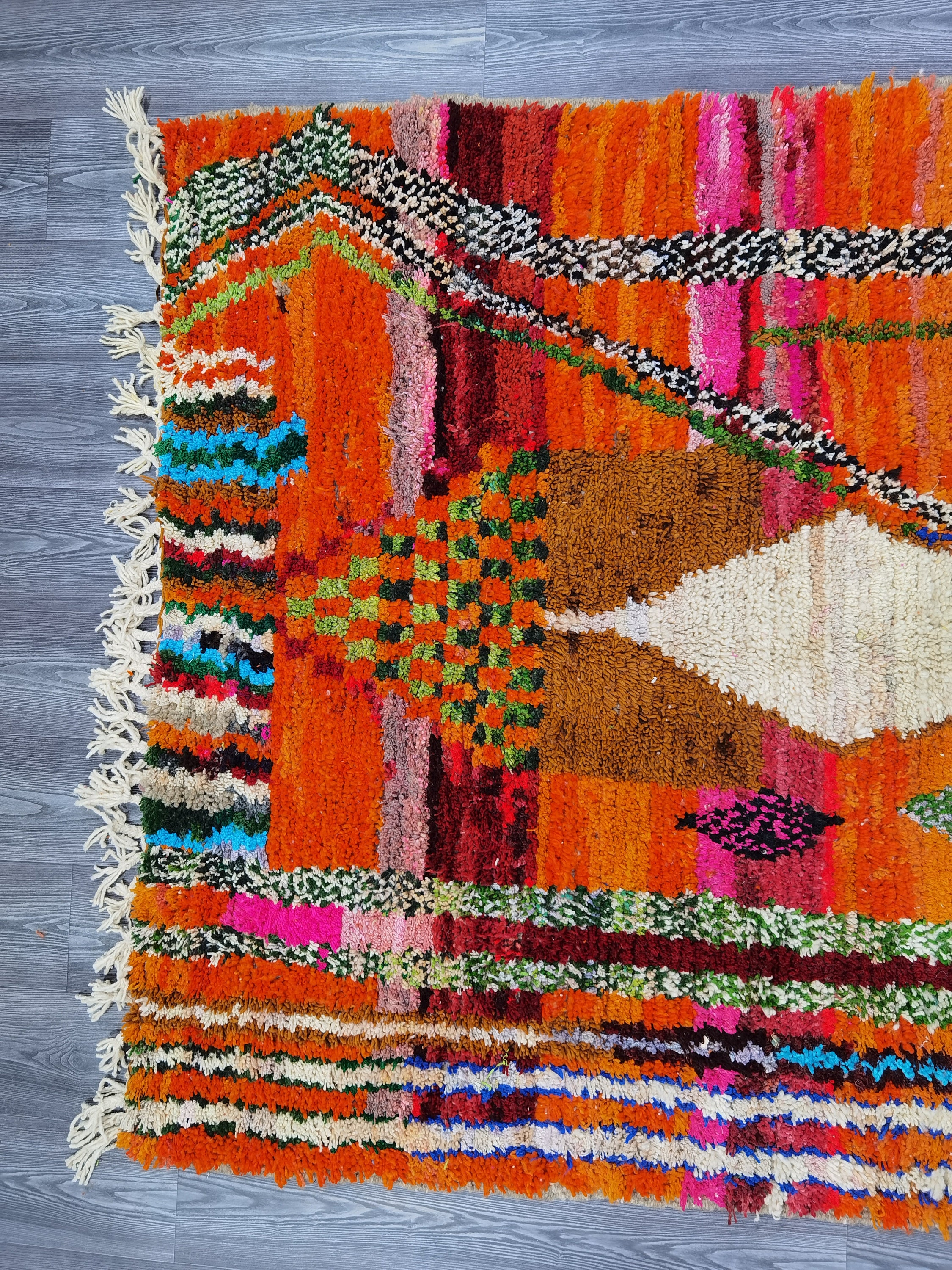 This unique Handwoven Moroccan Boujaad wool rug is one of a kind. A unique rare artistic handmade art, a beautiful combination of colors. which makes it the best choice whether for your house or your showroom. The famous Boujaad rug is now on the cover of the world’s leading home decoration magazines. This rug with character goes perfectly with all interior styles, Bohemian, Modern, Minimalist, Scandinavian, Traditional, which makes it the best choice for your needs.