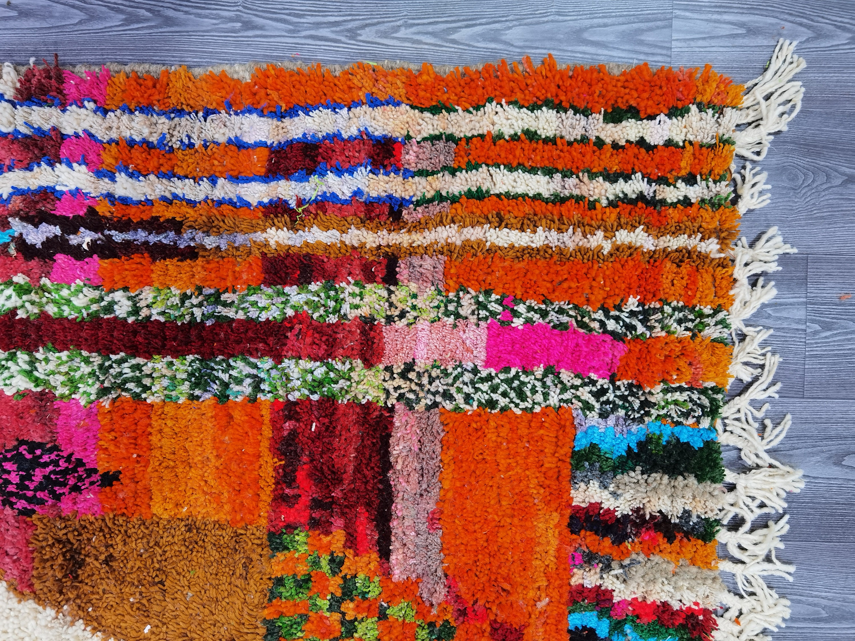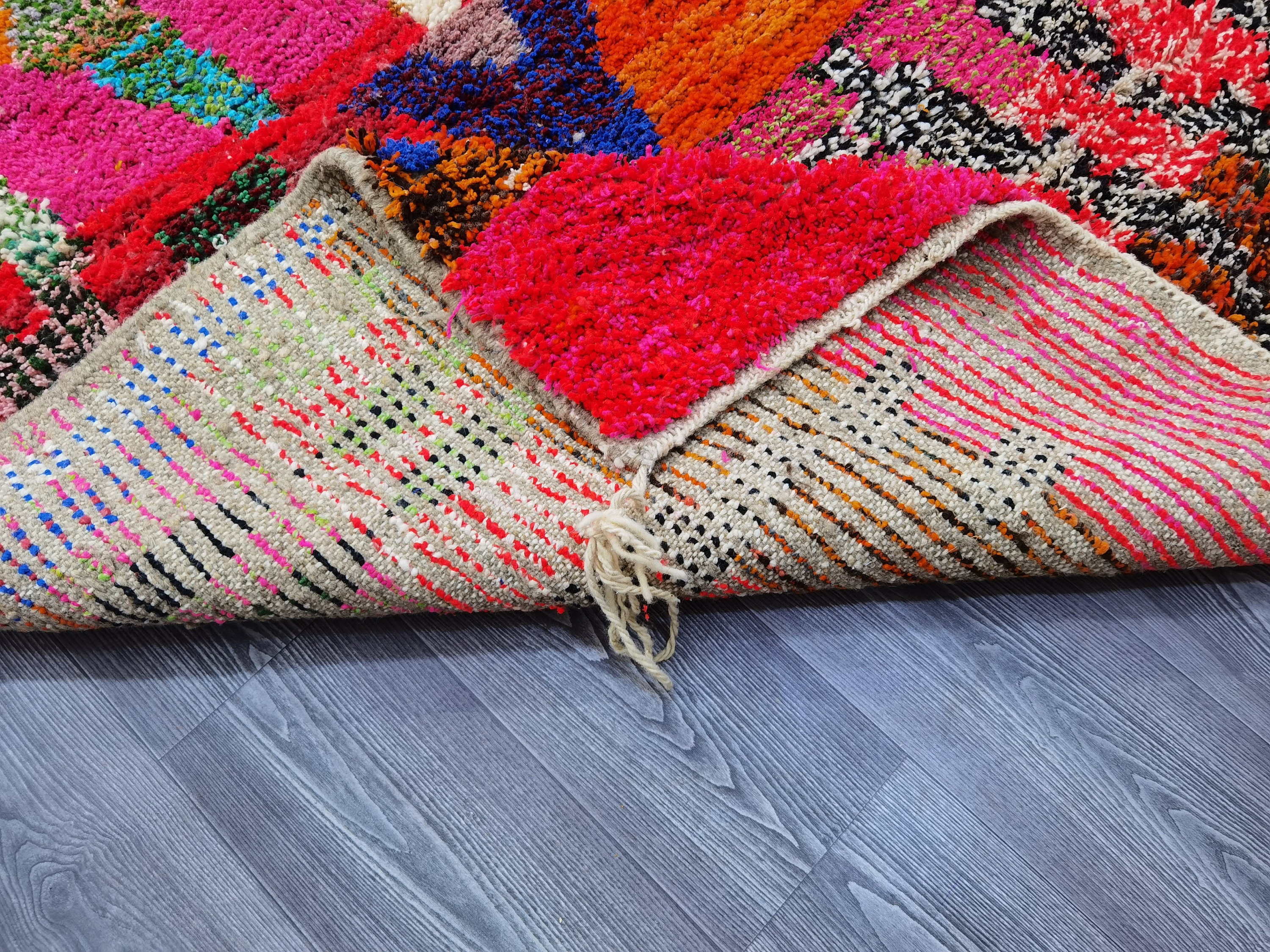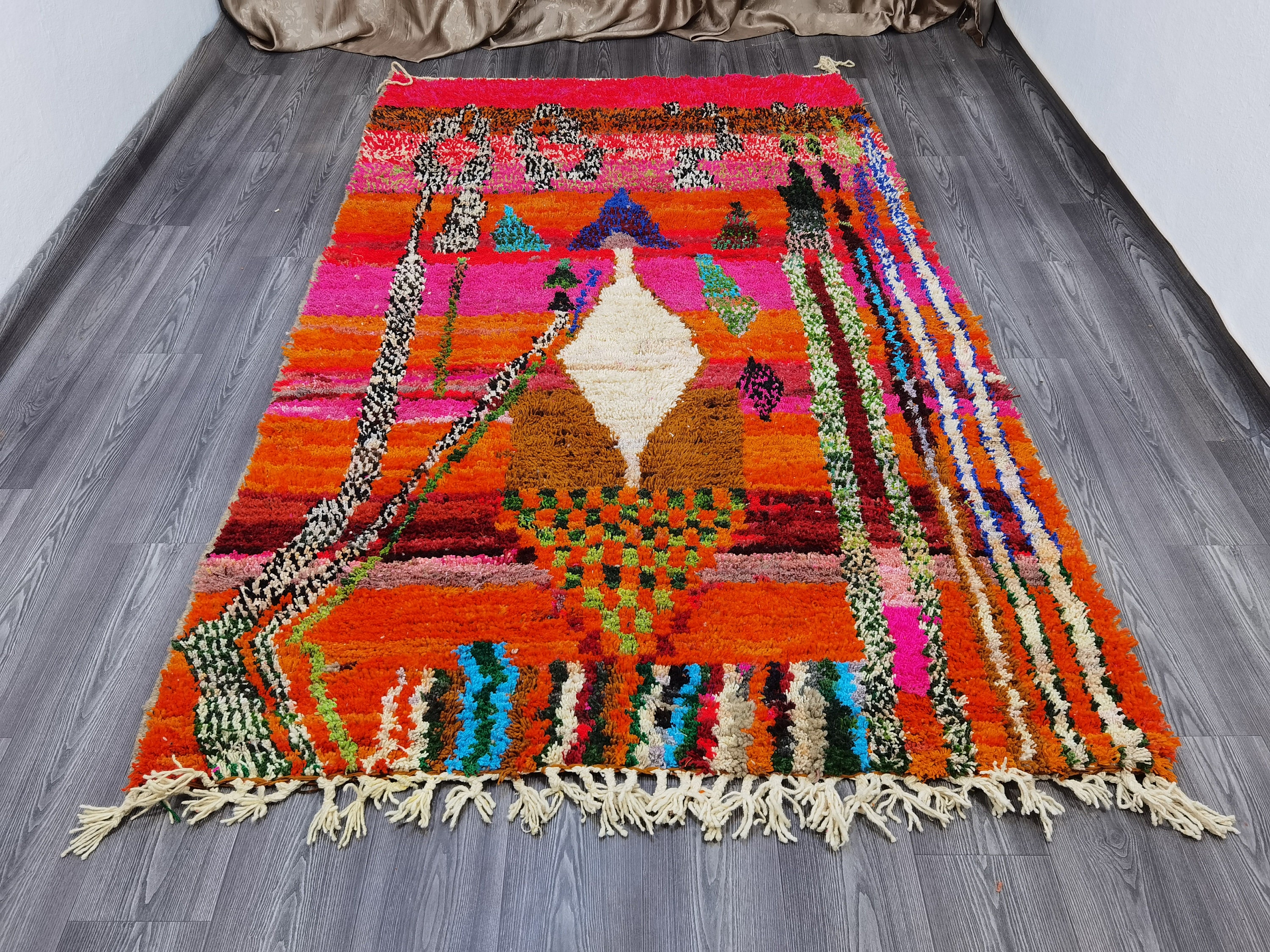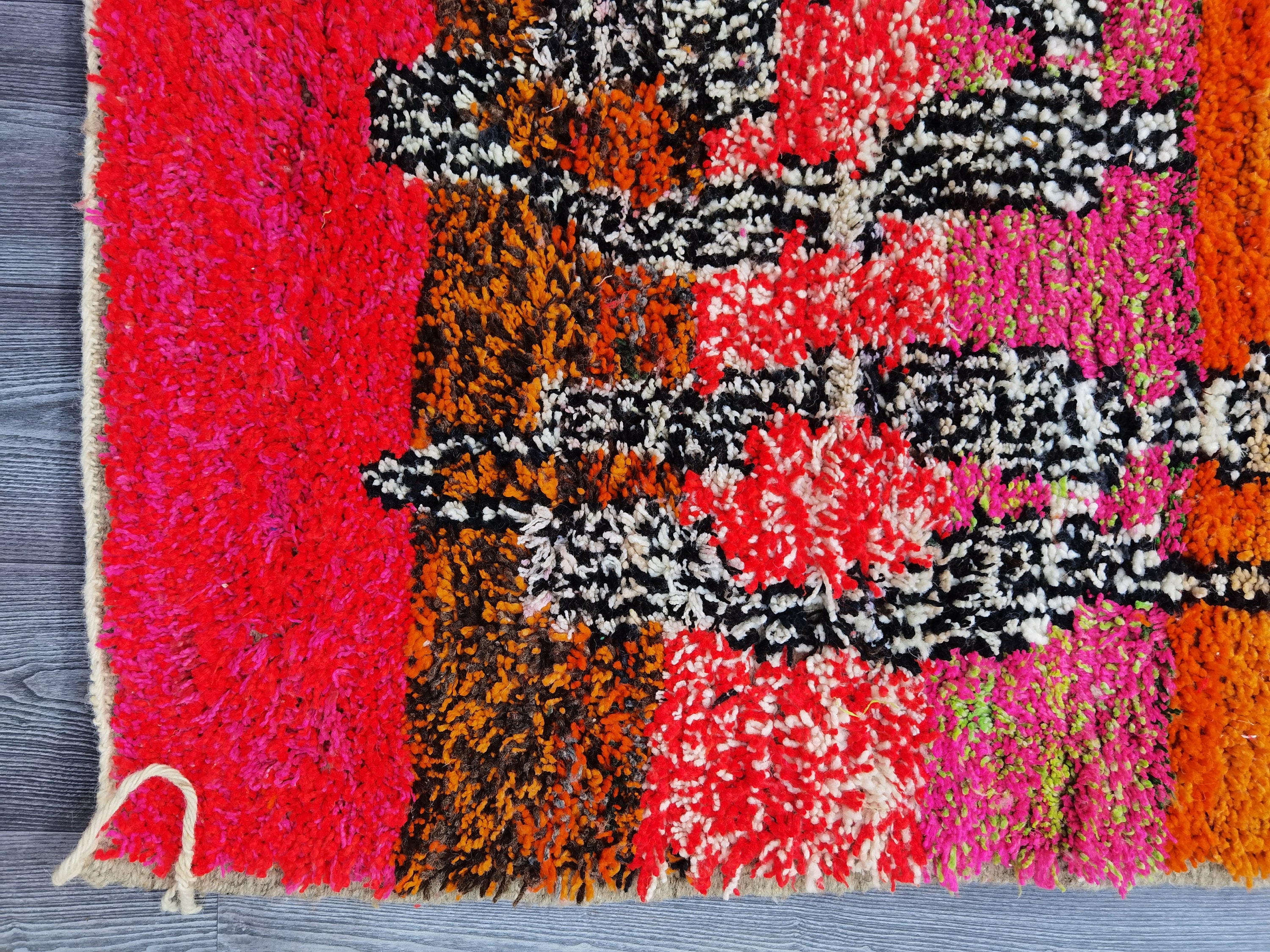 This unique Handwoven Moroccan Boujaad wool rug is one of a kind. A unique rare artistic handmade art, a beautiful combination of colors. which makes it the best choice whether for your house or your showroom. The famous Boujaad rug is now on the cover of the world’s leading home decoration magazines. This rug with character goes perfectly with all interior styles, Bohemian, Modern, Minimalist, Scandinavian, Traditional, which makes it the best choice for your needs.