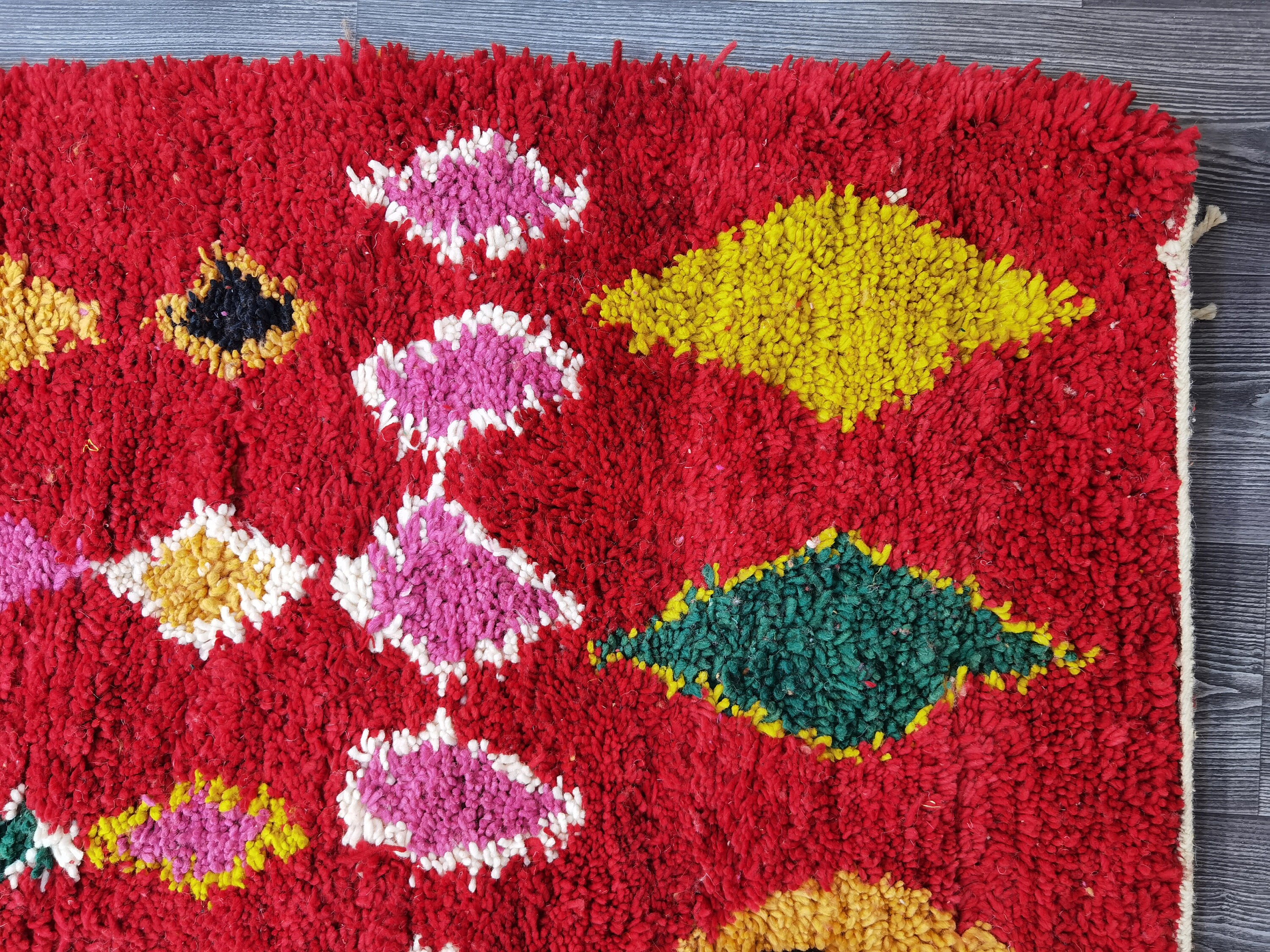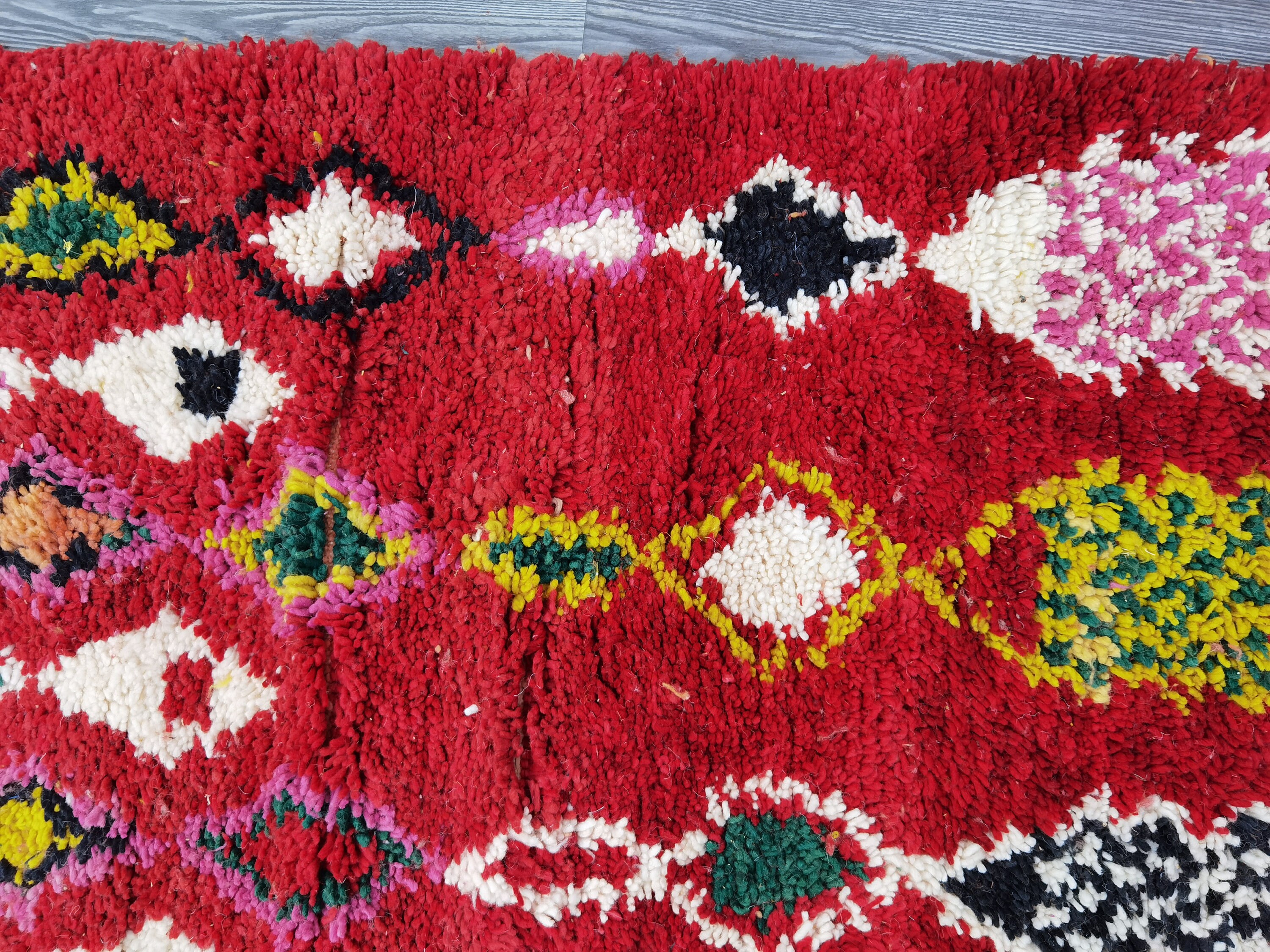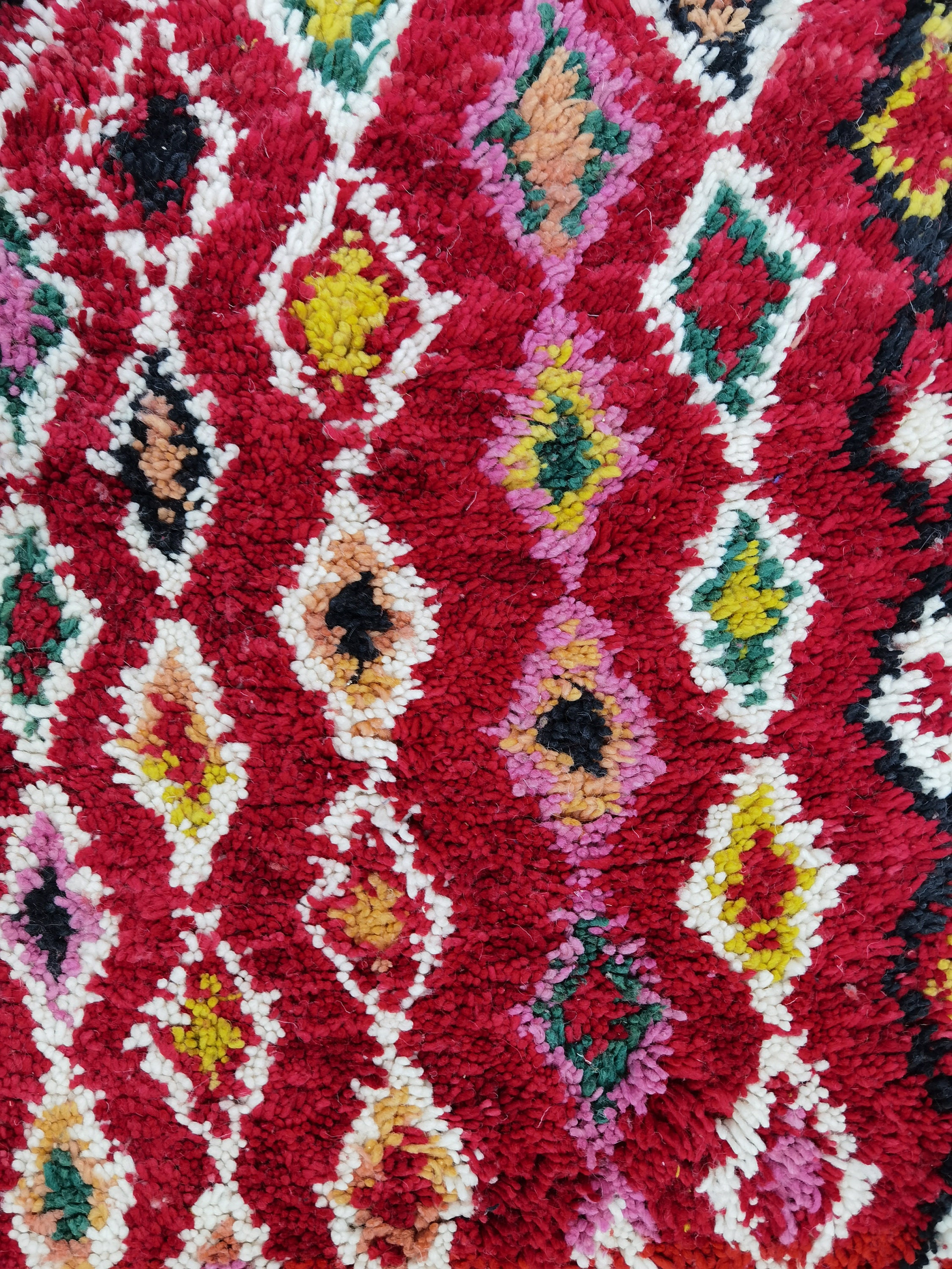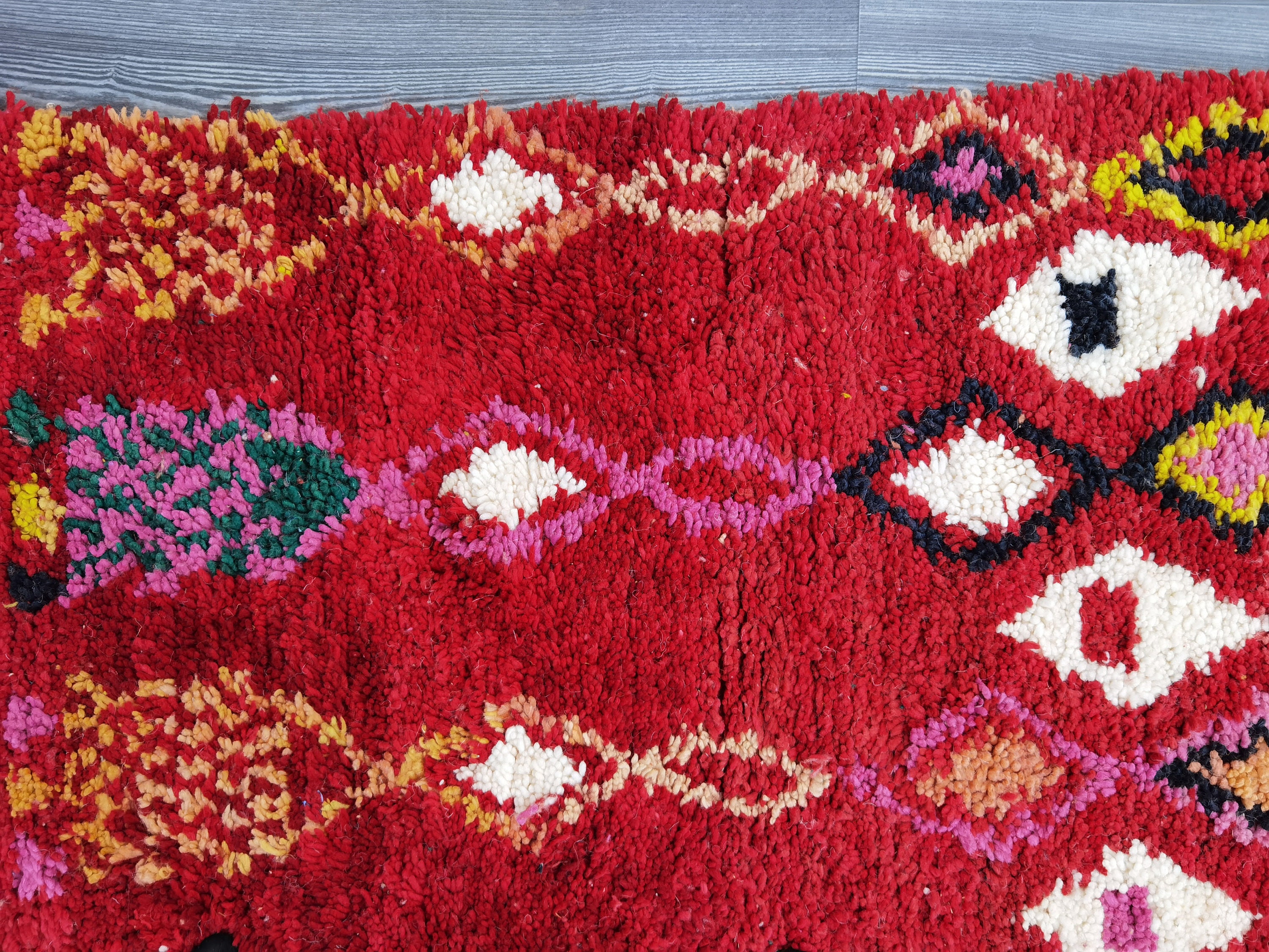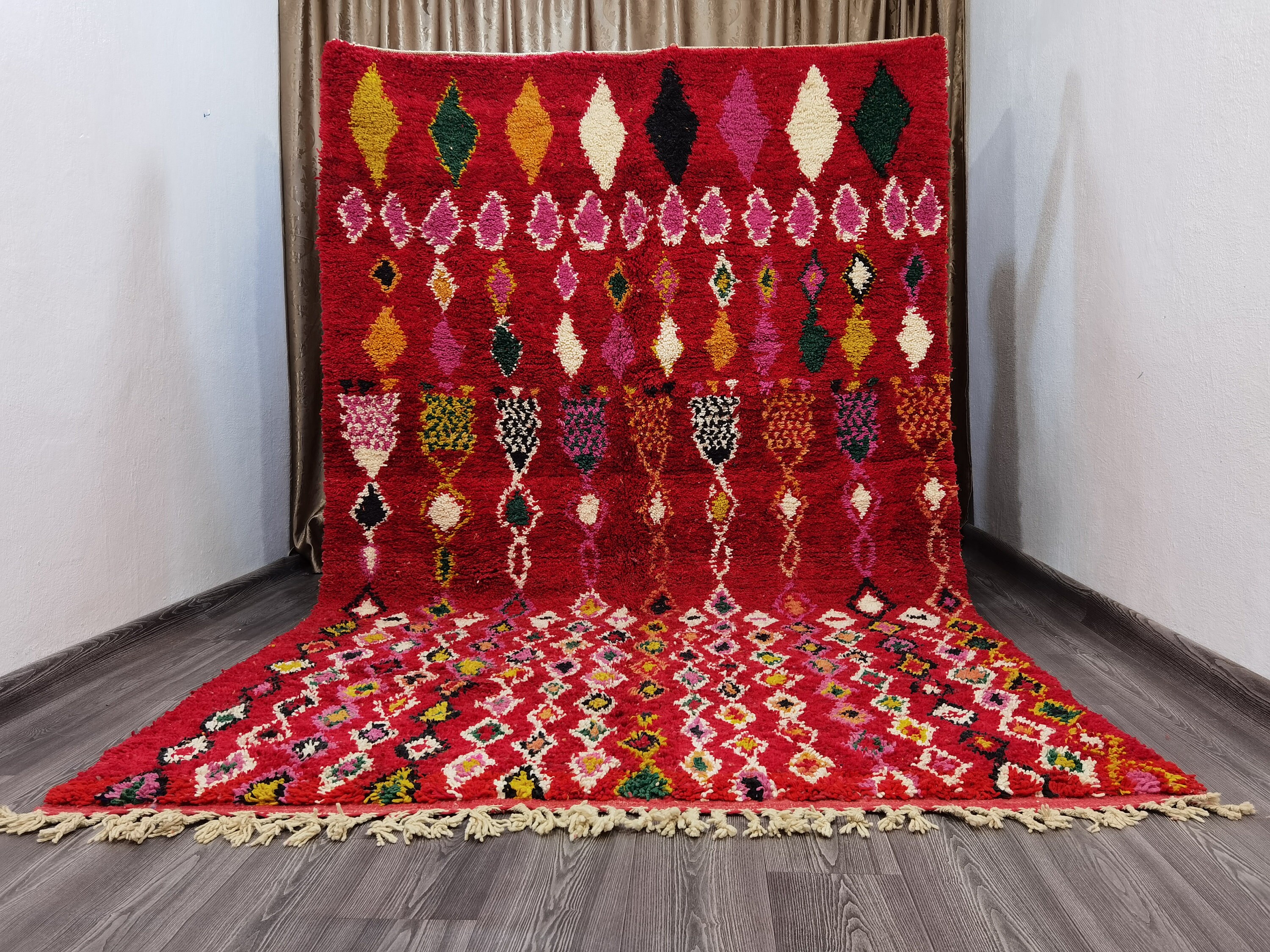 This unique Handwoven Moroccan Boujaad wool rug is one of a kind. A unique rare artistic handmade art, a beautiful combination of colors. which makes it the best choice whether for your house or your showroom. The famous Boujaad rug is now on the cover of the world’s leading home decoration magazines. This rug with character goes perfectly with all interior styles, Bohemian, Modern, Minimalist, Scandinavian, Traditional, which makes it the best choice for your needs.
