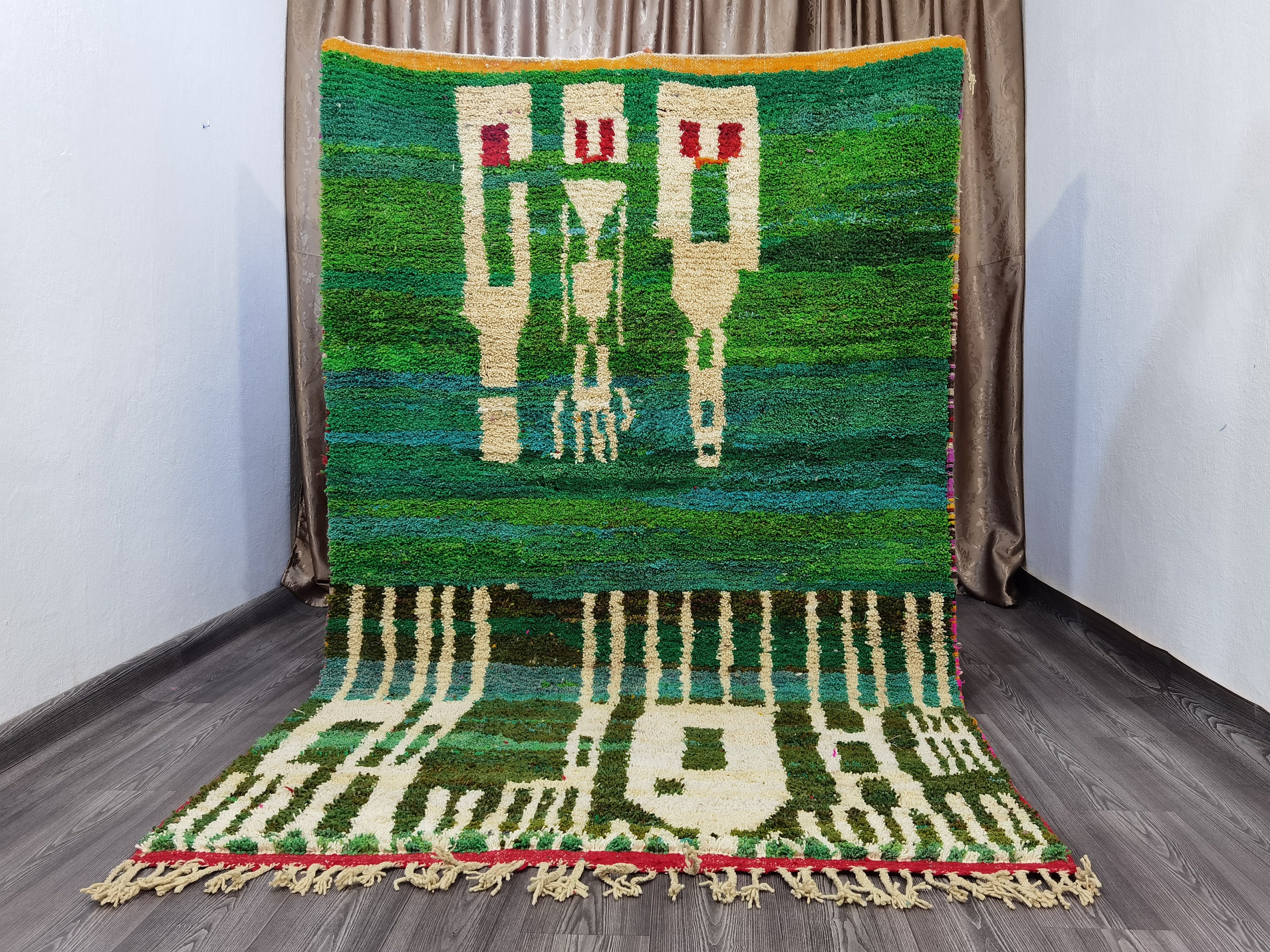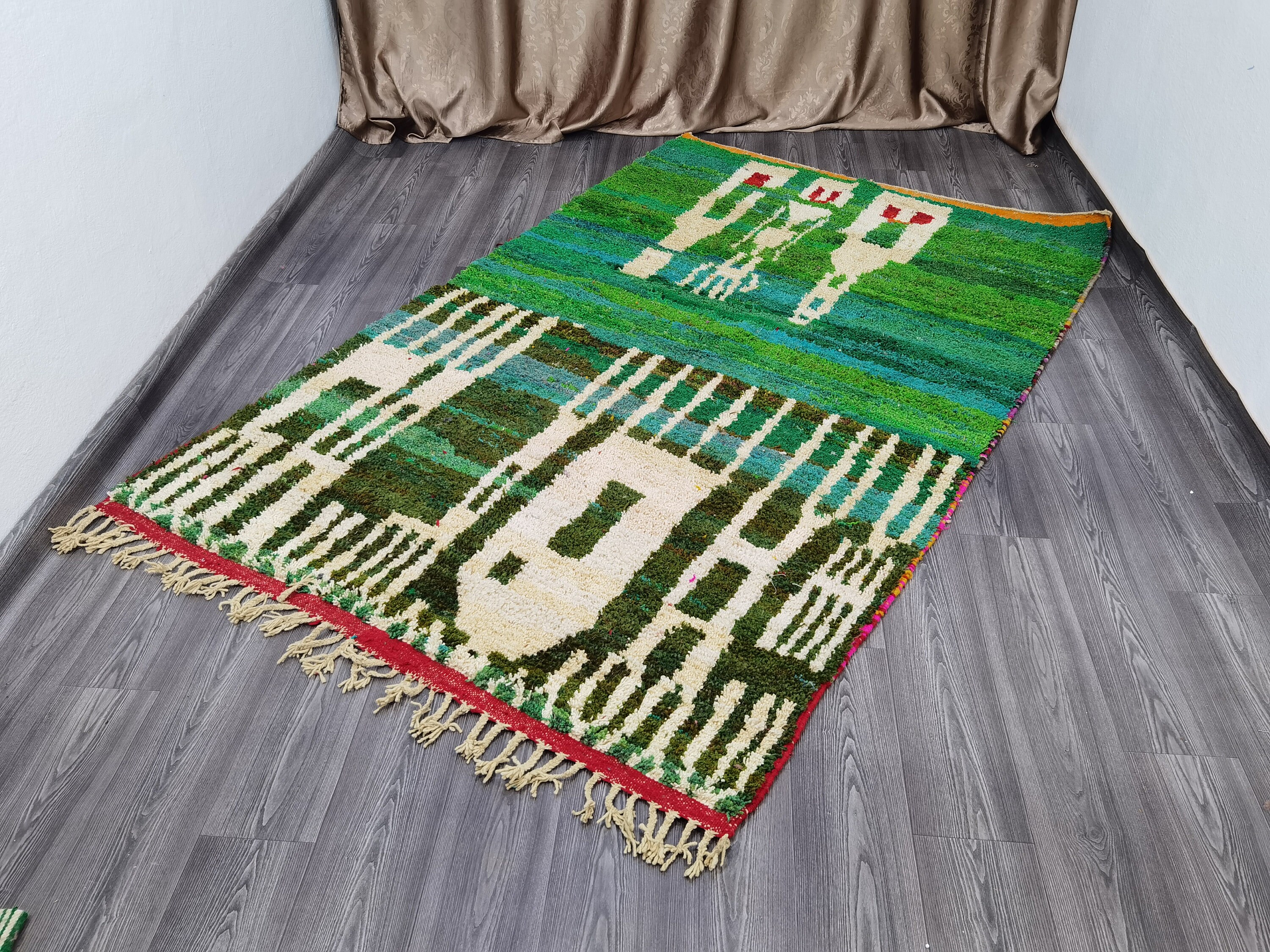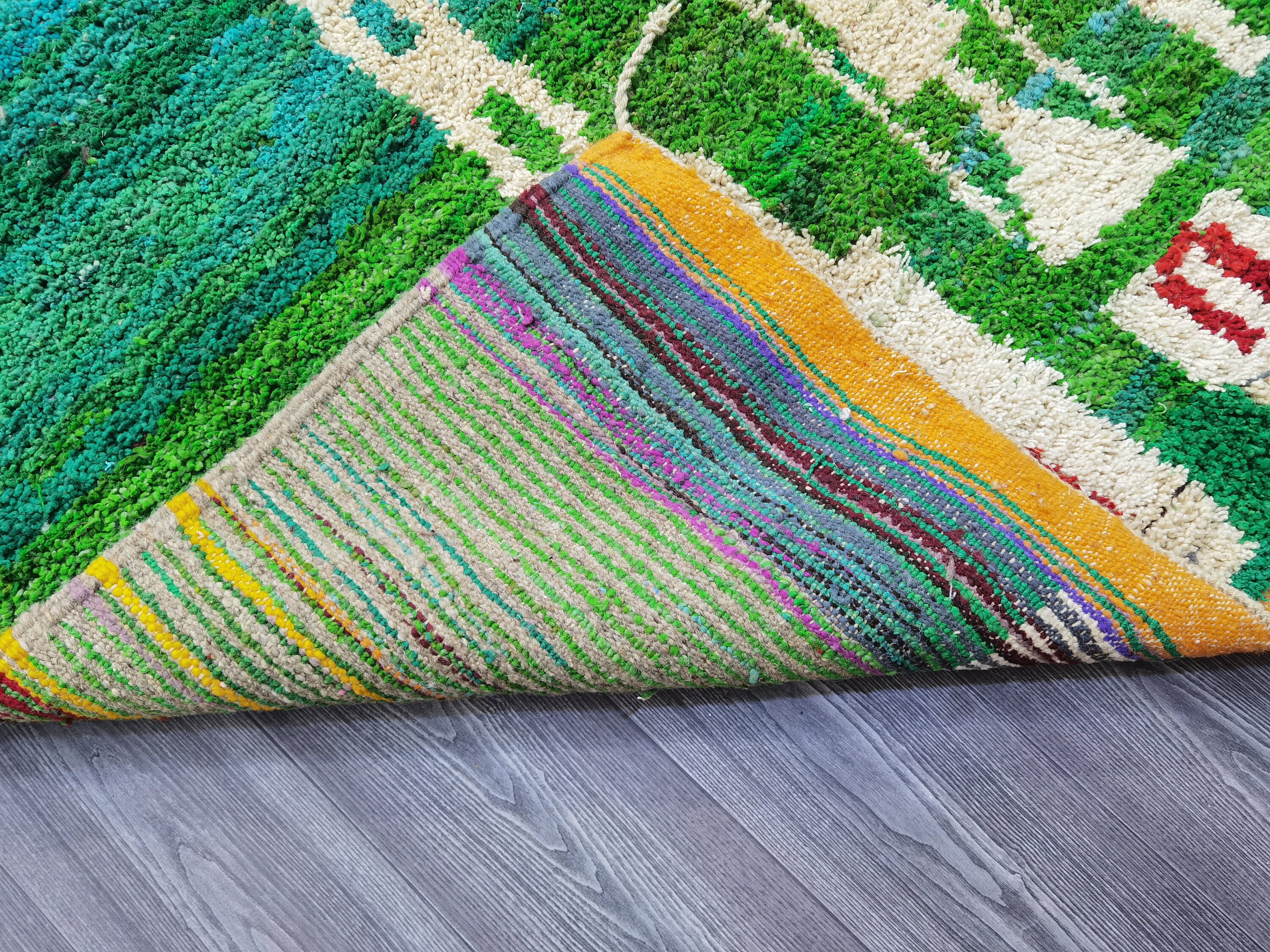 This unique Handwoven Moroccan Boujaad wool rug is one of a kind. A unique rare artistic handmade art, a beautiful combination of colors. which makes it the best choice whether for your house or your showroom. The famous Boujaad rug is now on the cover of the world’s leading home decoration magazines. This rug with character goes perfectly with all interior styles, Bohemian, Modern, Minimalist, Scandinavian, Traditional, which makes it the best choice for your needs.