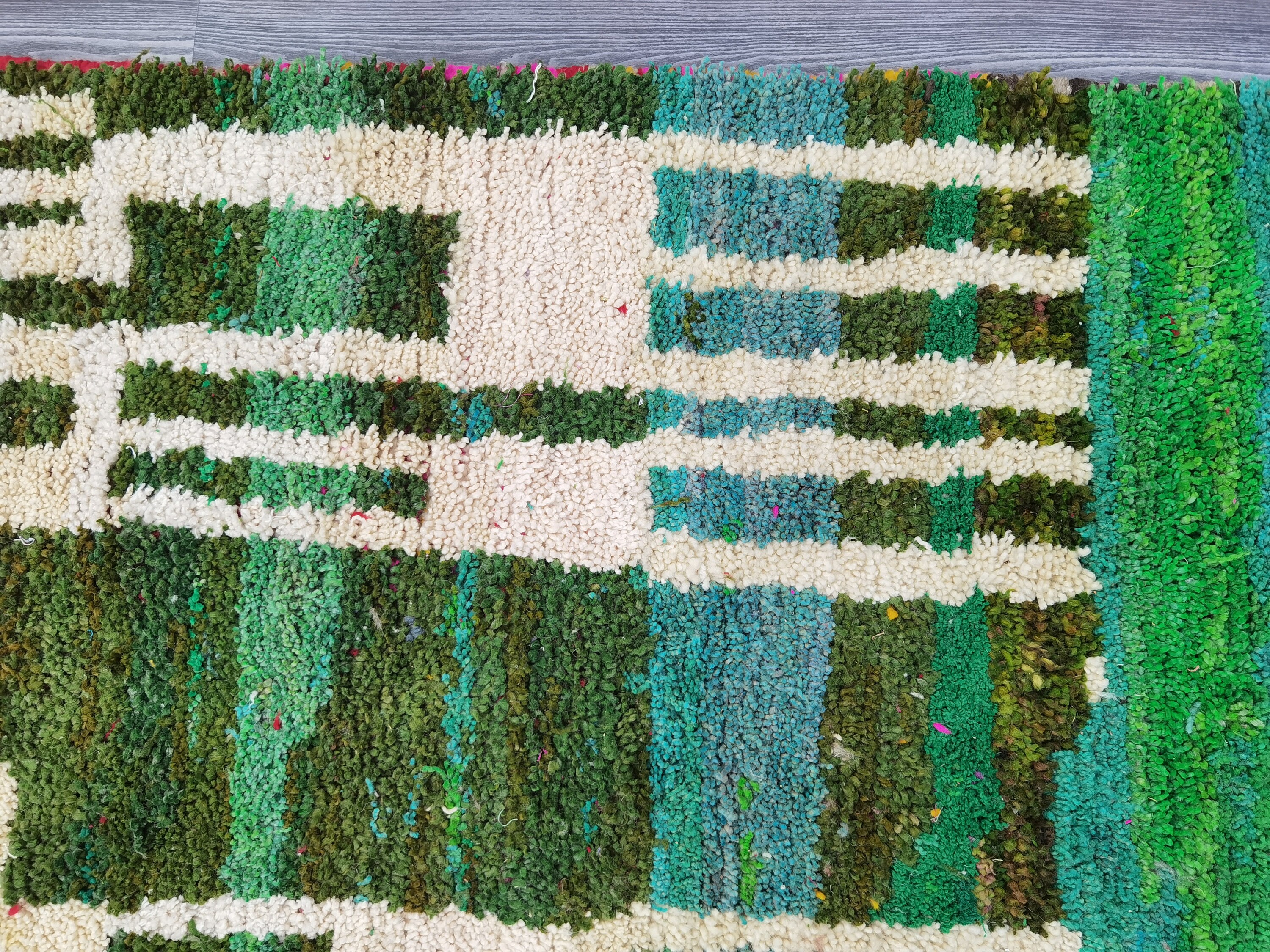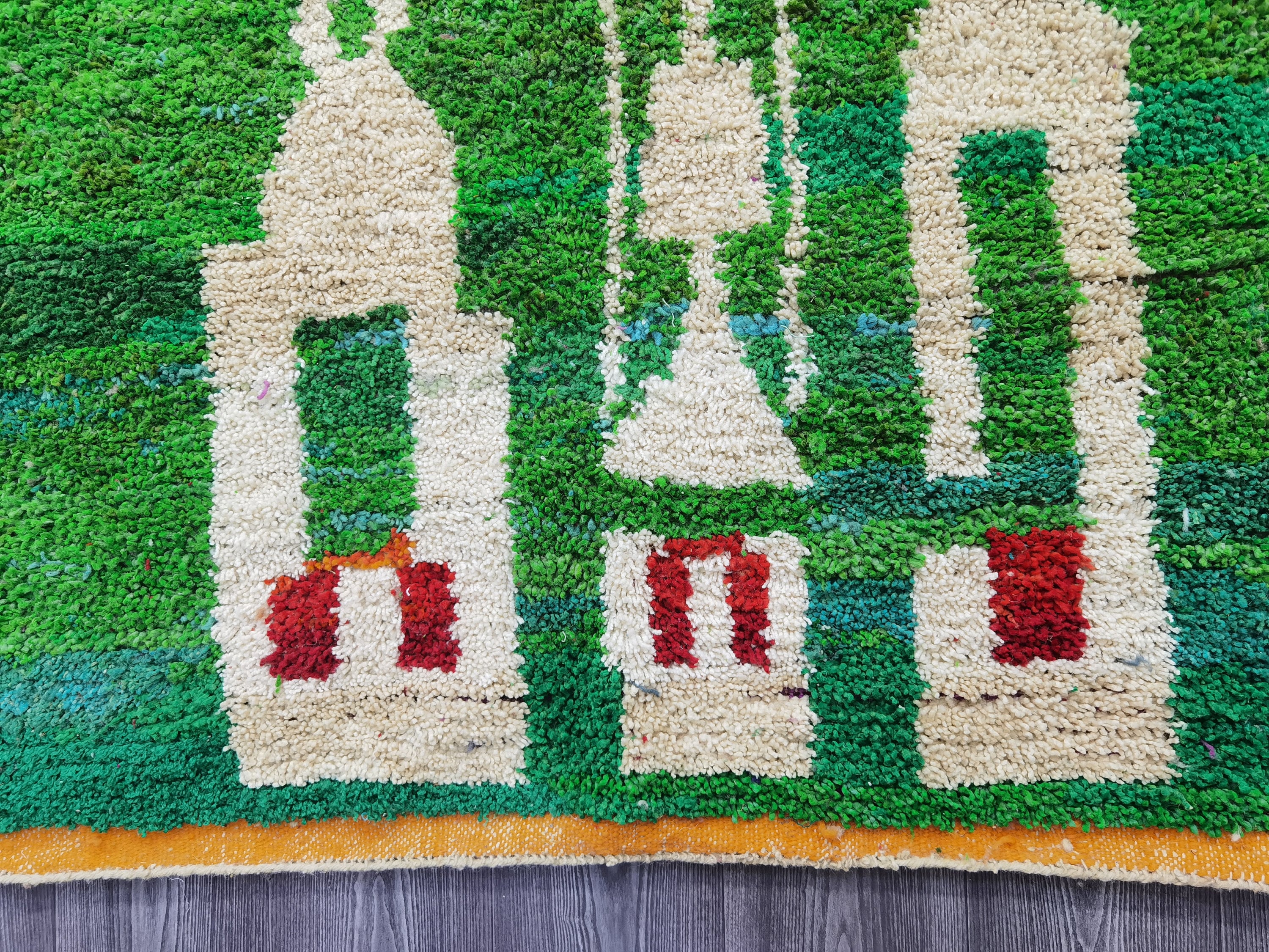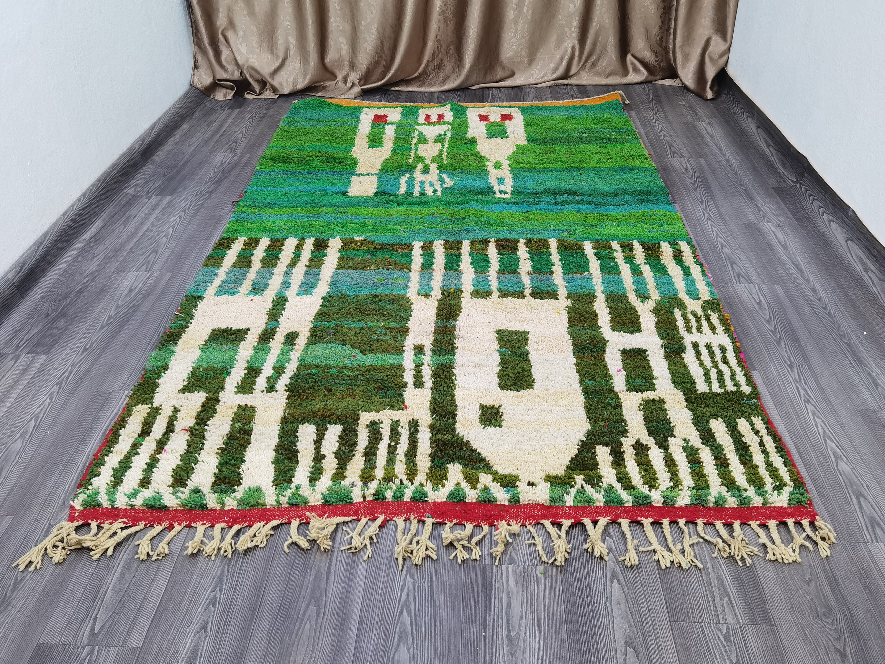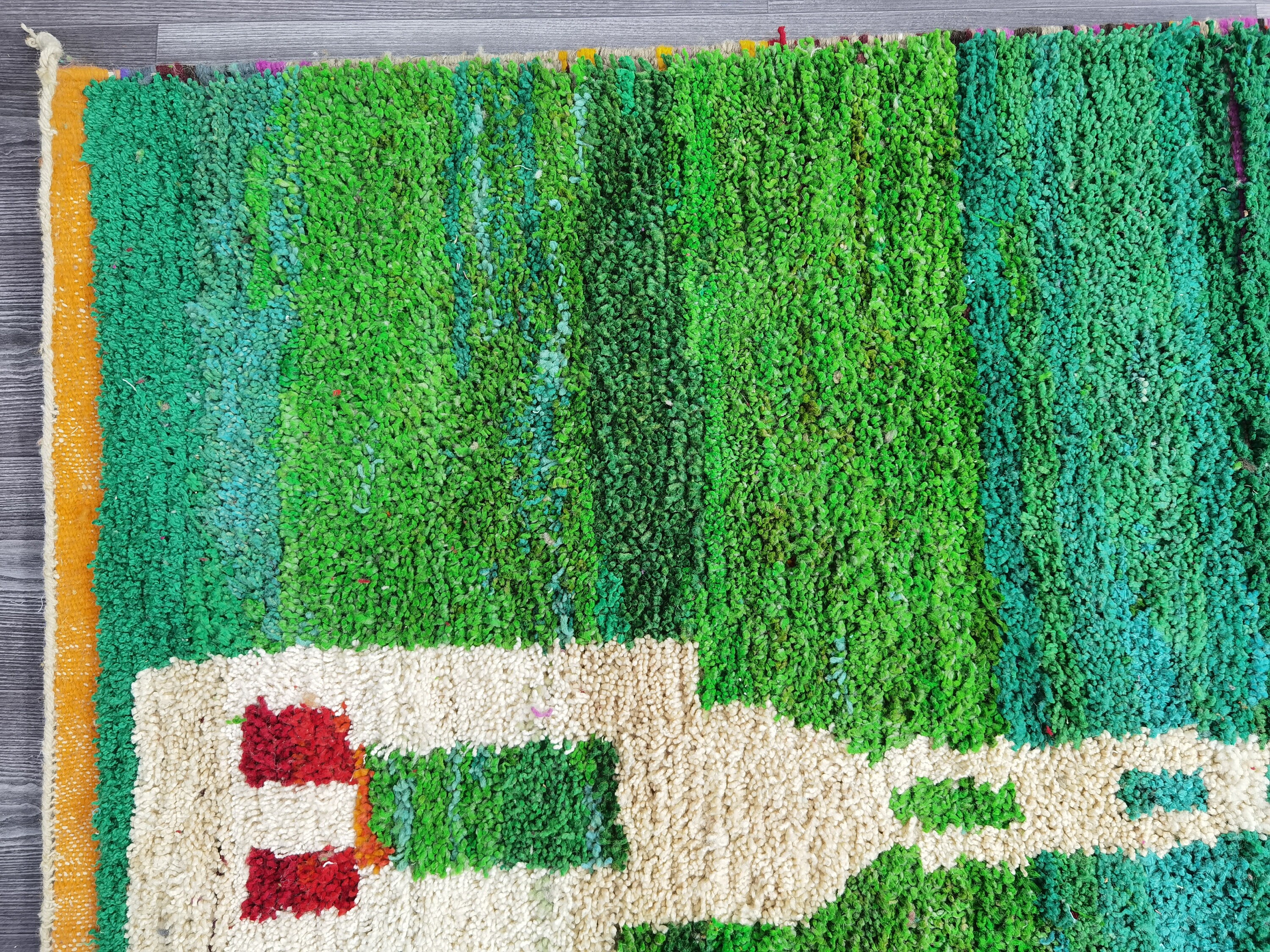 This unique Handwoven Moroccan Boujaad wool rug is one of a kind. A unique rare artistic handmade art, a beautiful combination of colors. which makes it the best choice whether for your house or your showroom. The famous Boujaad rug is now on the cover of the world’s leading home decoration magazines. This rug with character goes perfectly with all interior styles, Bohemian, Modern, Minimalist, Scandinavian, Traditional, which makes it the best choice for your needs.