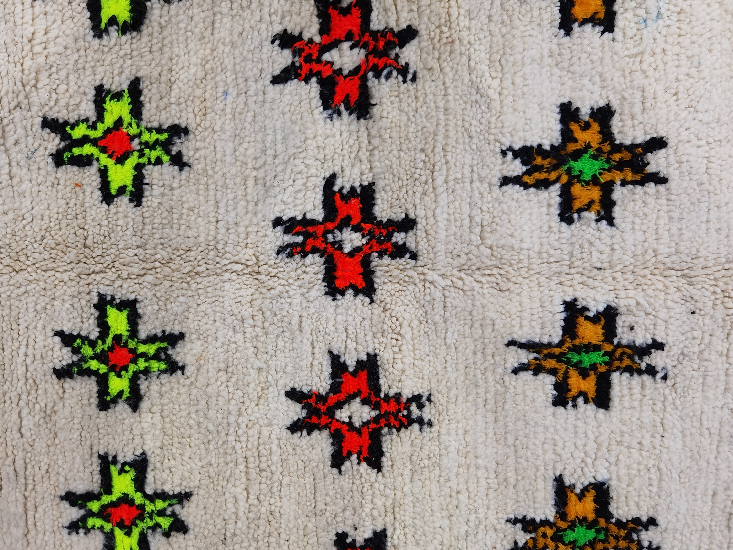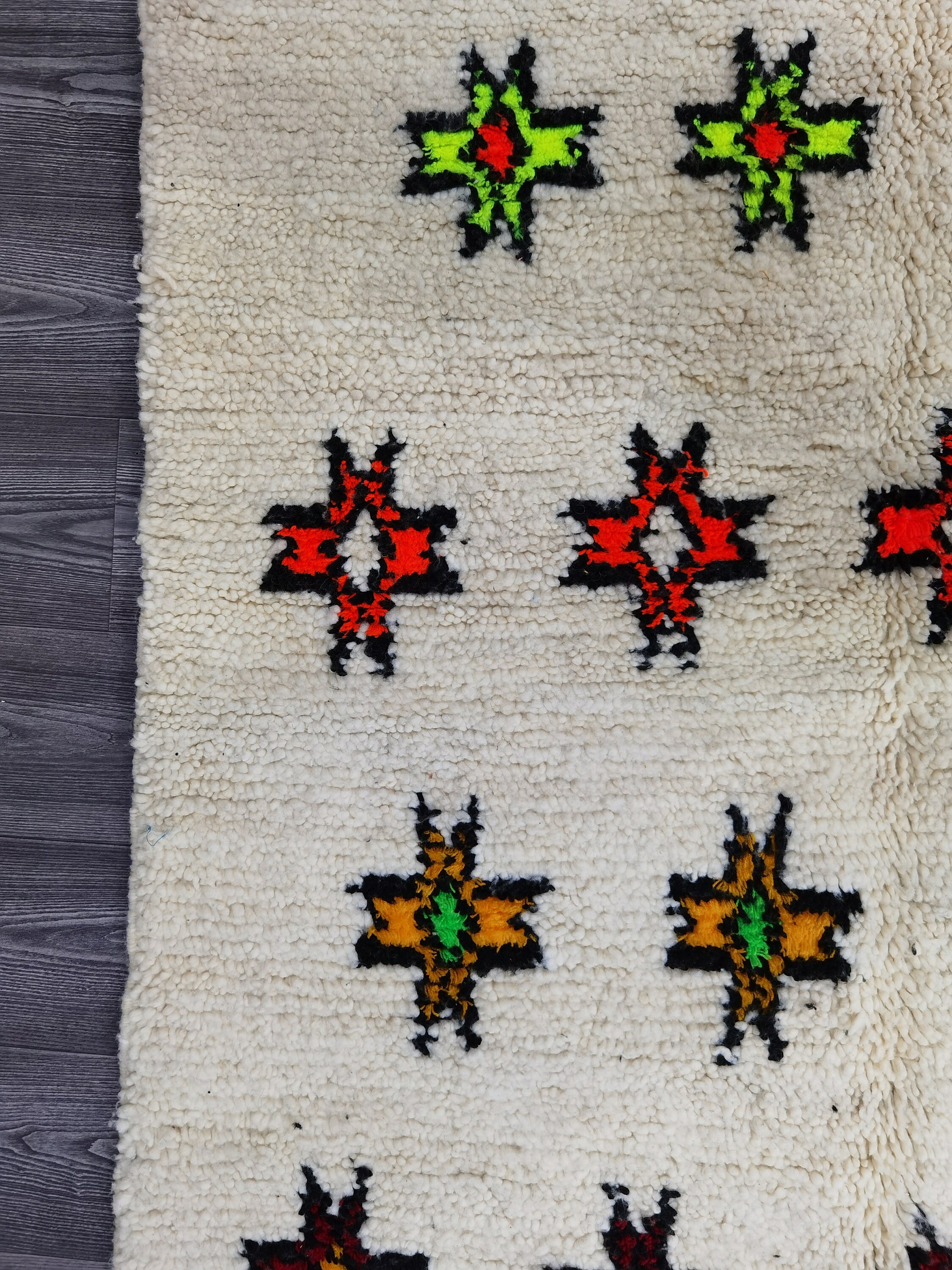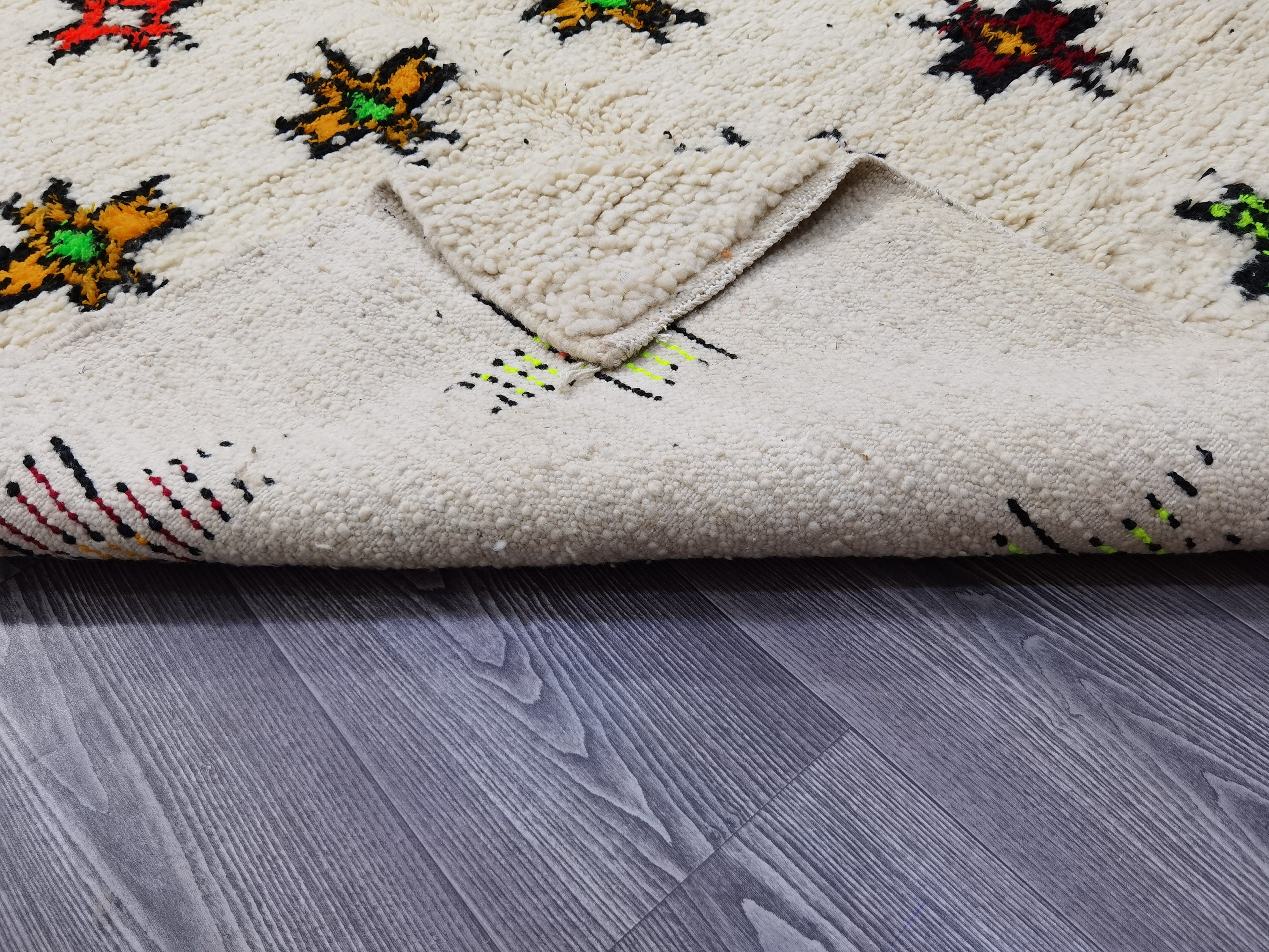 This unique Handwoven Moroccan Boujaad wool rug is one of a kind. A unique rare artistic handmade art, a beautiful combination of colors. which makes it the best choice whether for your house or your showroom. The famous Boujaad rug is now on the cover of the world’s leading home decoration magazines. This rug with character goes perfectly with all interior styles, Bohemian, Modern, Minimalist, Scandinavian, Traditional, which makes it the best choice for your needs.