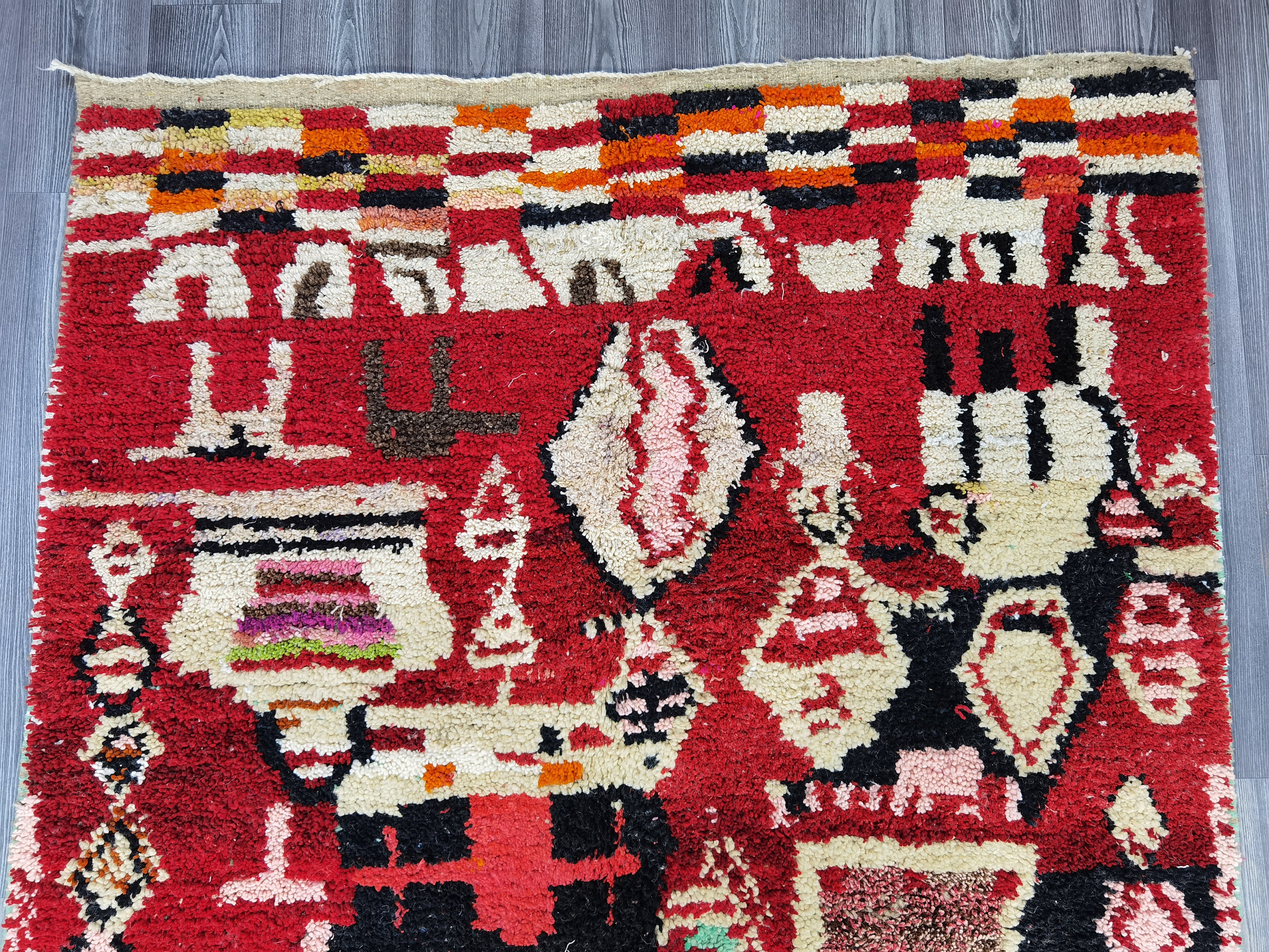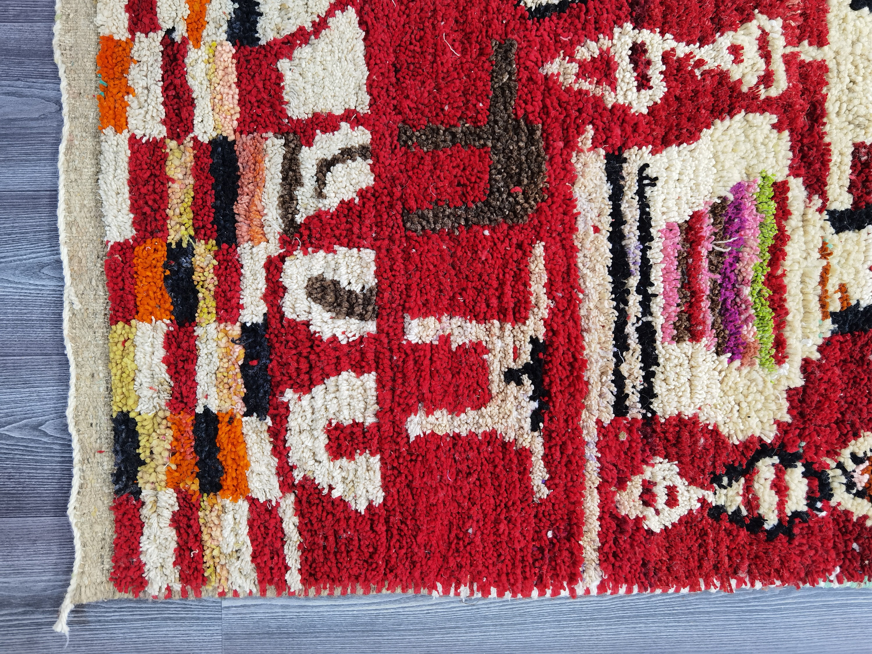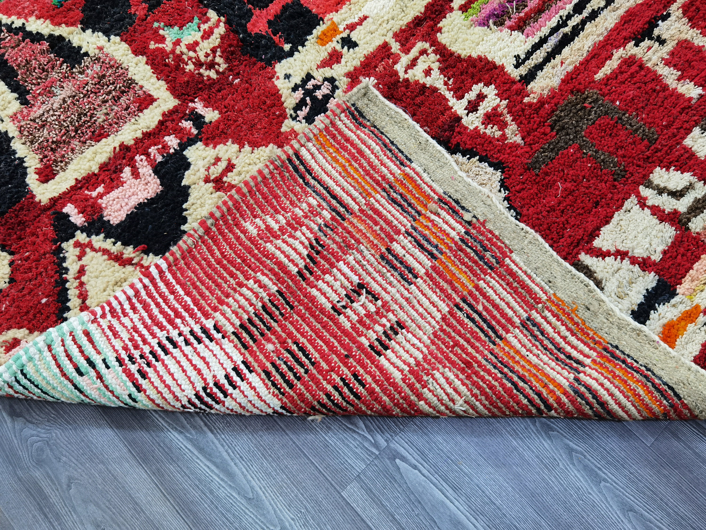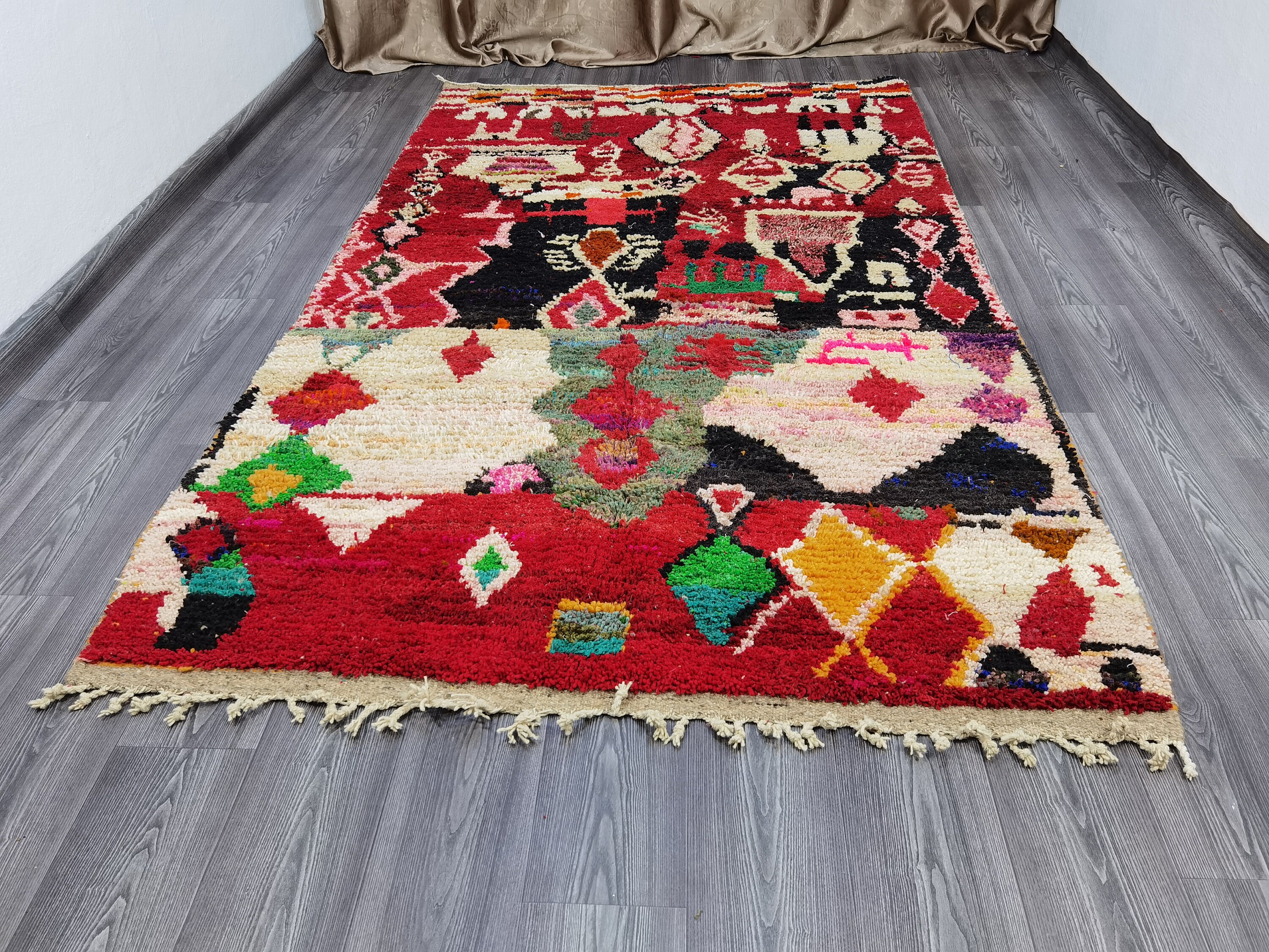 This unique Handwoven Moroccan Boujaad wool rug is one of a kind. A unique rare artistic handmade art, a beautiful combination of colors. which makes it the best choice whether for your house or your showroom. The famous Boujaad rug is now on the cover of the world’s leading home decoration magazines. This rug with character goes perfectly with all interior styles, Bohemian, Modern, Minimalist, Scandinavian, Traditional, which makes it the best choice for your needs.