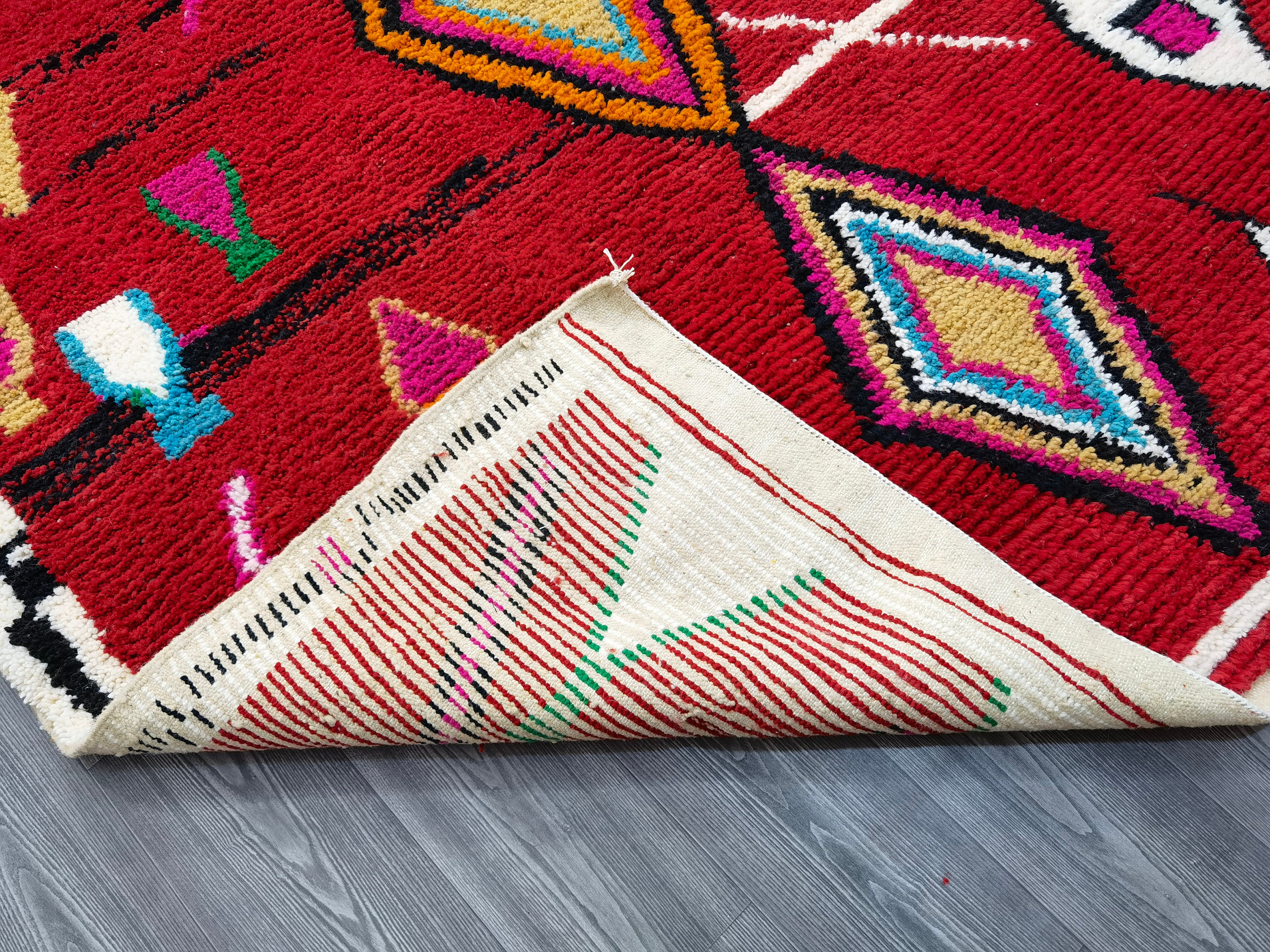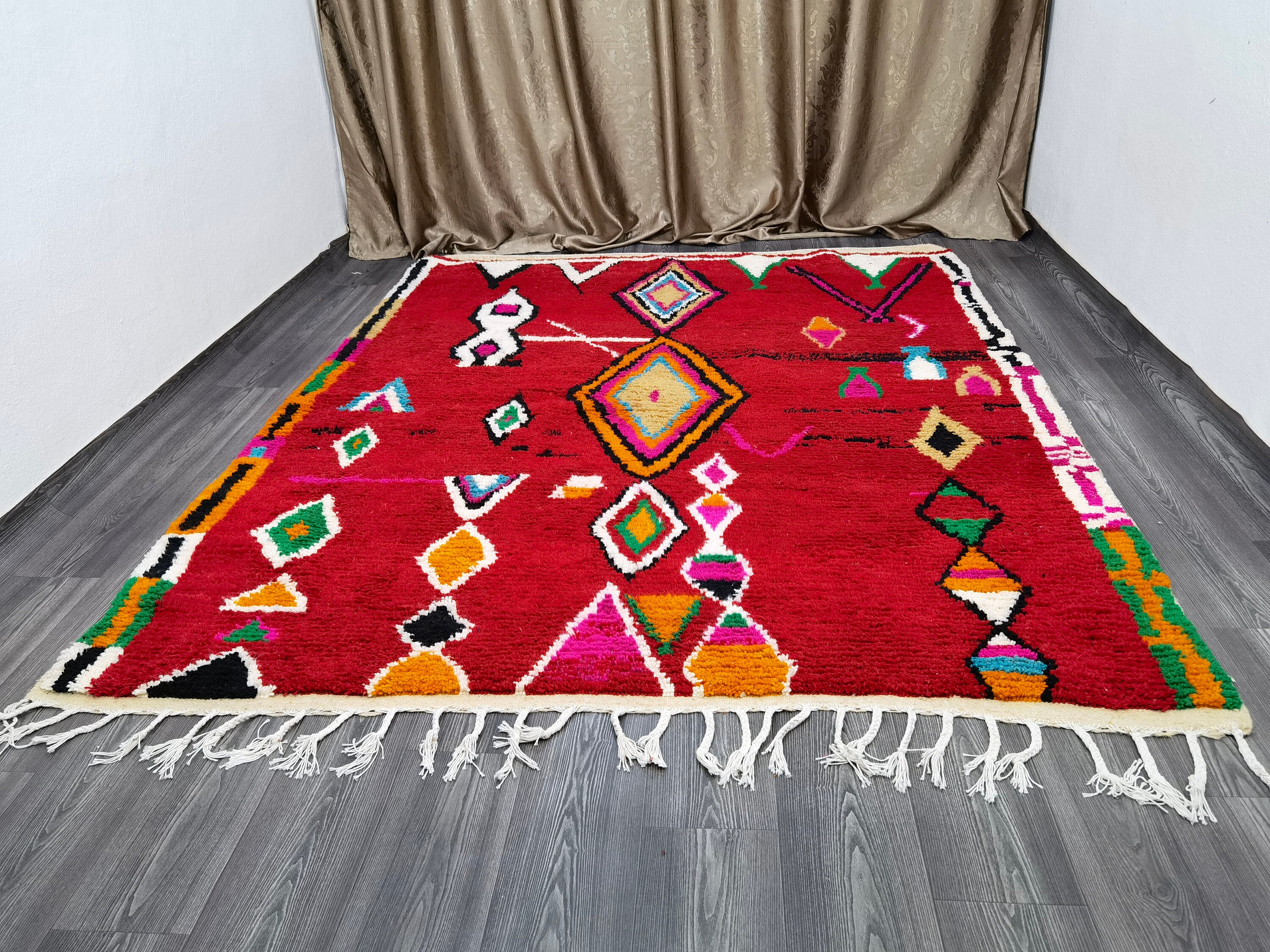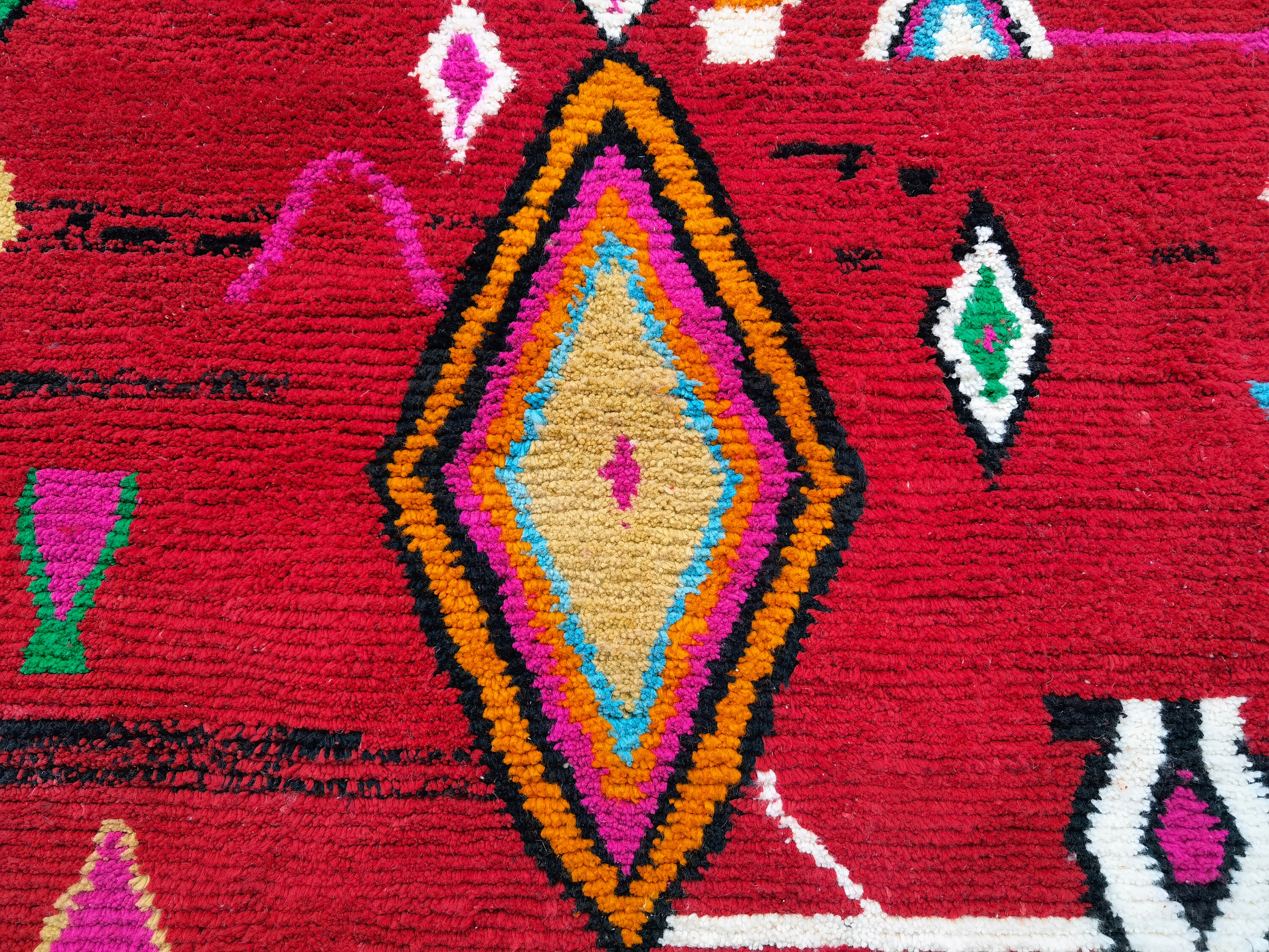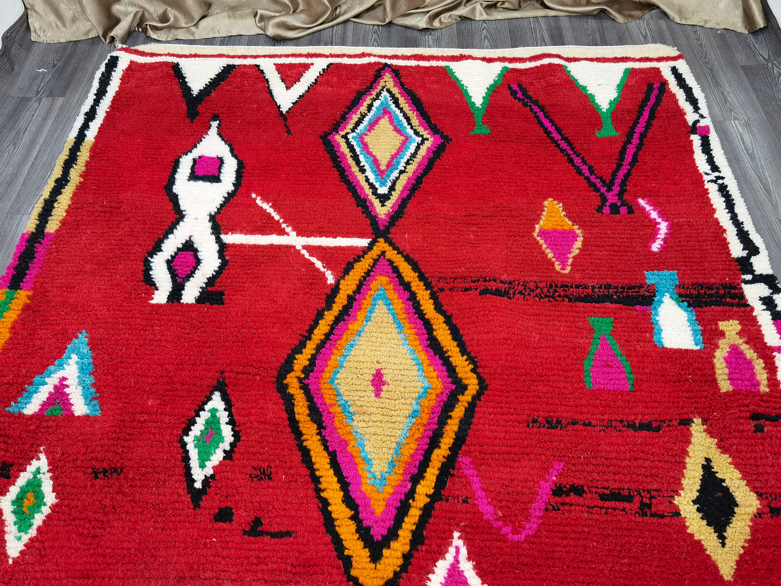 This unique Handwoven Moroccan Boujaad wool rug is one of a kind. A unique rare artistic handmade art, a beautiful combination of colors. which makes it the best choice whether for your house or your showroom. The famous Boujaad rug is now on the cover of the world’s leading home decoration magazines. This rug with character goes perfectly with all interior styles, Bohemian, Modern, Minimalist, Scandinavian, Traditional, which makes it the best choice for your needs.