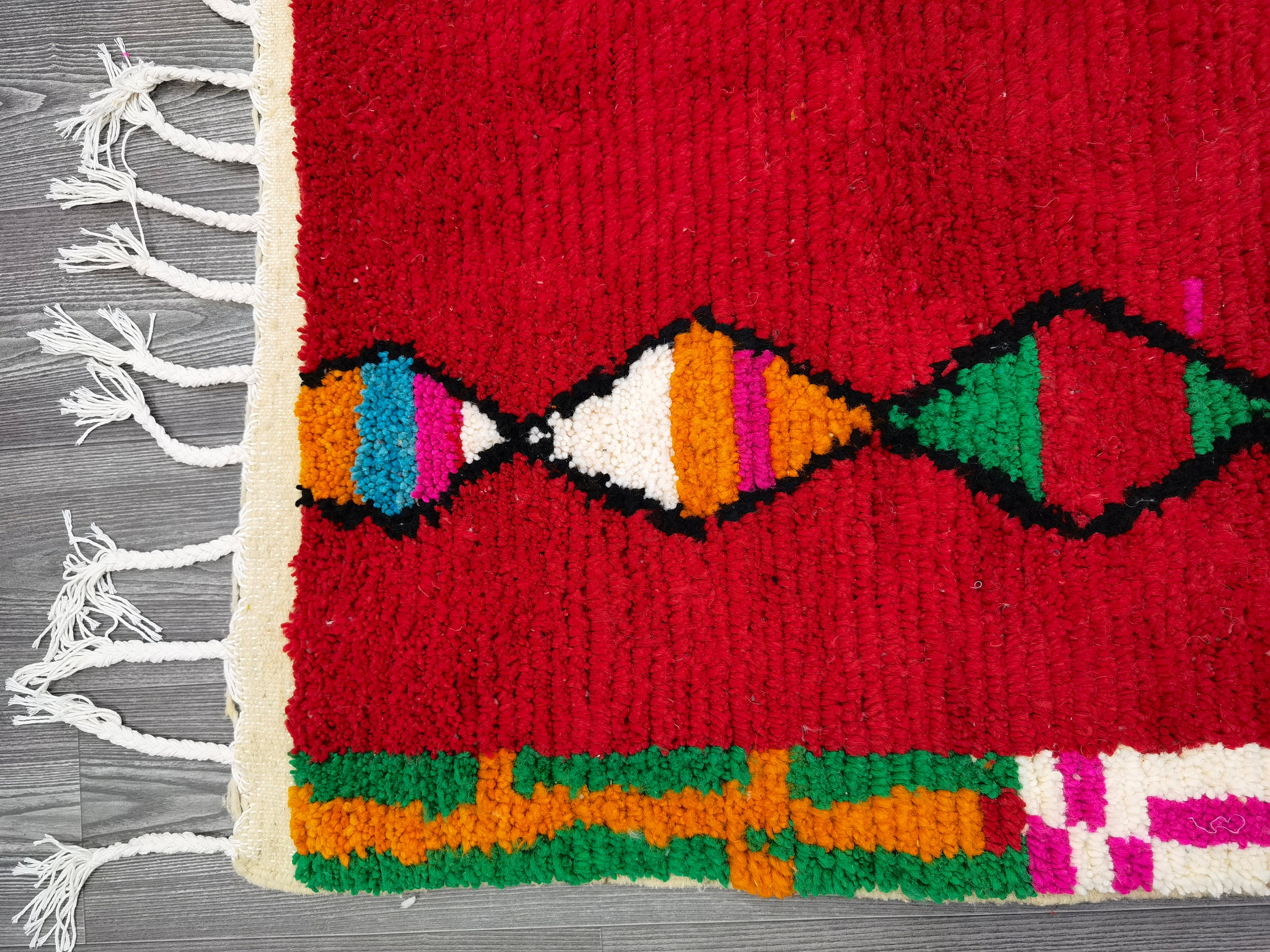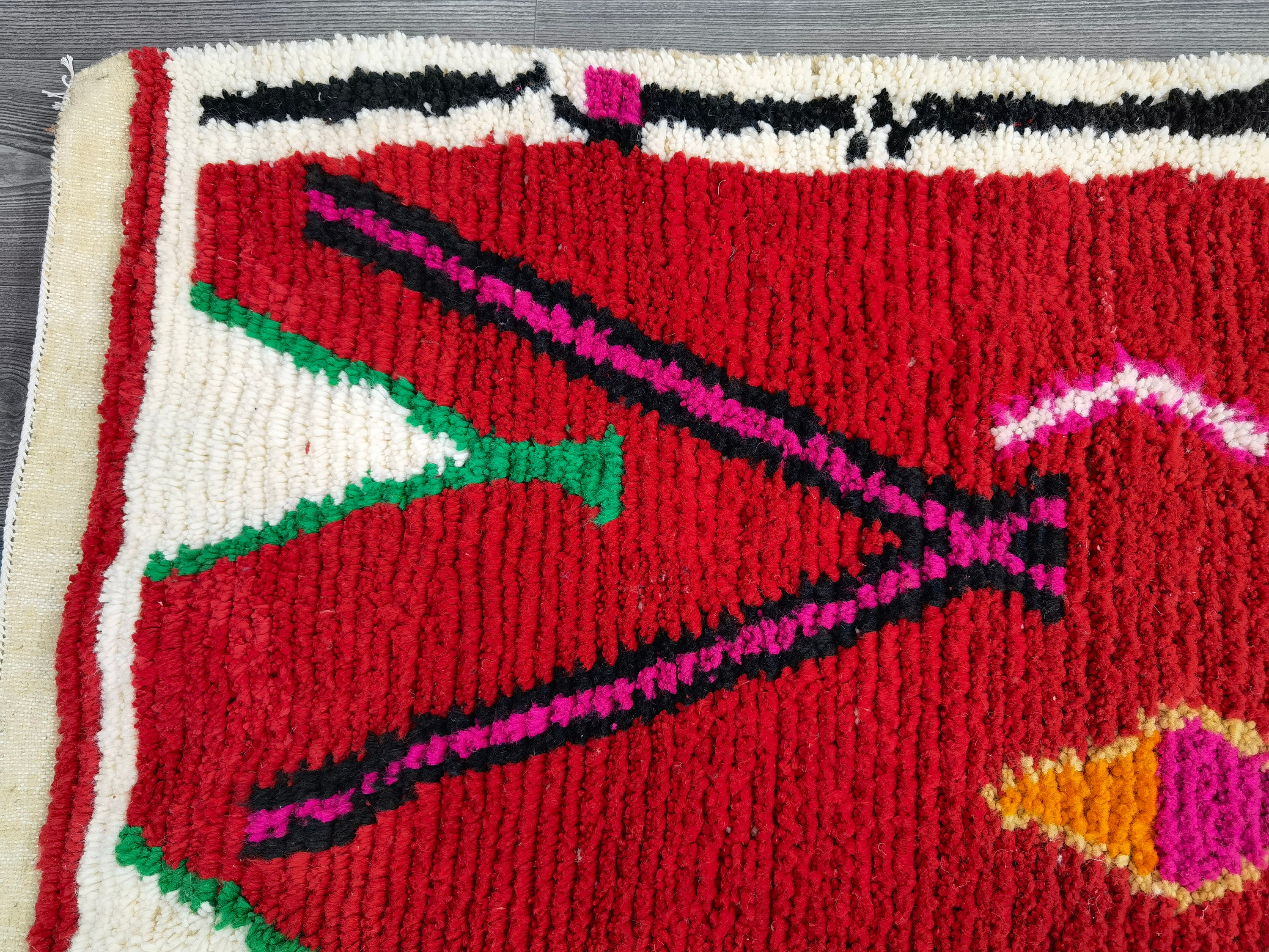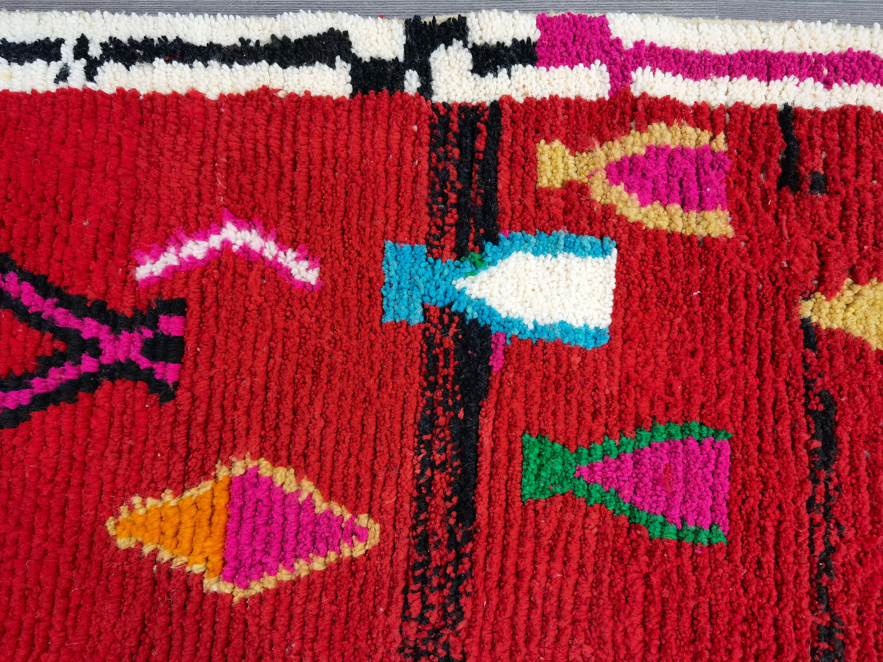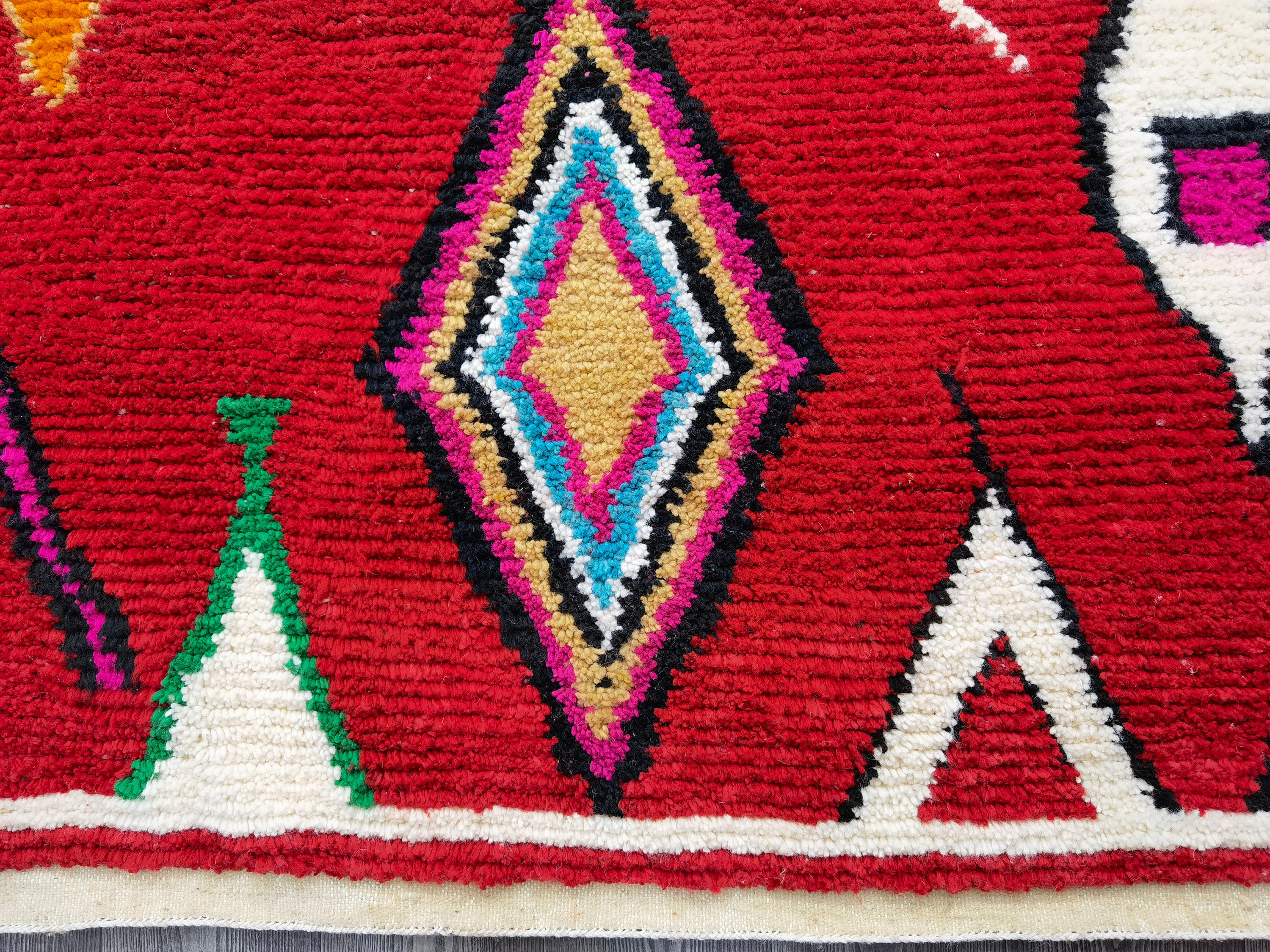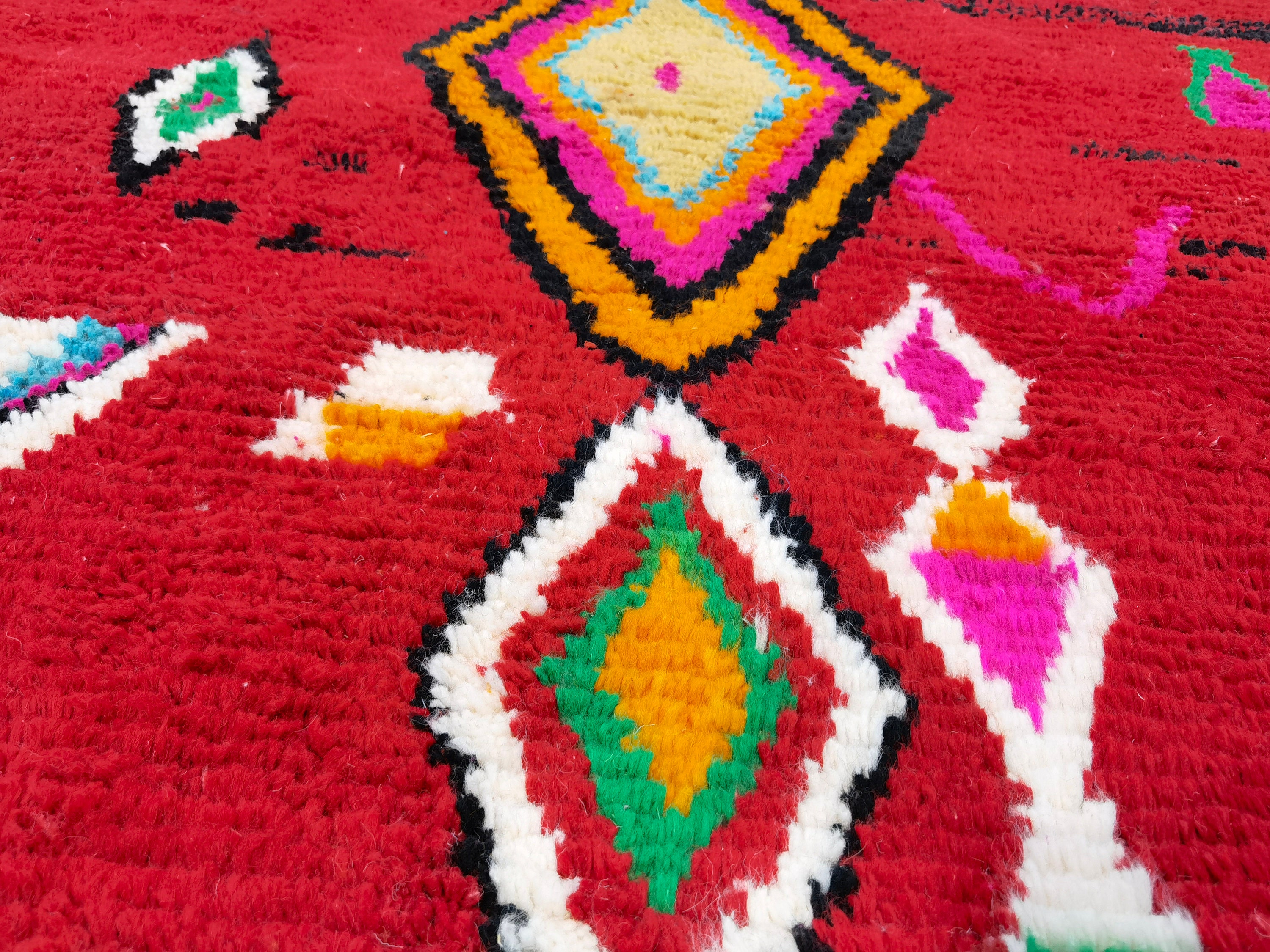 This unique Handwoven Moroccan Boujaad wool rug is one of a kind. A unique rare artistic handmade art, a beautiful combination of colors. which makes it the best choice whether for your house or your showroom. The famous Boujaad rug is now on the cover of the world’s leading home decoration magazines. This rug with character goes perfectly with all interior styles, Bohemian, Modern, Minimalist, Scandinavian, Traditional, which makes it the best choice for your needs.