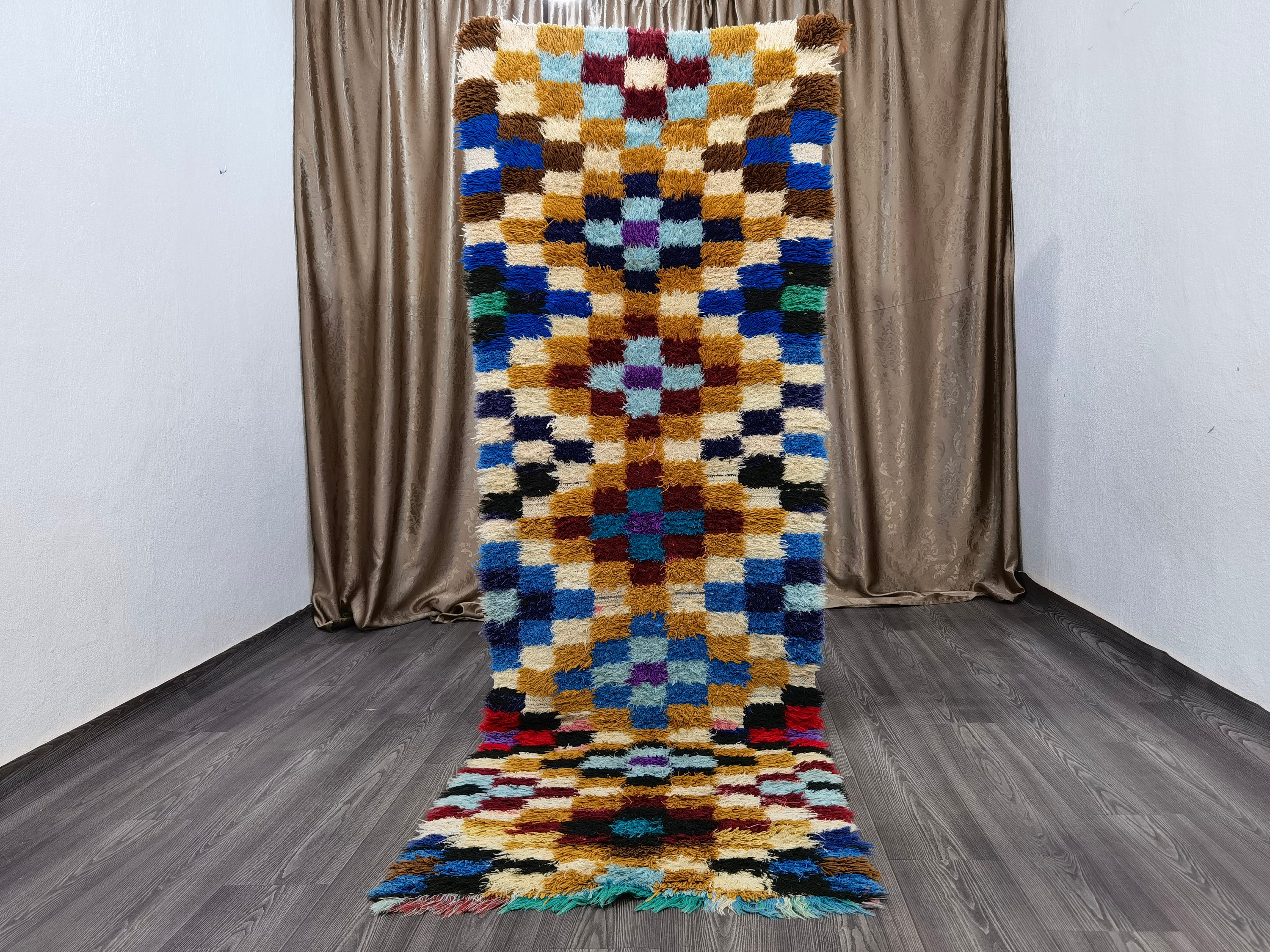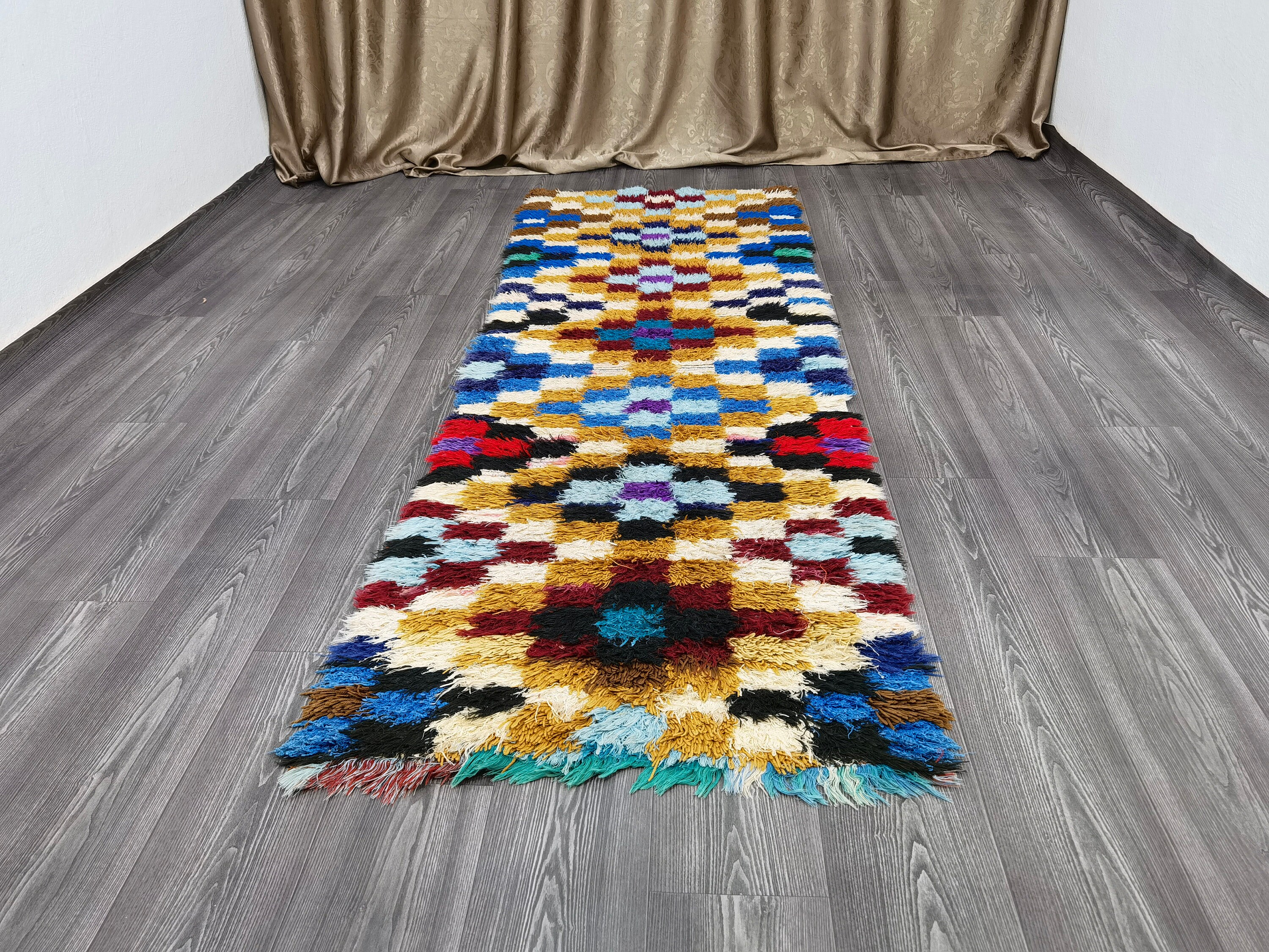 This unique Handwoven Moroccan Boujaad wool rug is one of a kind. A unique rare artistic handmade art, a beautiful combination of colors. which makes it the best choice whether for your house or your showroom. The famous Boujaad rug is now on the cover of the world’s leading home decoration magazines. This rug with character goes perfectly with all interior styles, Bohemian, Modern, Minimalist, Scandinavian, Traditional, which makes it the best choice for your needs.