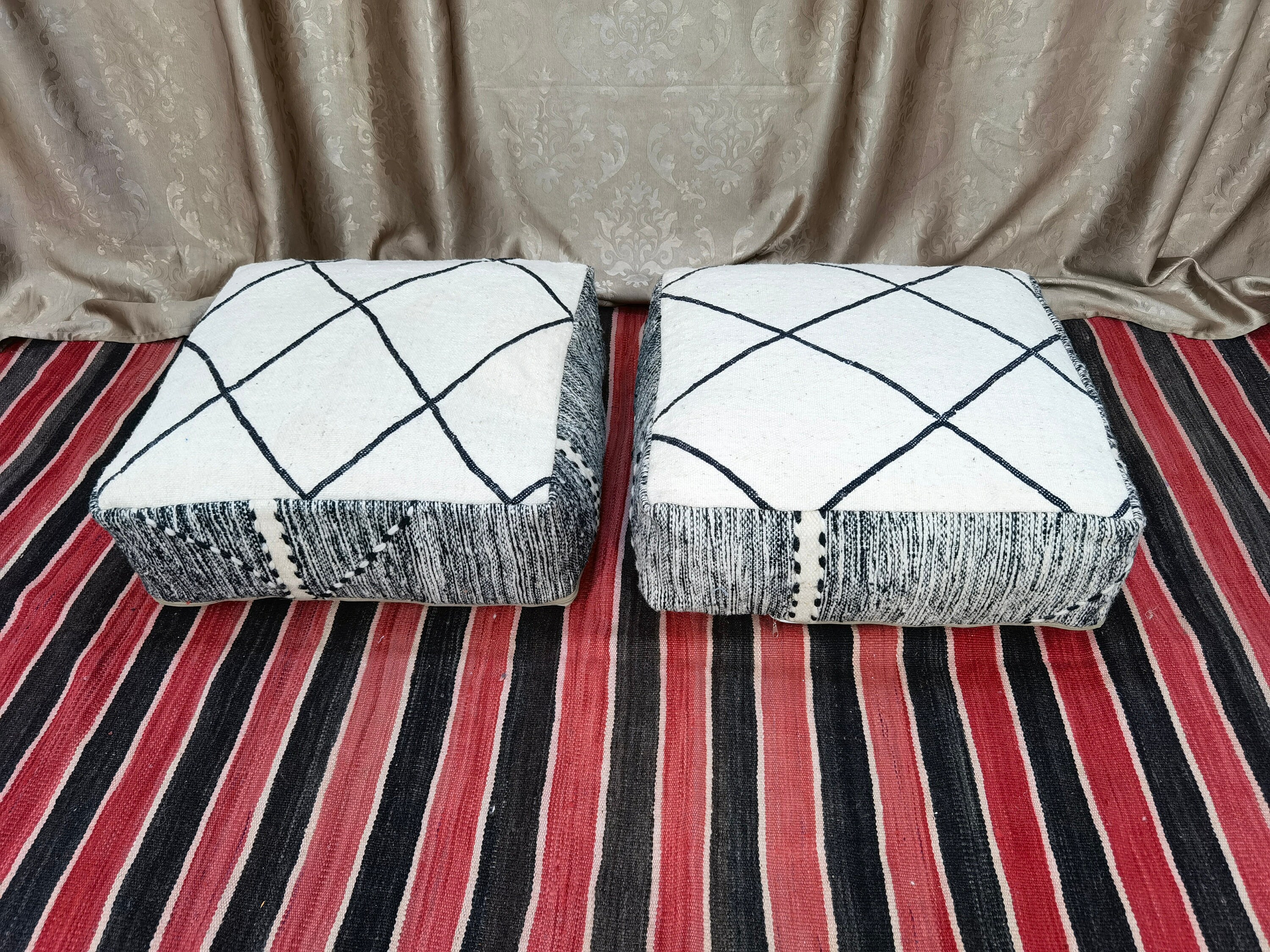 Handmade Wool Moroccan Floor Pouf: White & Black Cushion