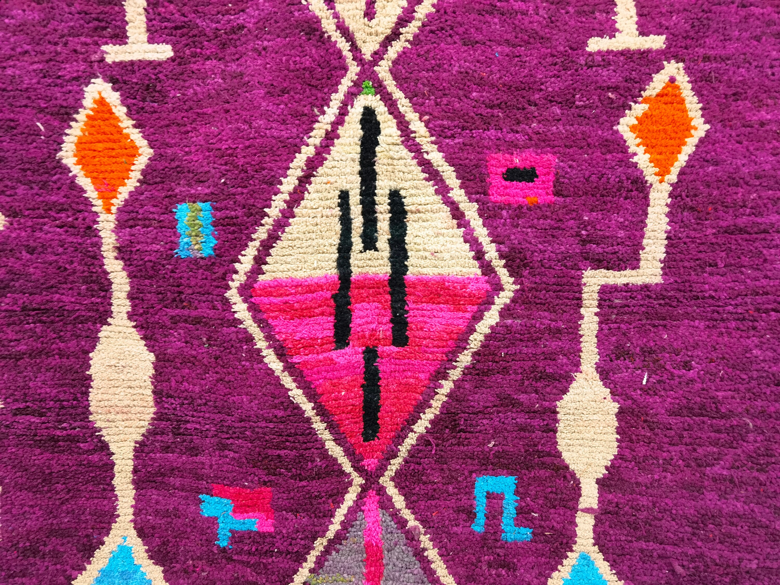 Immerse yourself in the stunning beauty of our Moroccan rug, expertly crafted from fuchsia pink and black Berber wool from the Beni Ourine tribe. Each thread tells a story of tradition and art.