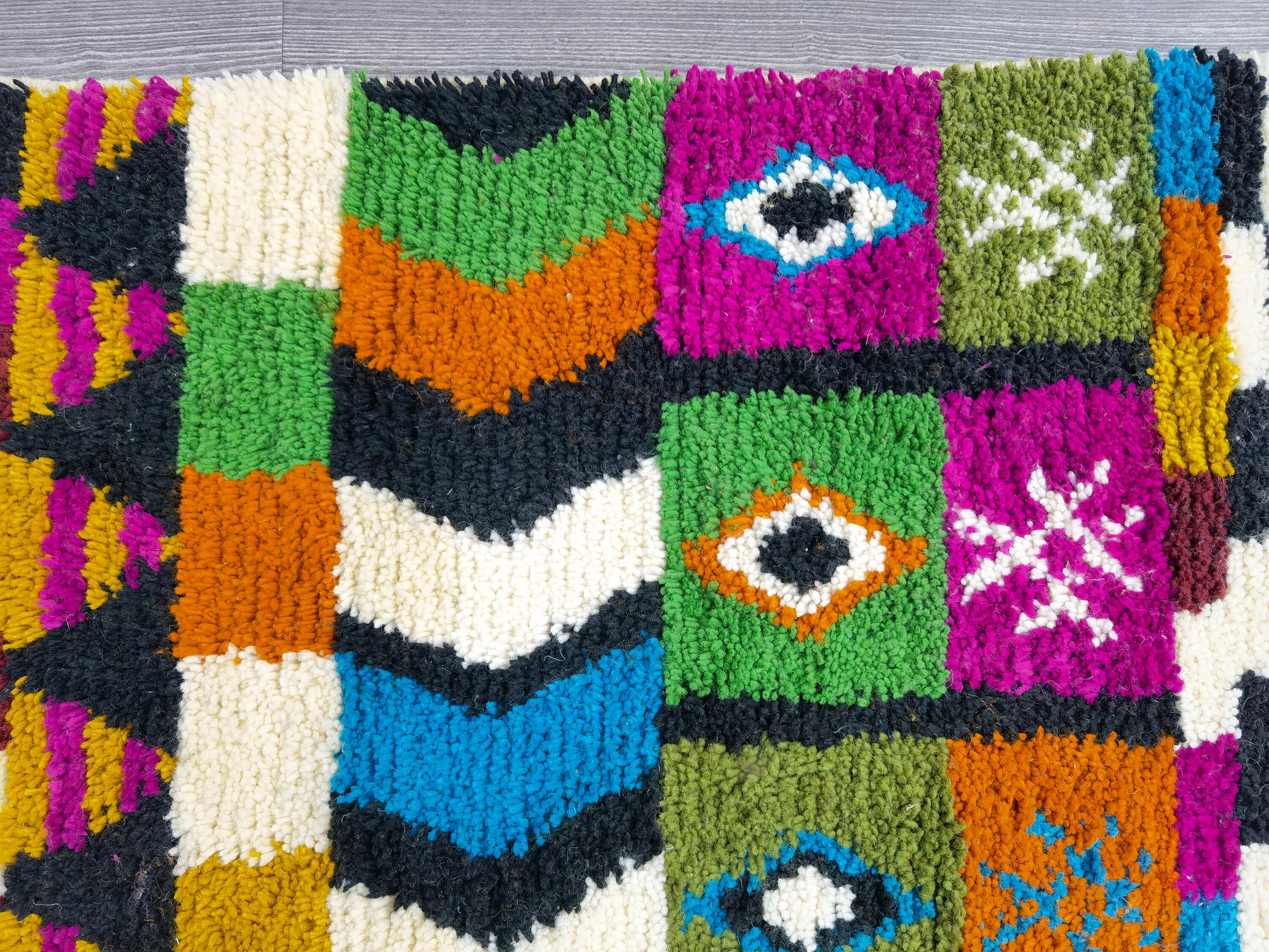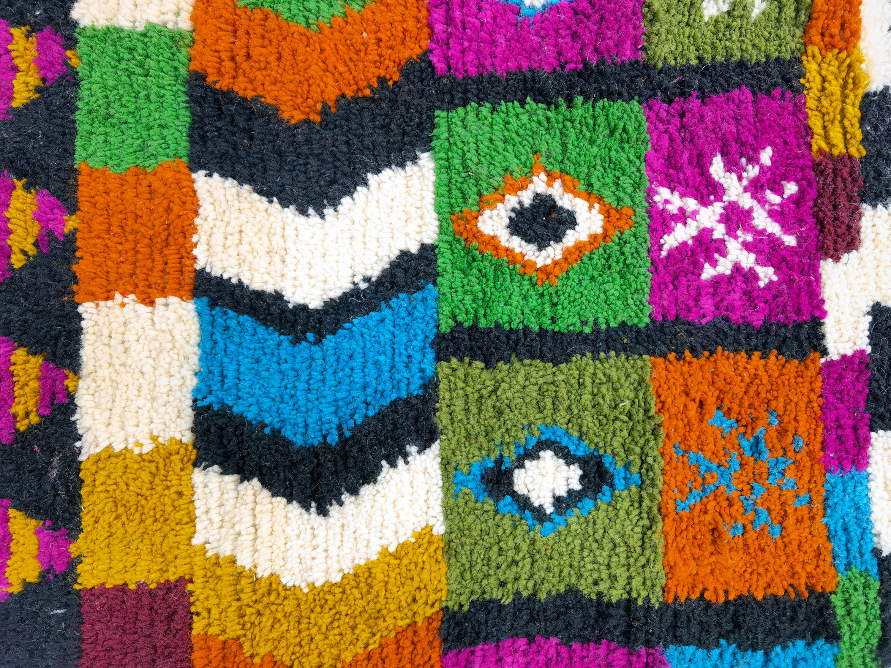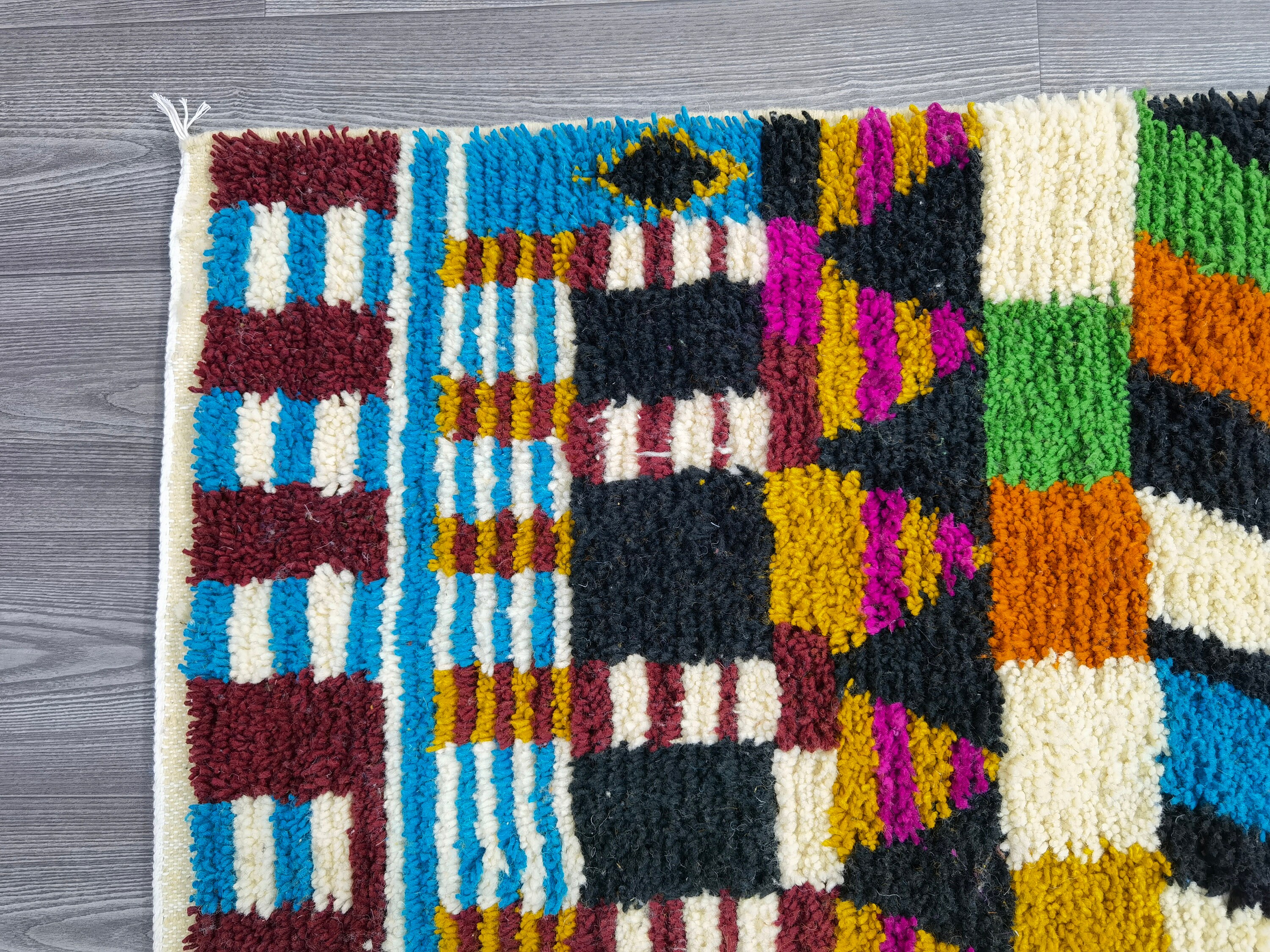 This unique Handwoven Moroccan Boujaad wool rug is one of a kind. A unique rare artistic handmade art, a beautiful combination of colors. which makes it the best choice whether for your house or your showroom. The famous Boujaad rug is now on the cover of the world’s leading home decoration magazines. This rug with character goes perfectly with all interior styles, Bohemian, Modern, Minimalist, Scandinavian, Traditional, which makes it the best choice for your needs.