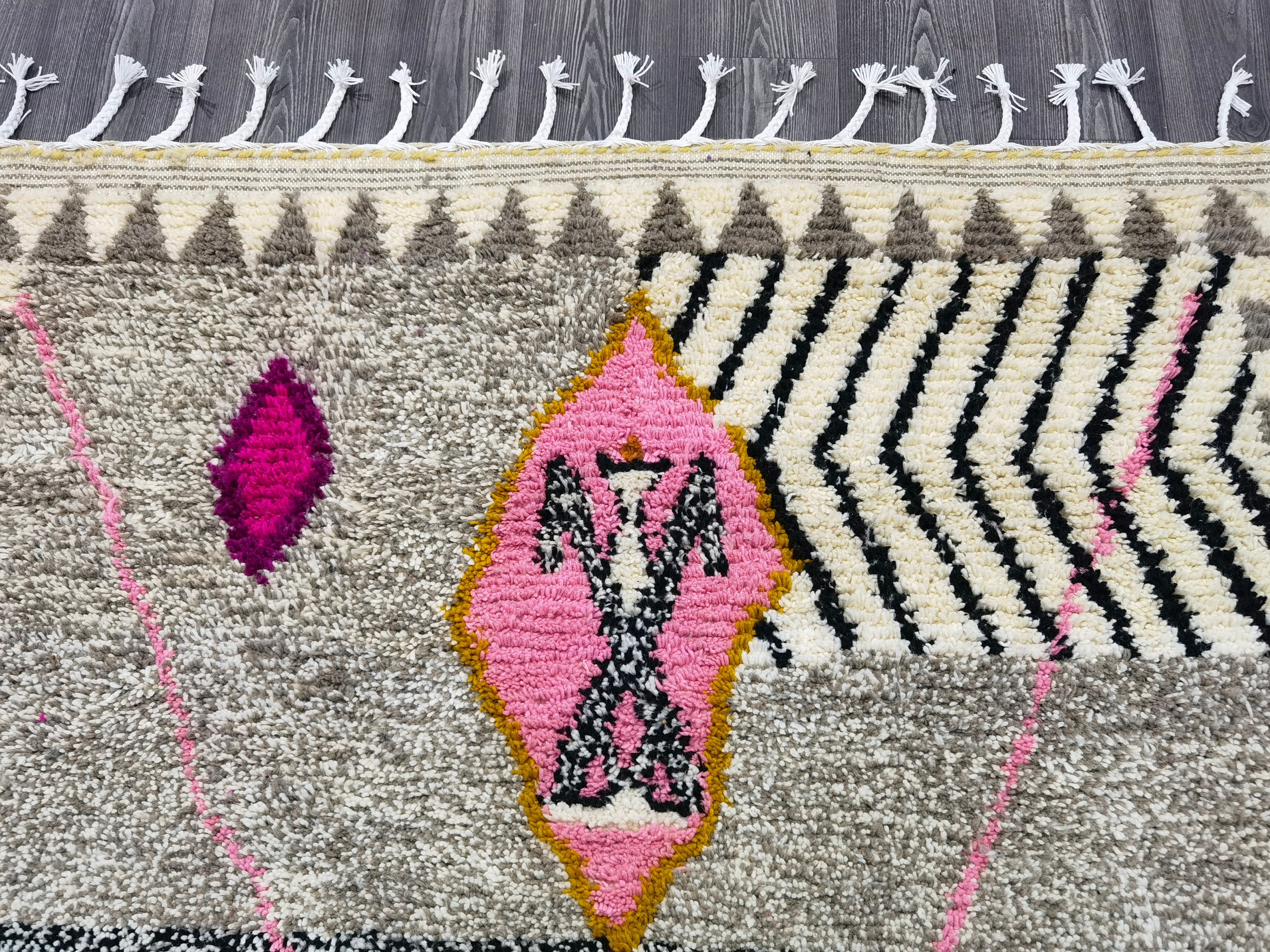 Step into the world of timeless elegance with our handcrafted Berber wool rug, a masterpiece woven by skilled artisans in the heart of the Atlas Mountains. This unique piece is a testament to the rich cultural heritage of the Ben Ourain tribe, where age-old weaving techniques are passed down from generation to generation.