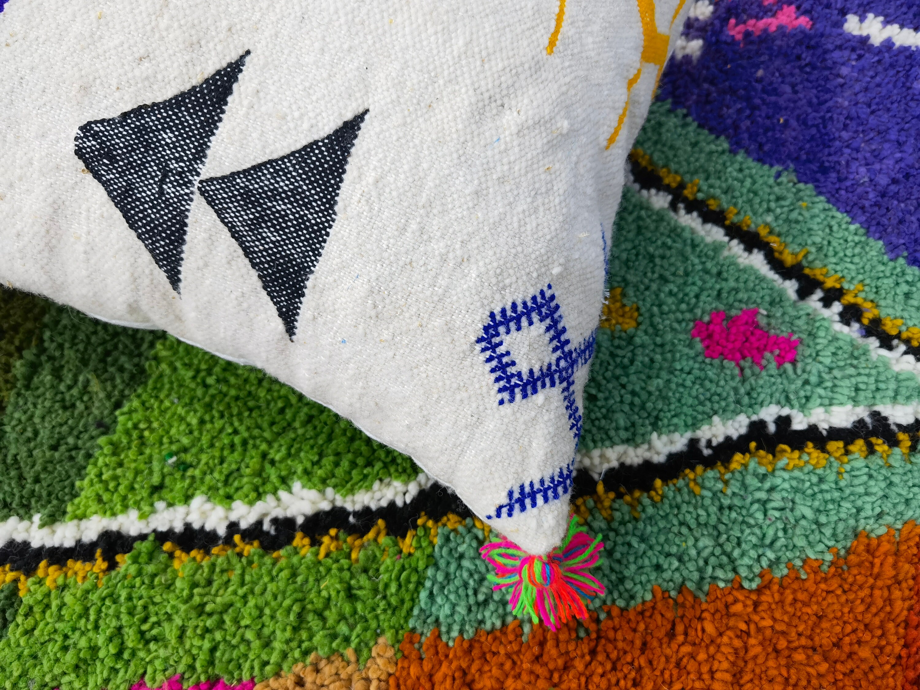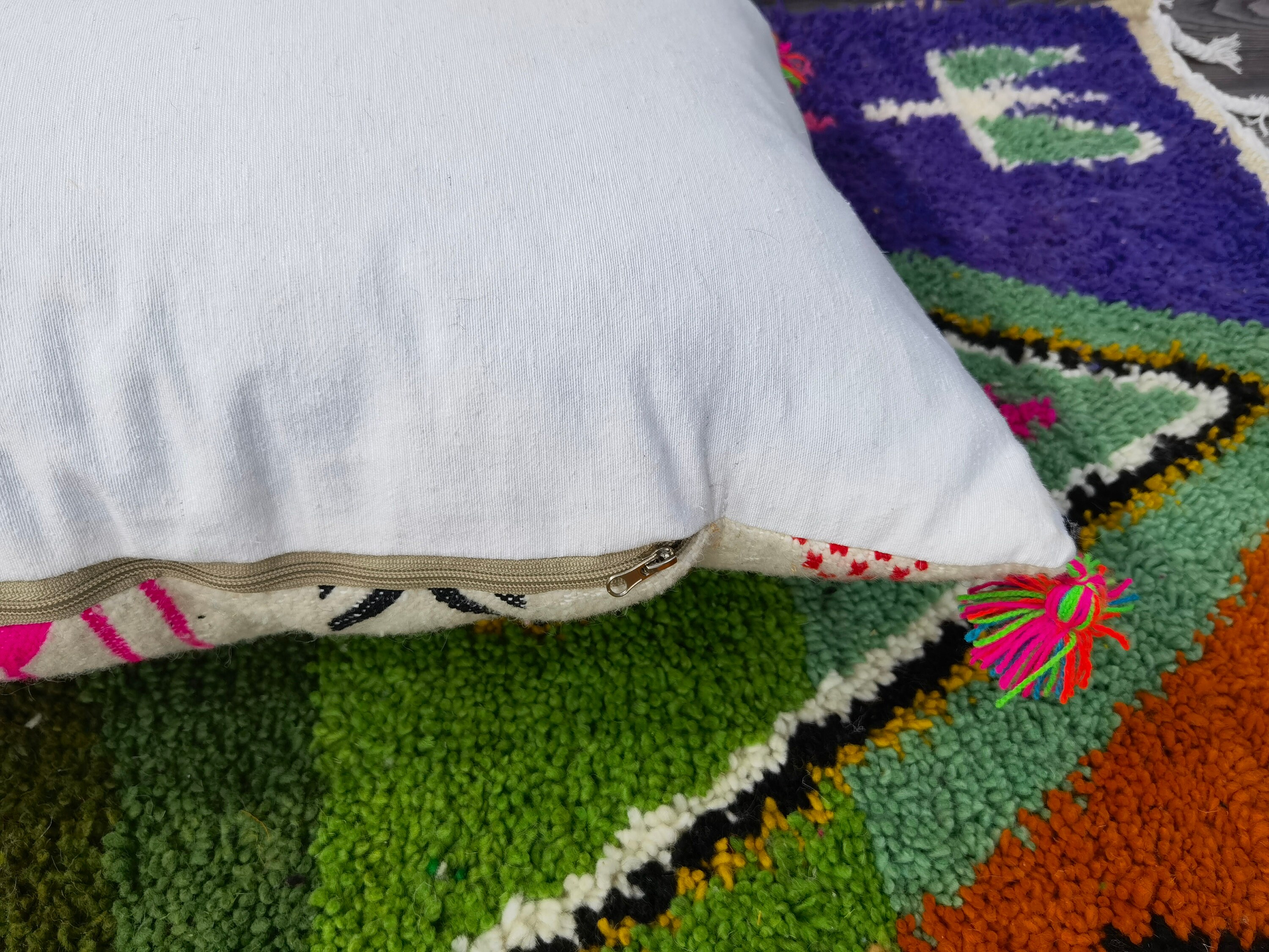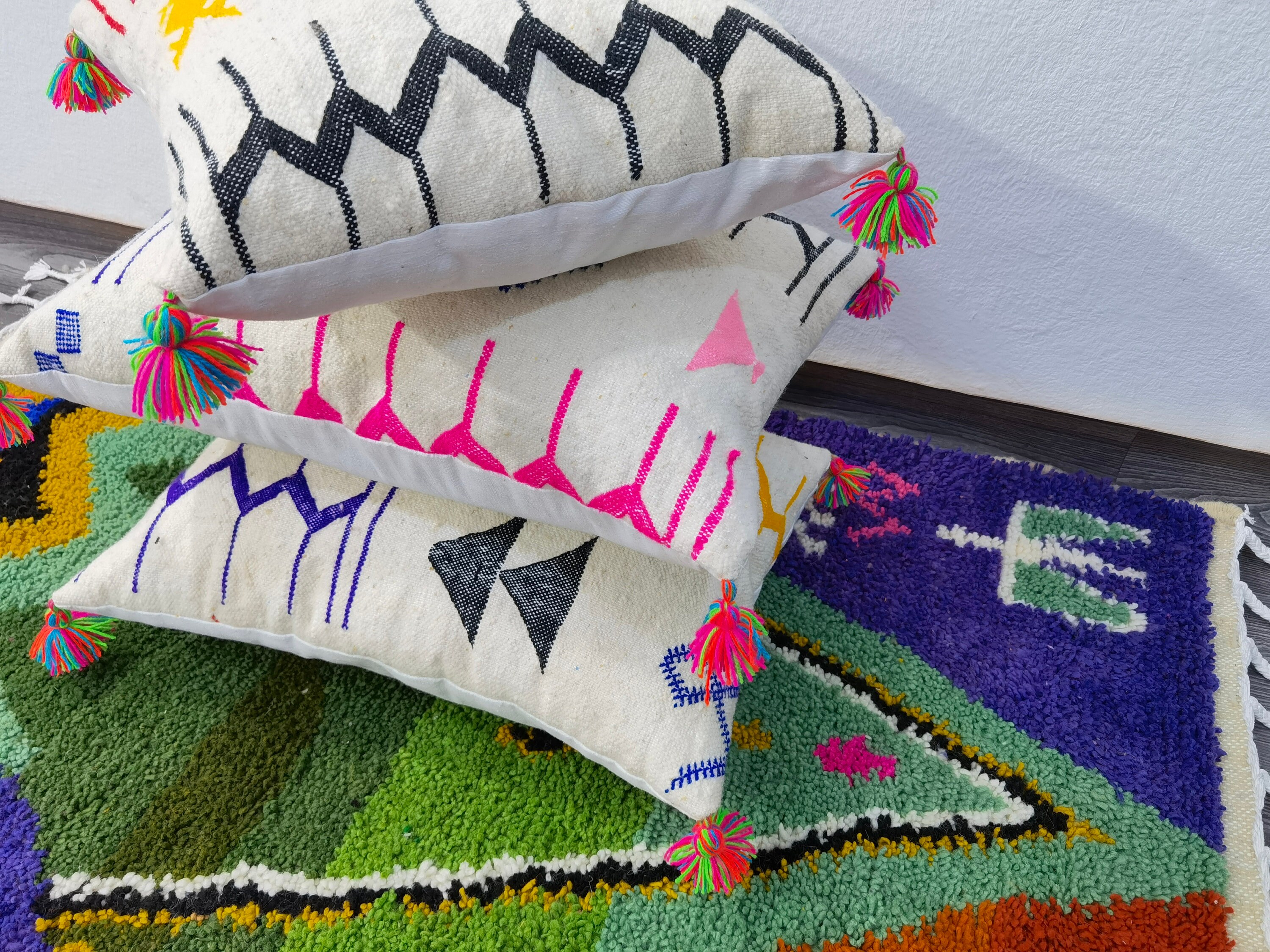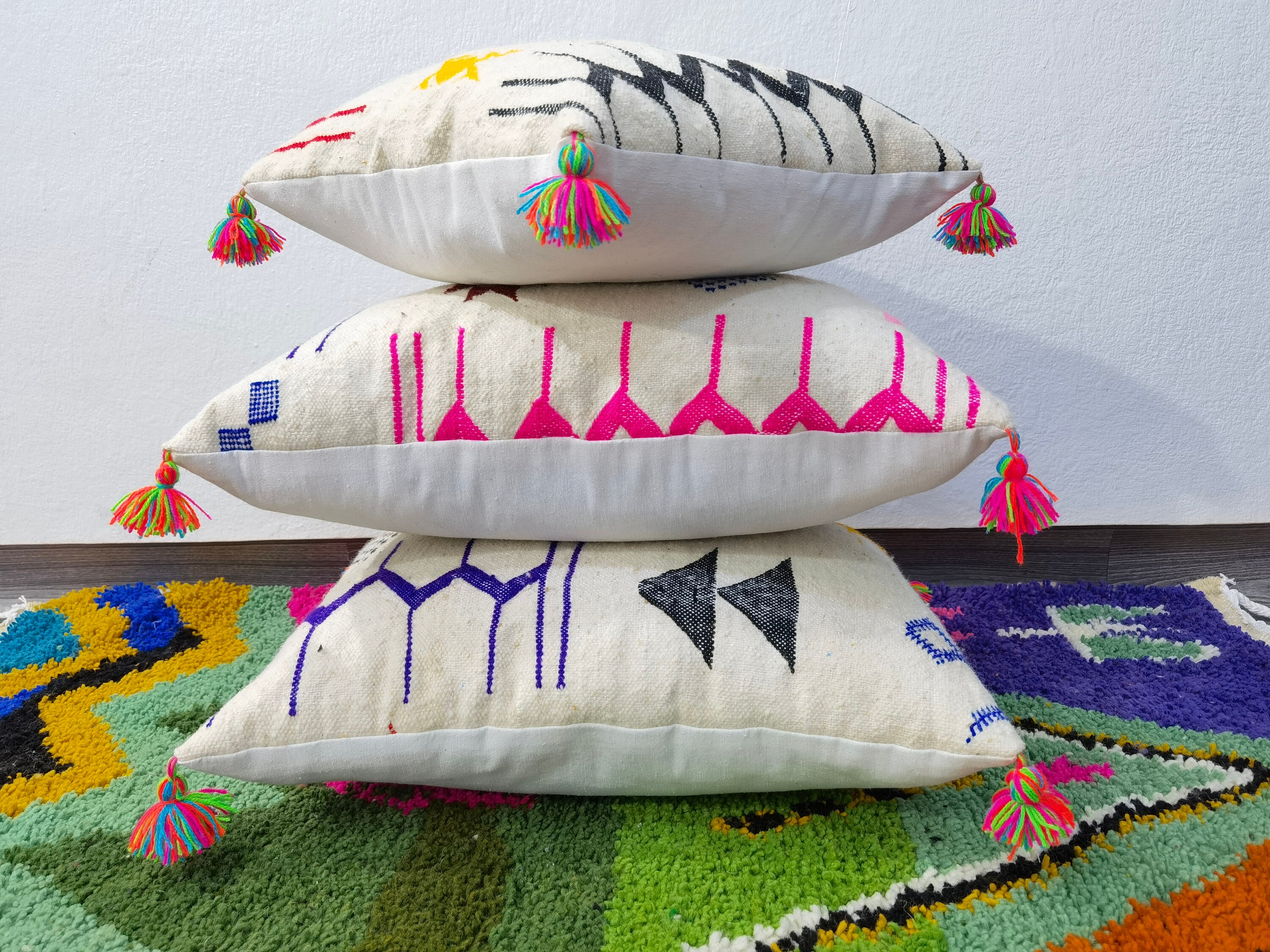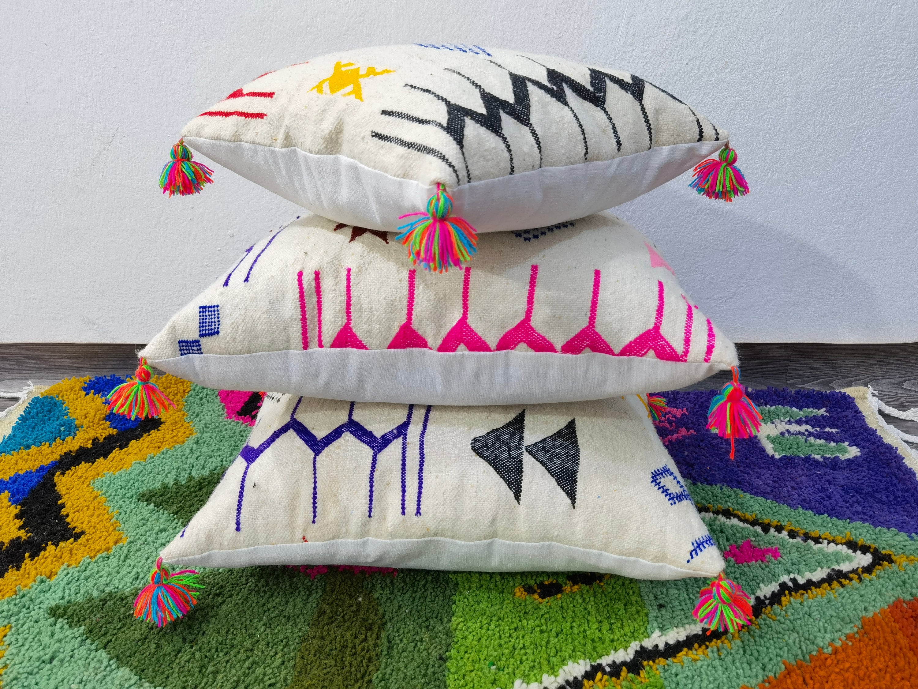 "Your order is entirely handmade, meaning there will be variations in pattern and color (less than 10%). These differences make each pillow truly unique. As they say in Morocco, it's the 'magic of the hand.' The main color is off-white and consistent, while accent colors may vary."