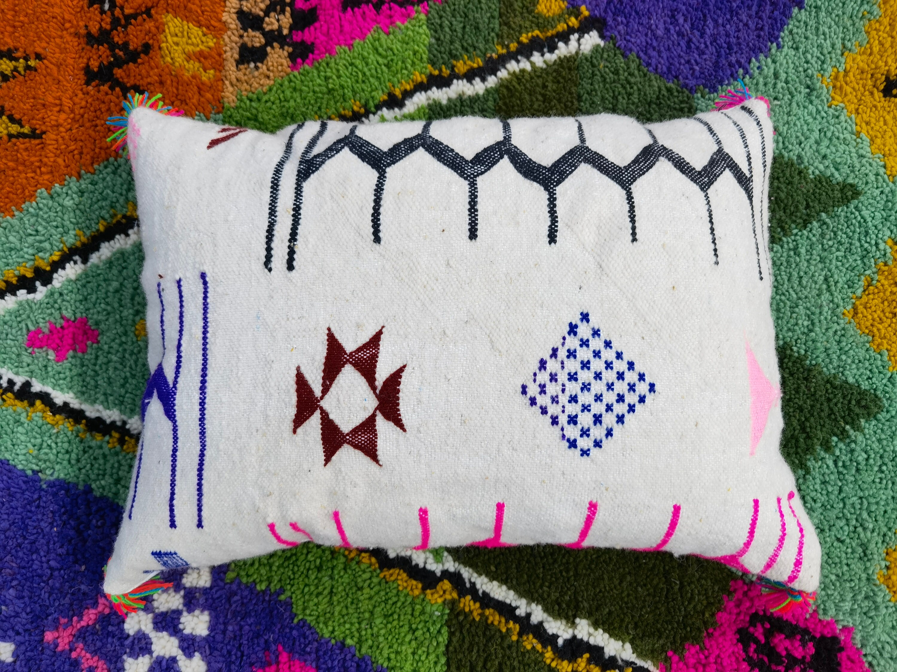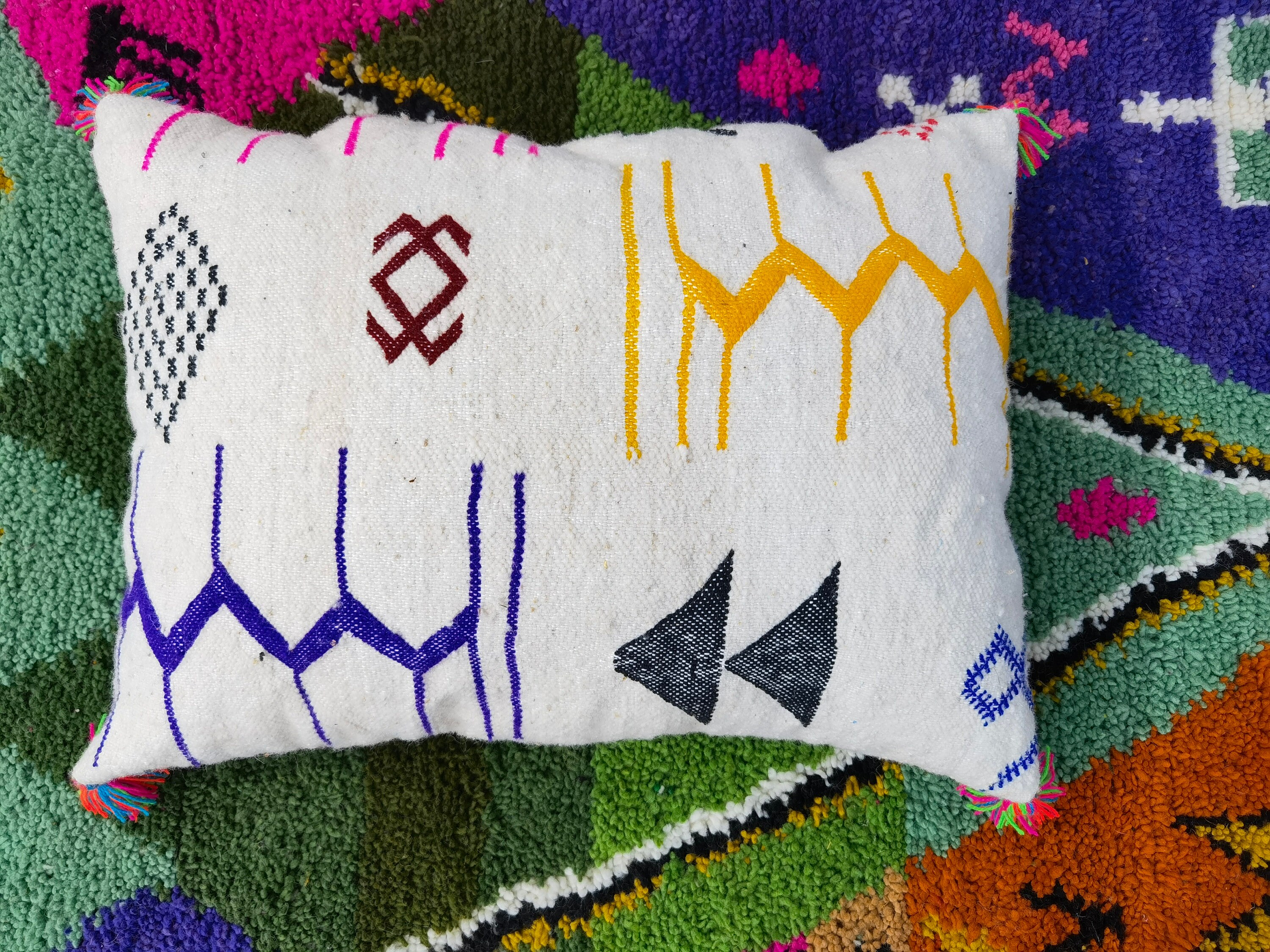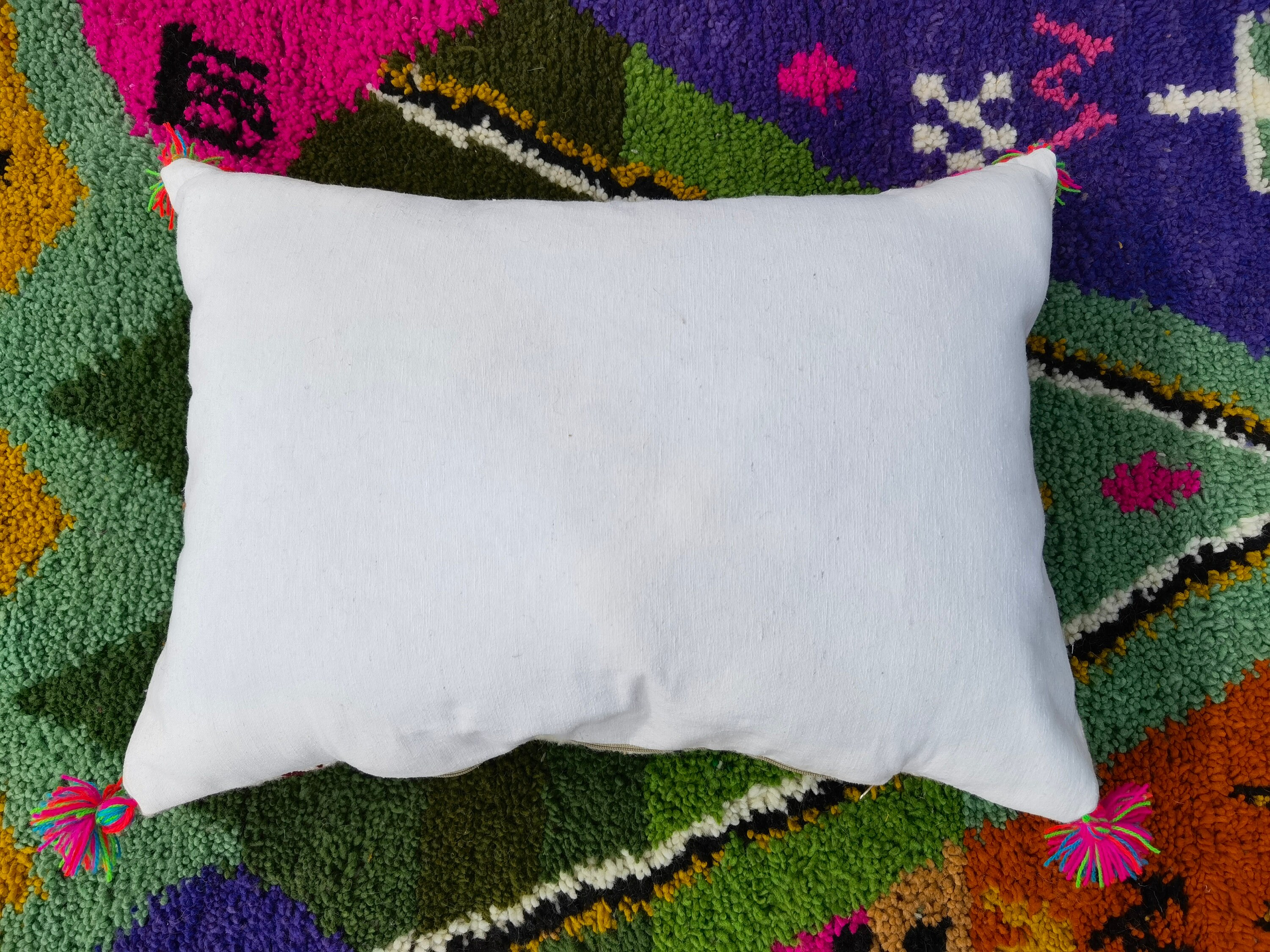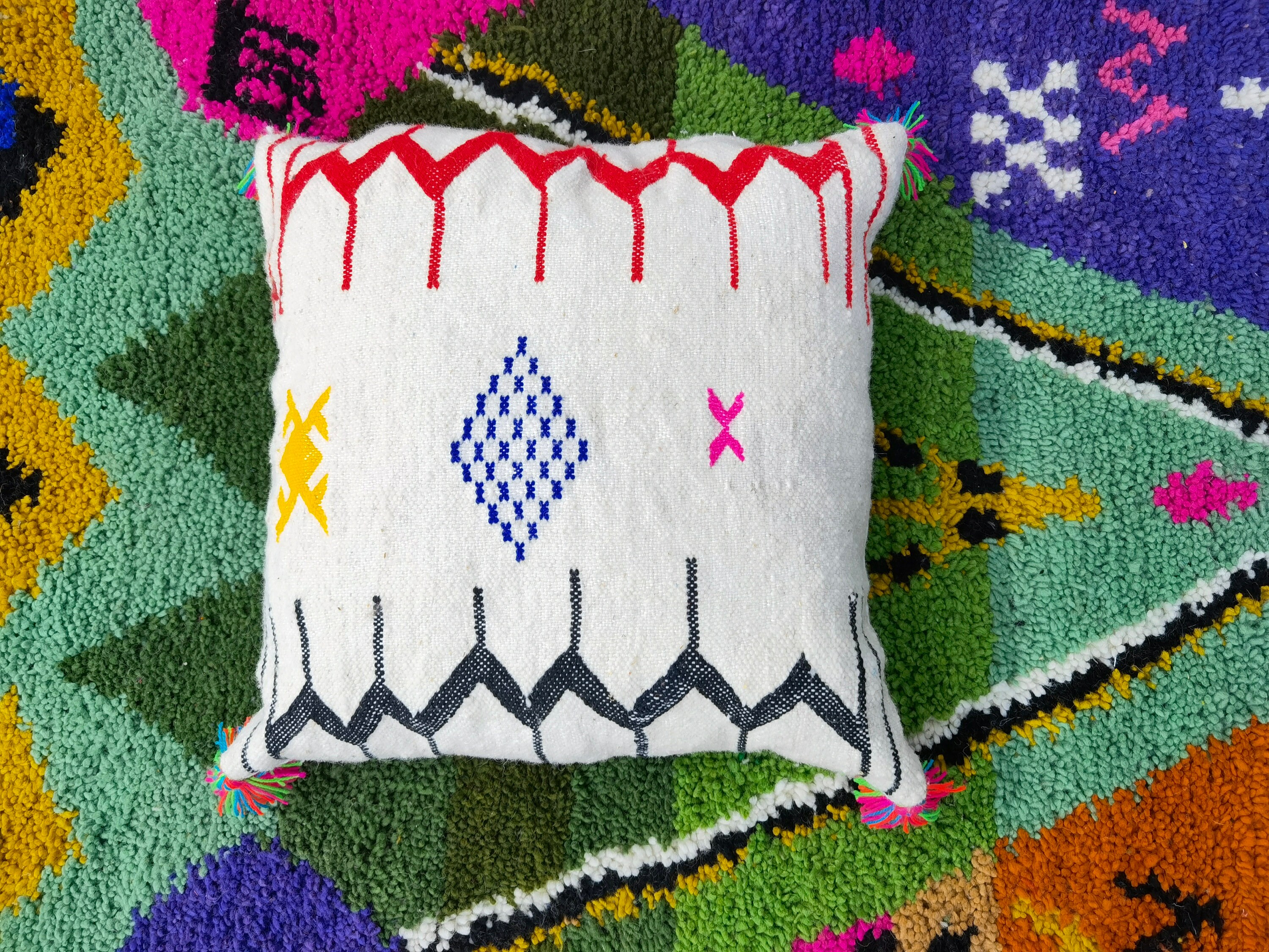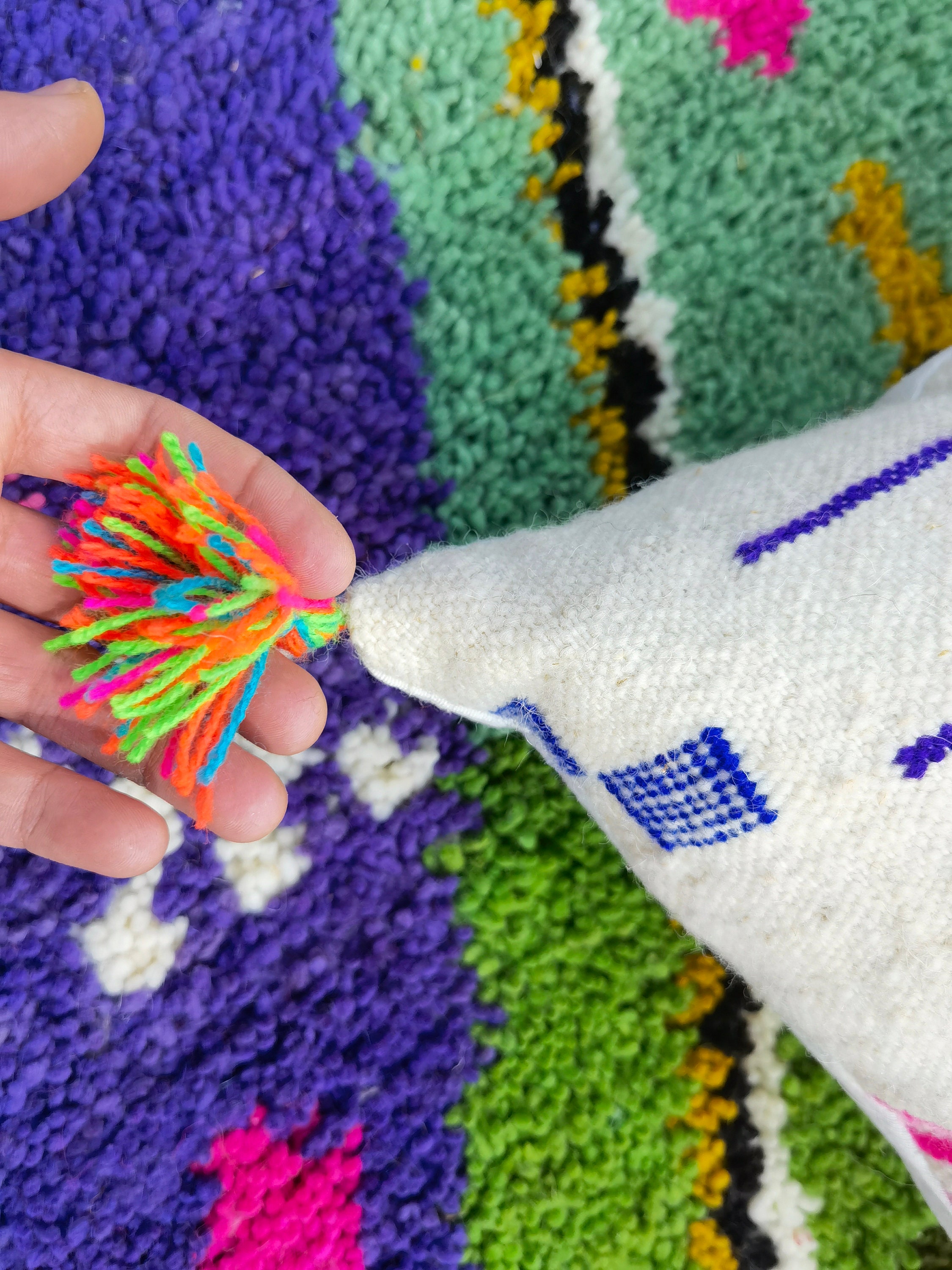 "Your order is entirely handmade, meaning there will be variations in pattern and color (less than 10%). These differences make each pillow truly unique. As they say in Morocco, it's the 'magic of the hand.' The main color is off-white and consistent, while accent colors may vary."