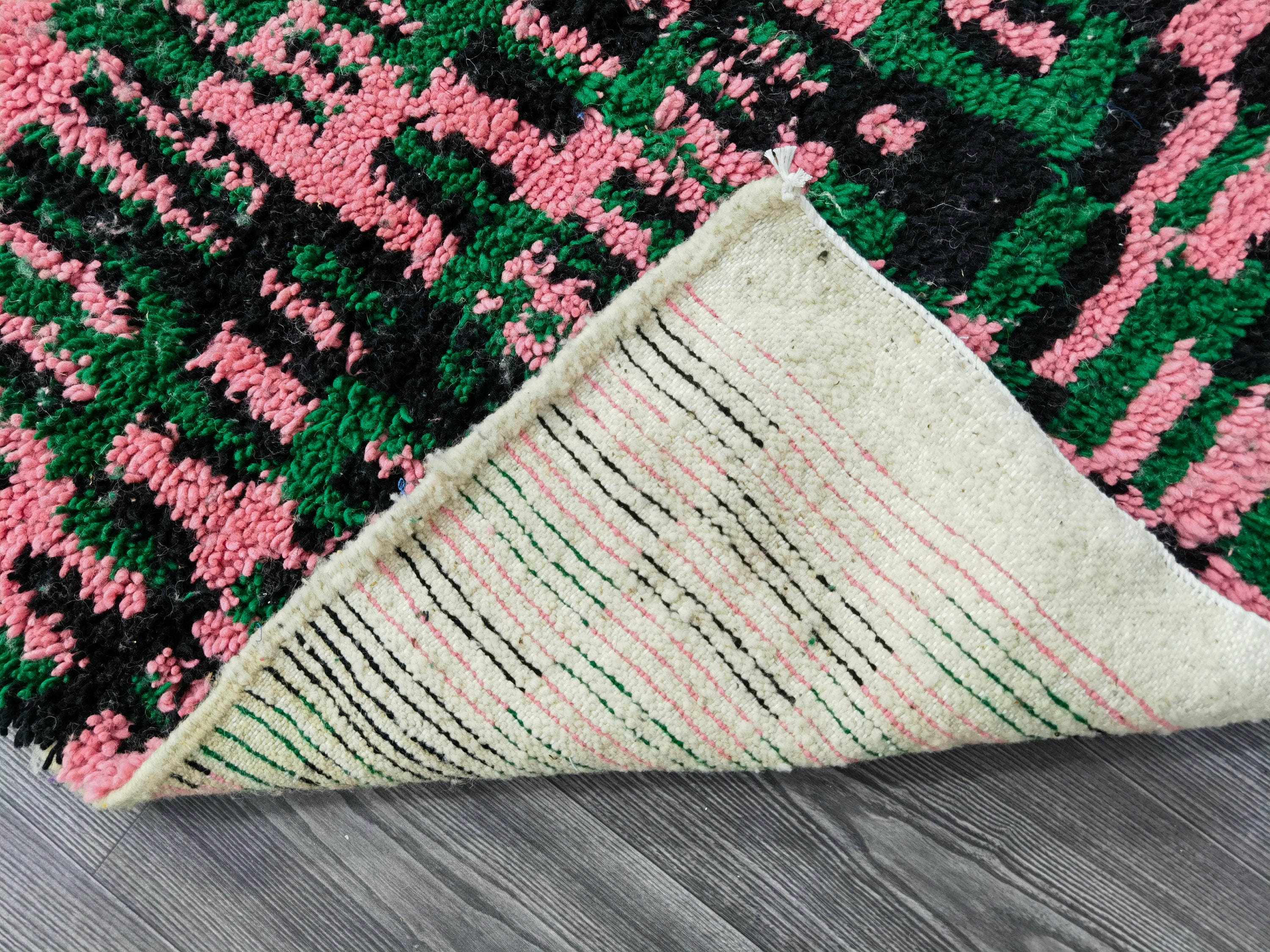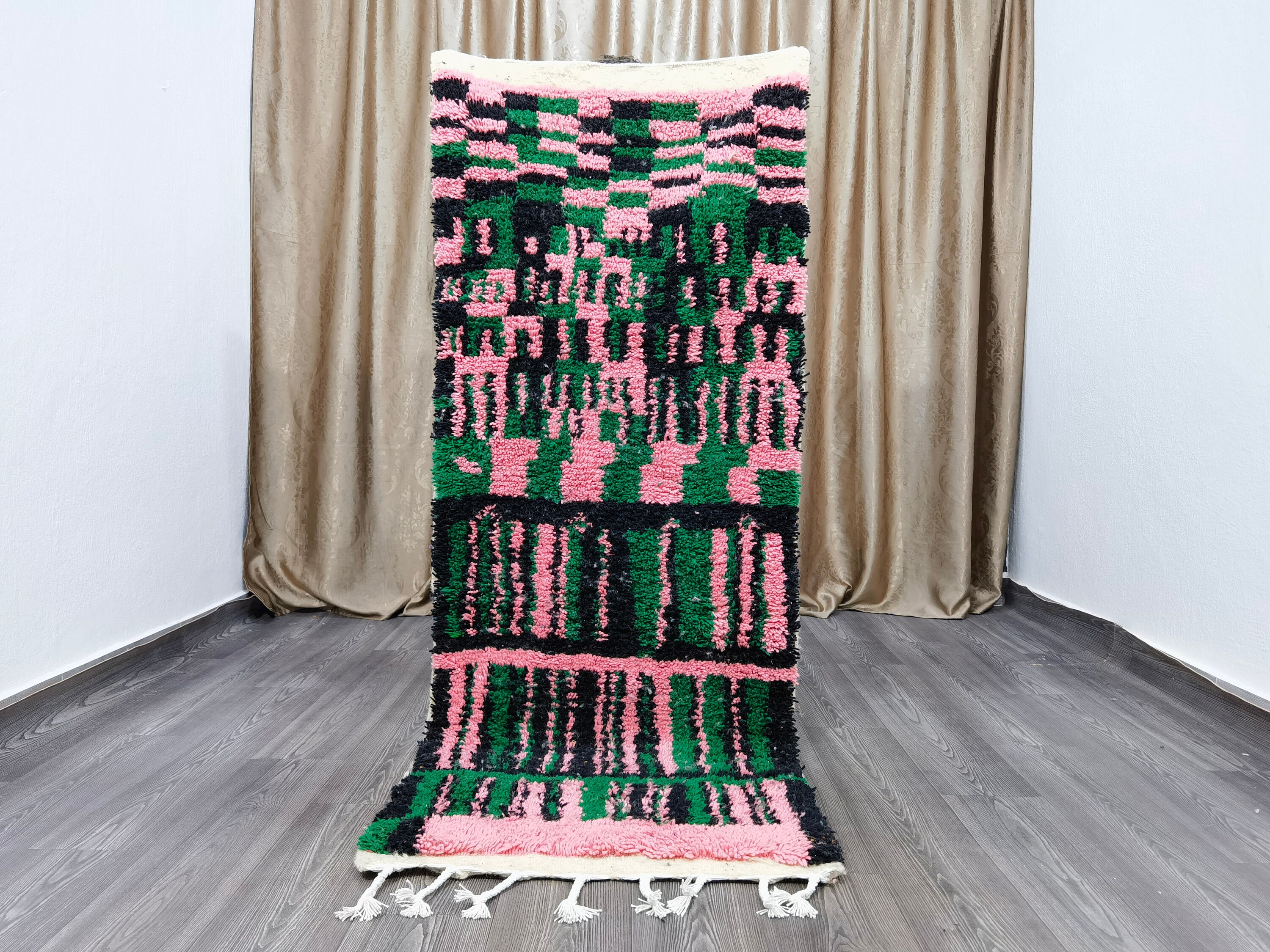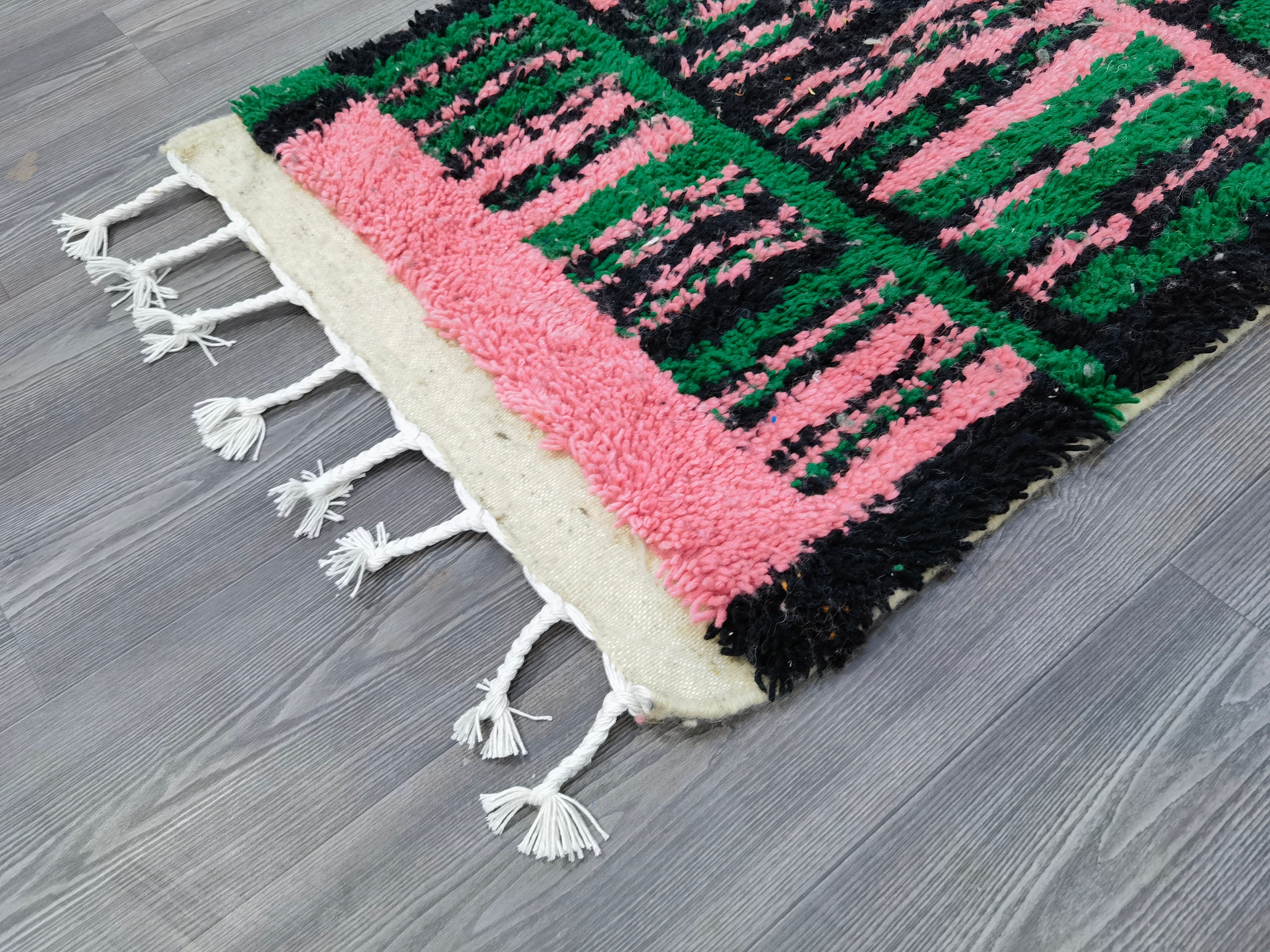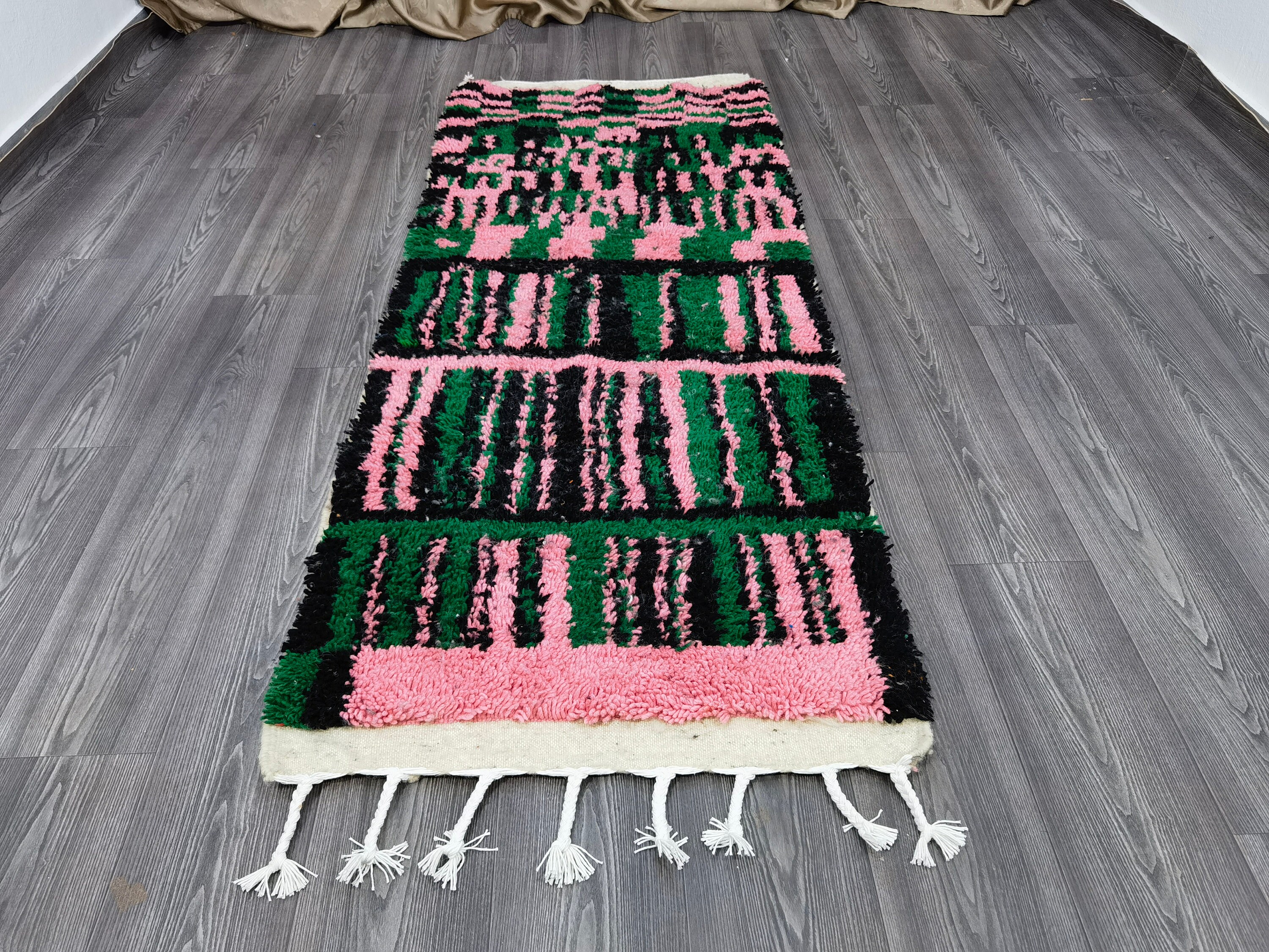 Green Moroccan Wool Runner Rug , Shaggy Wool Rug, Berber Runner Rug, Pink Shaggy Rug, berber Colorful Pink Rug, Home Decor Gifts For Her