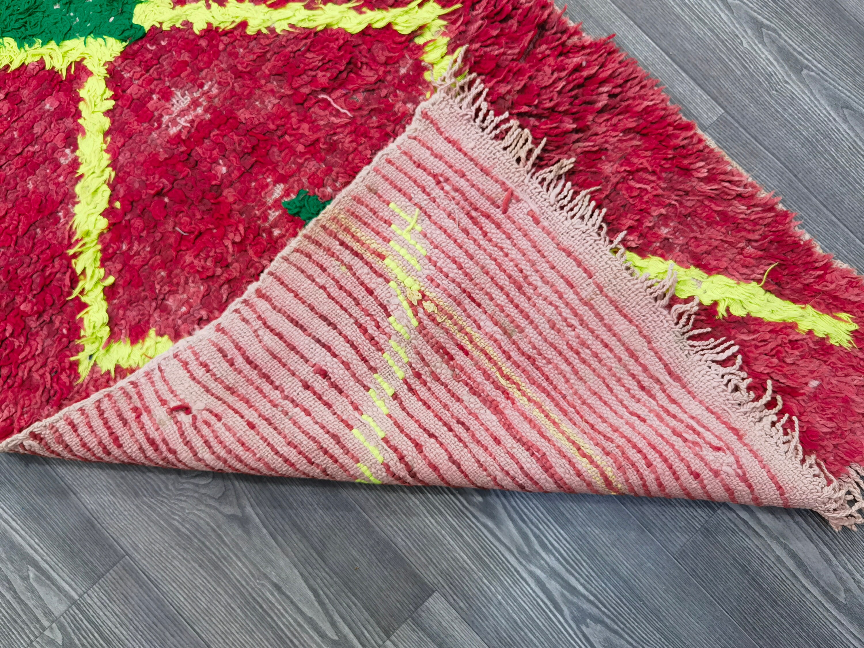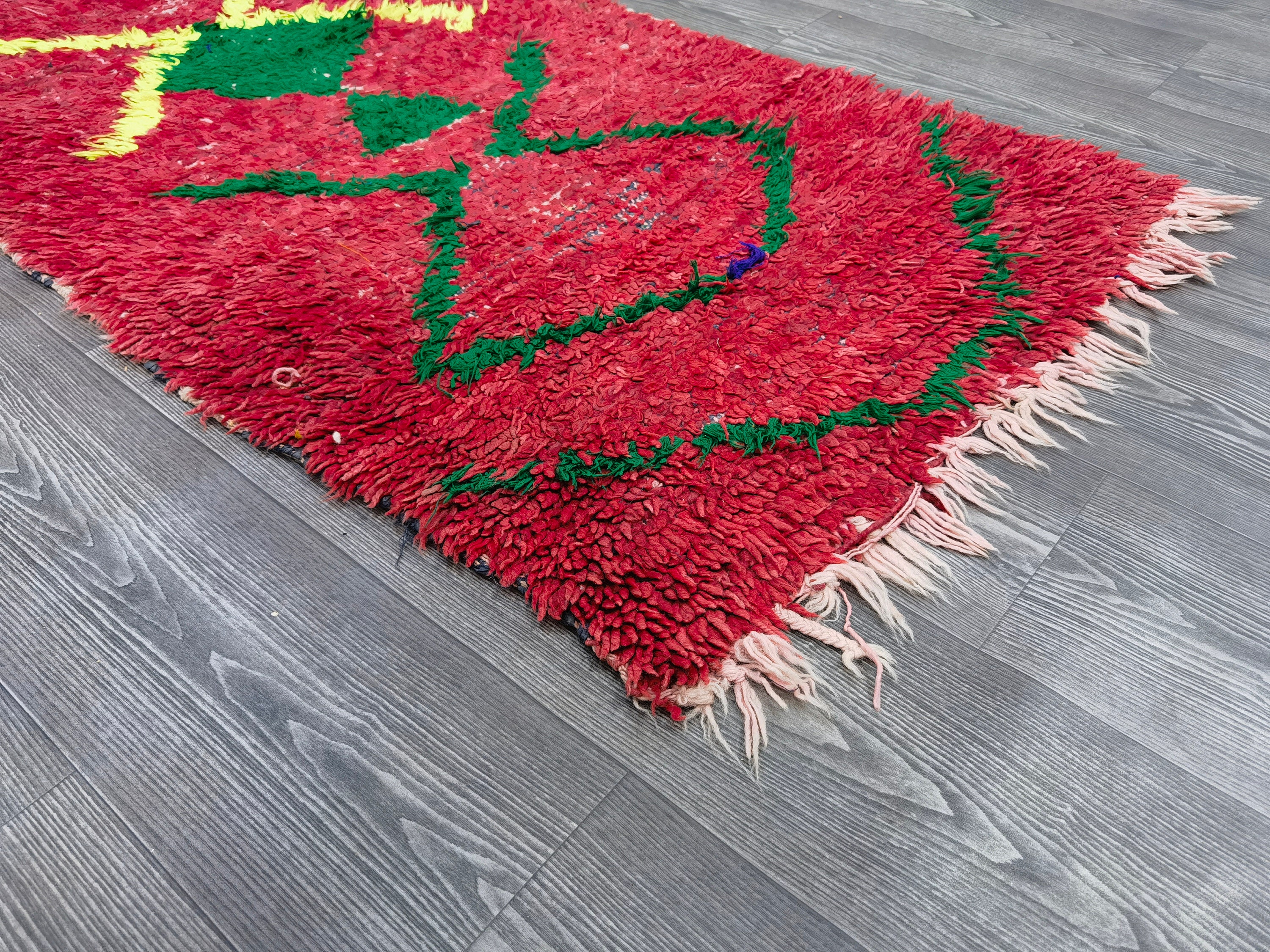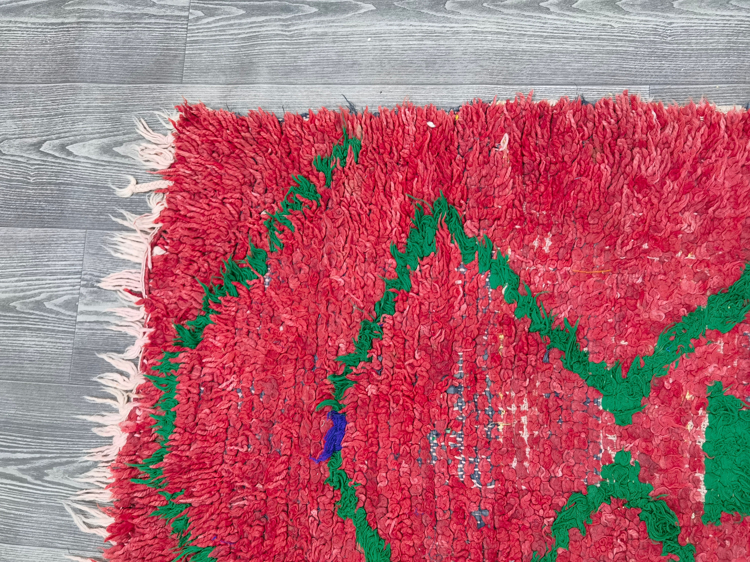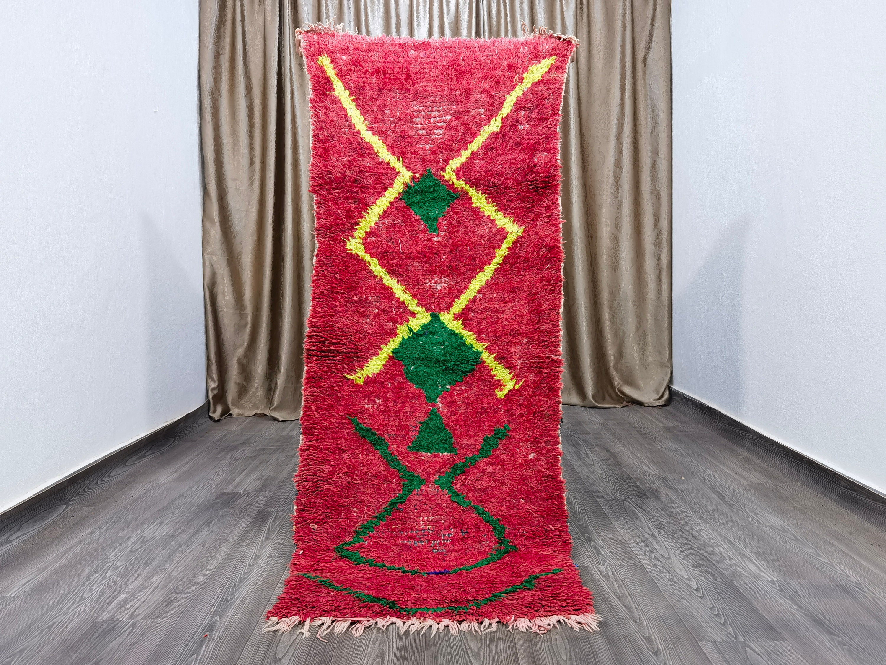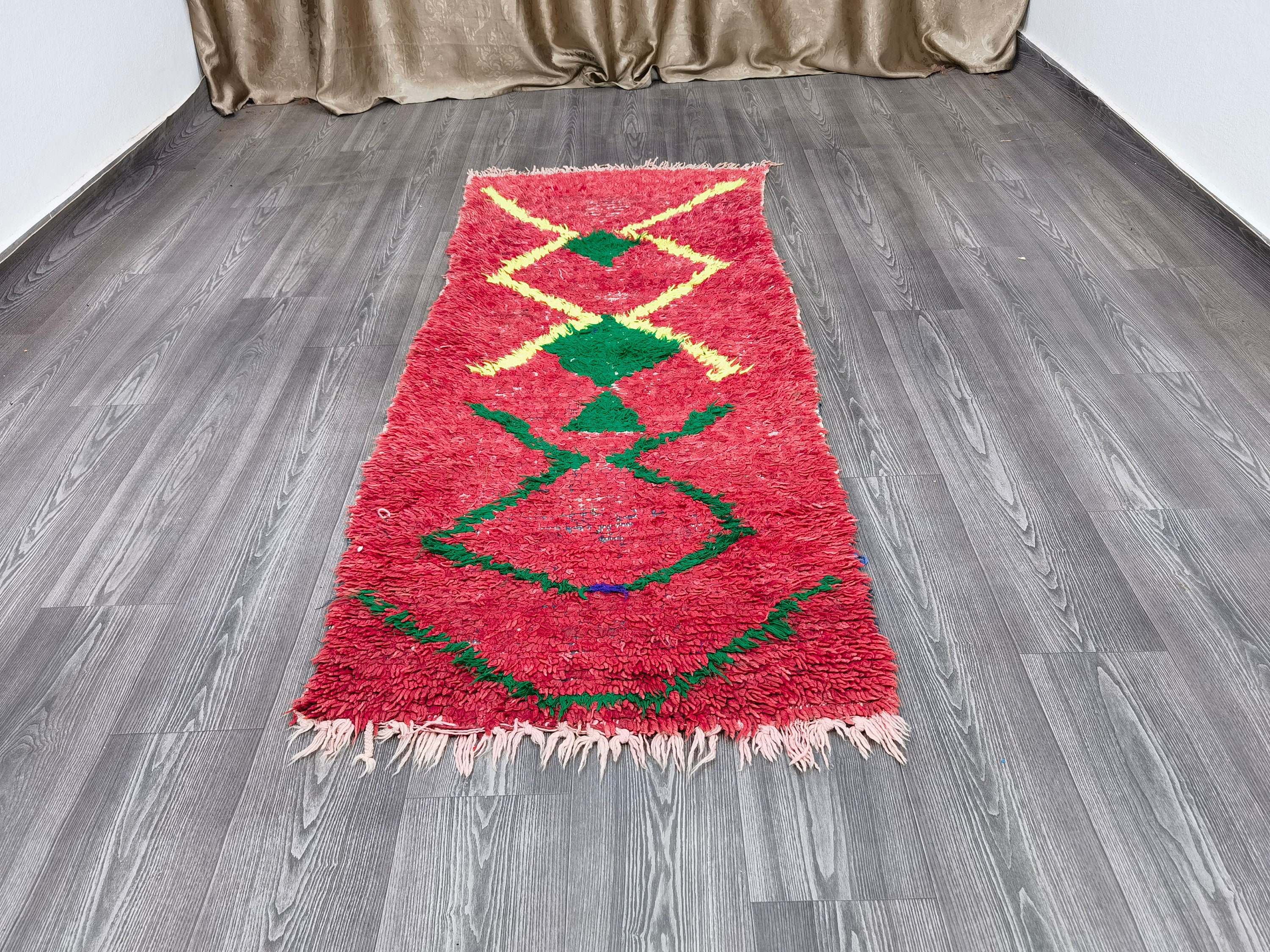 Moroccan Hand Knotted Runner Rug,Green Wool Shaggy Rug,Gorgeous Boujaad Red Rug,Authentic Moroccan Rug, Moroccan Fluffy Rug