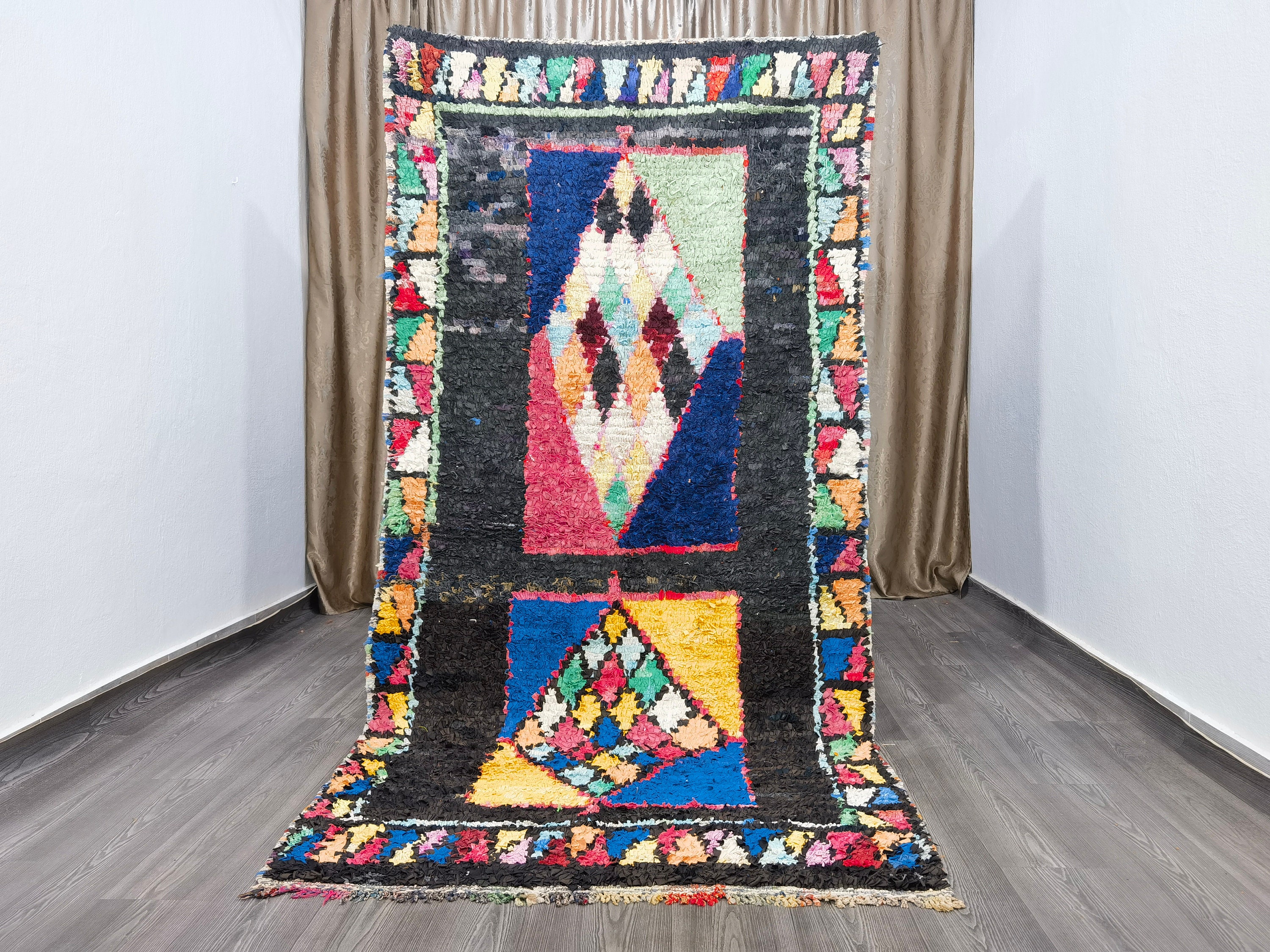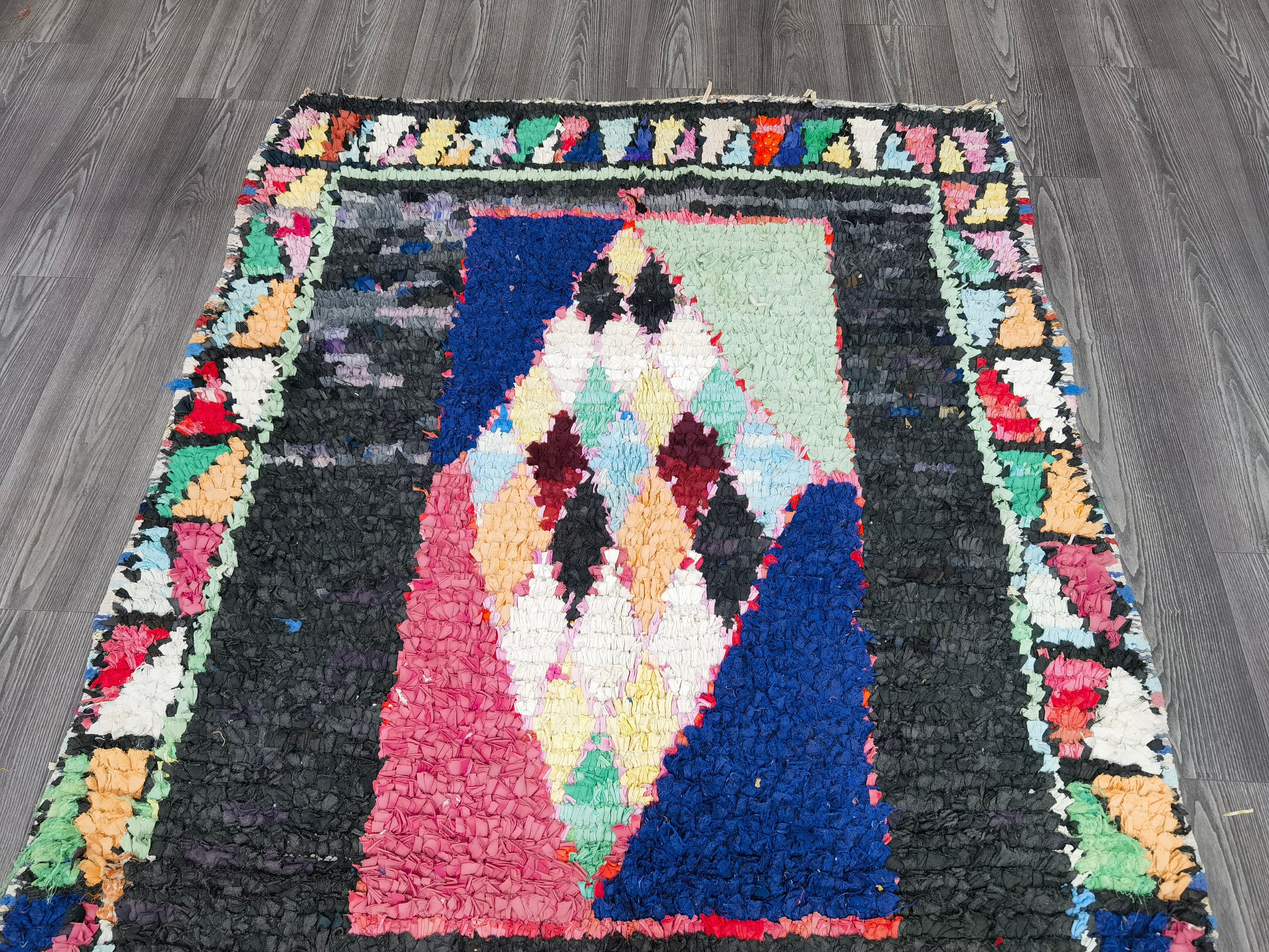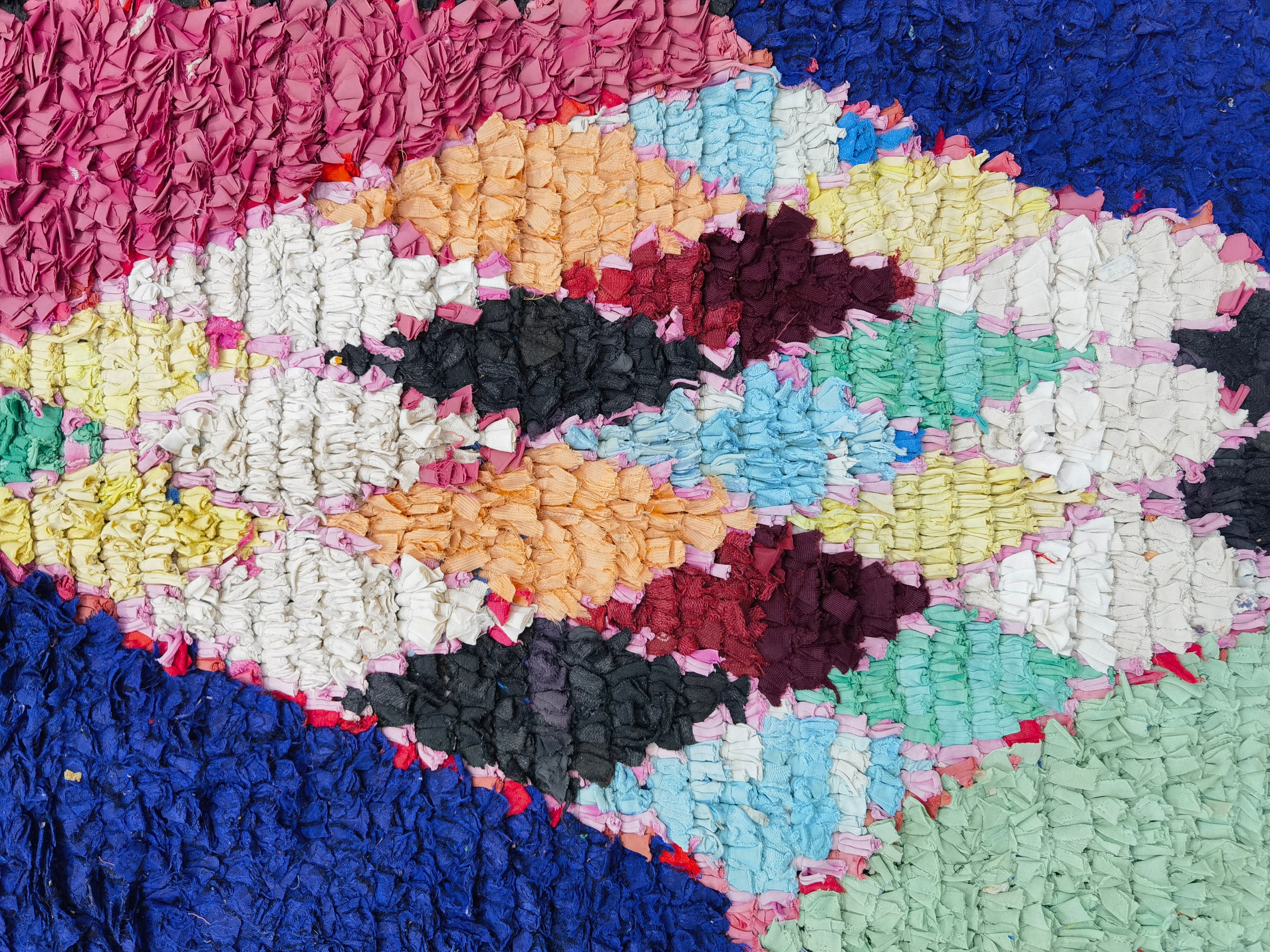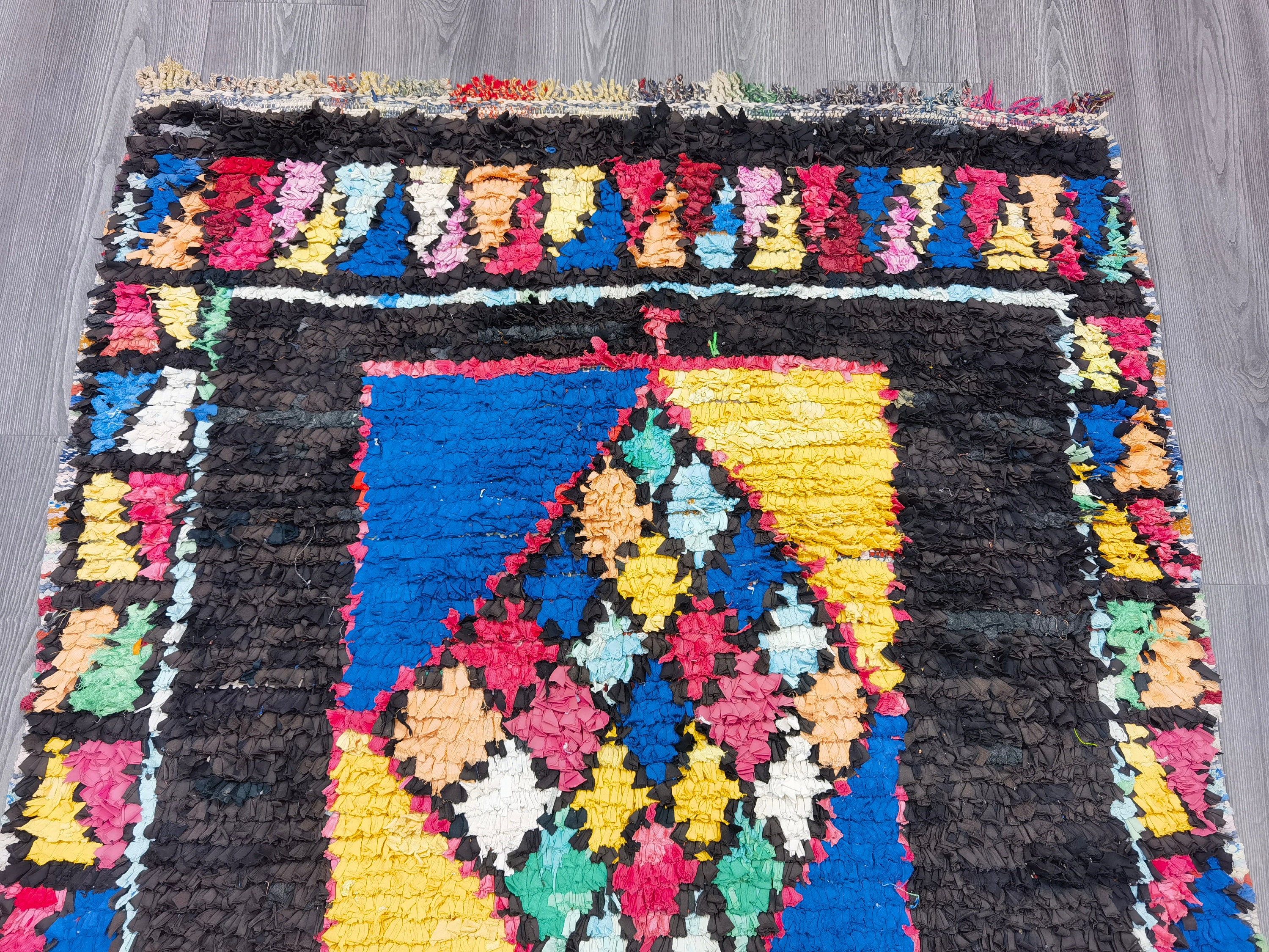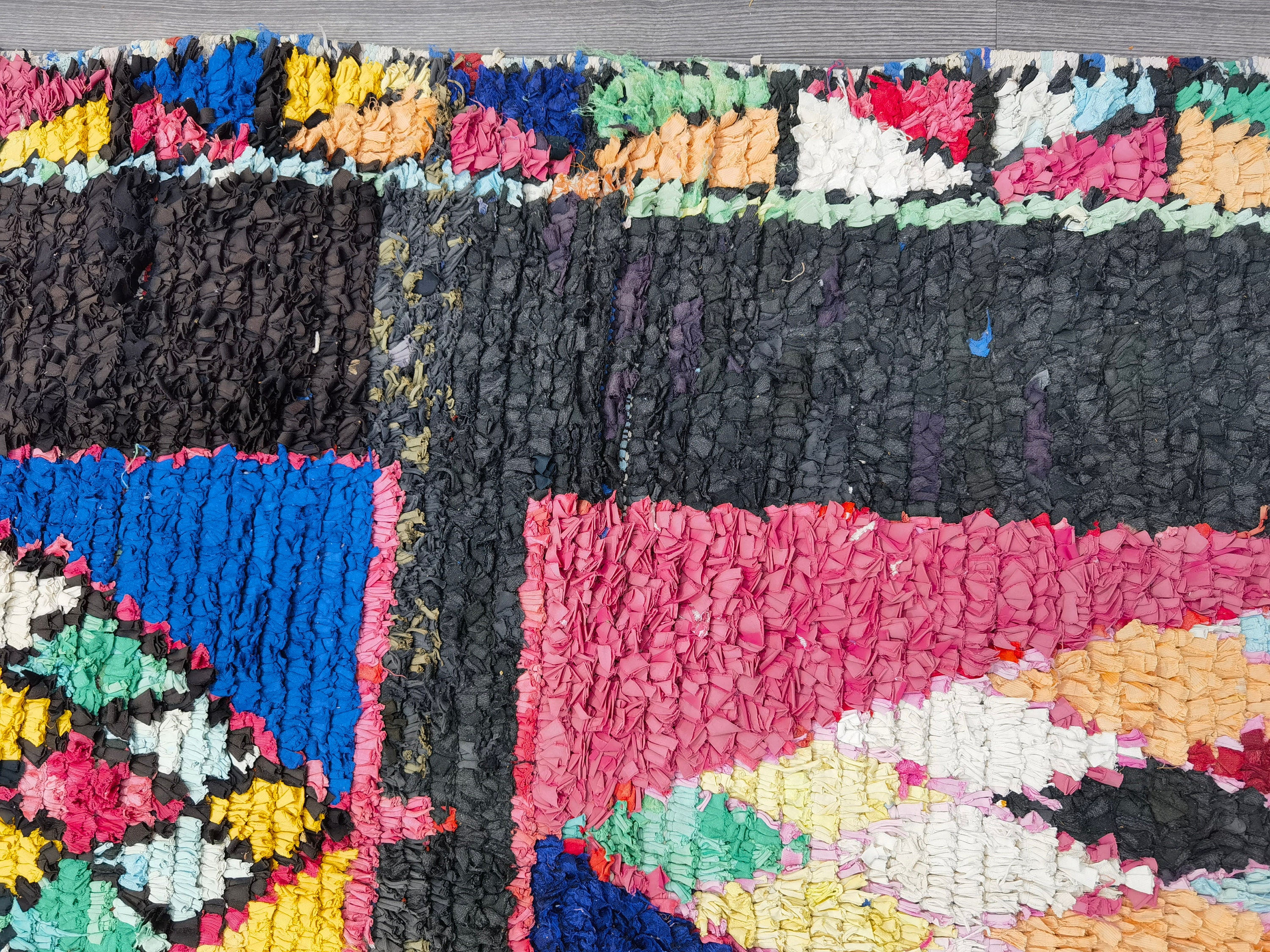 Boujaad Rugs For Living Room, Vintage Boujaad rug, Moroccan Handmade Vintage Boucherouite Rag, Boucherouite Carpet 4.2x8.2 ft (261x127 cm).