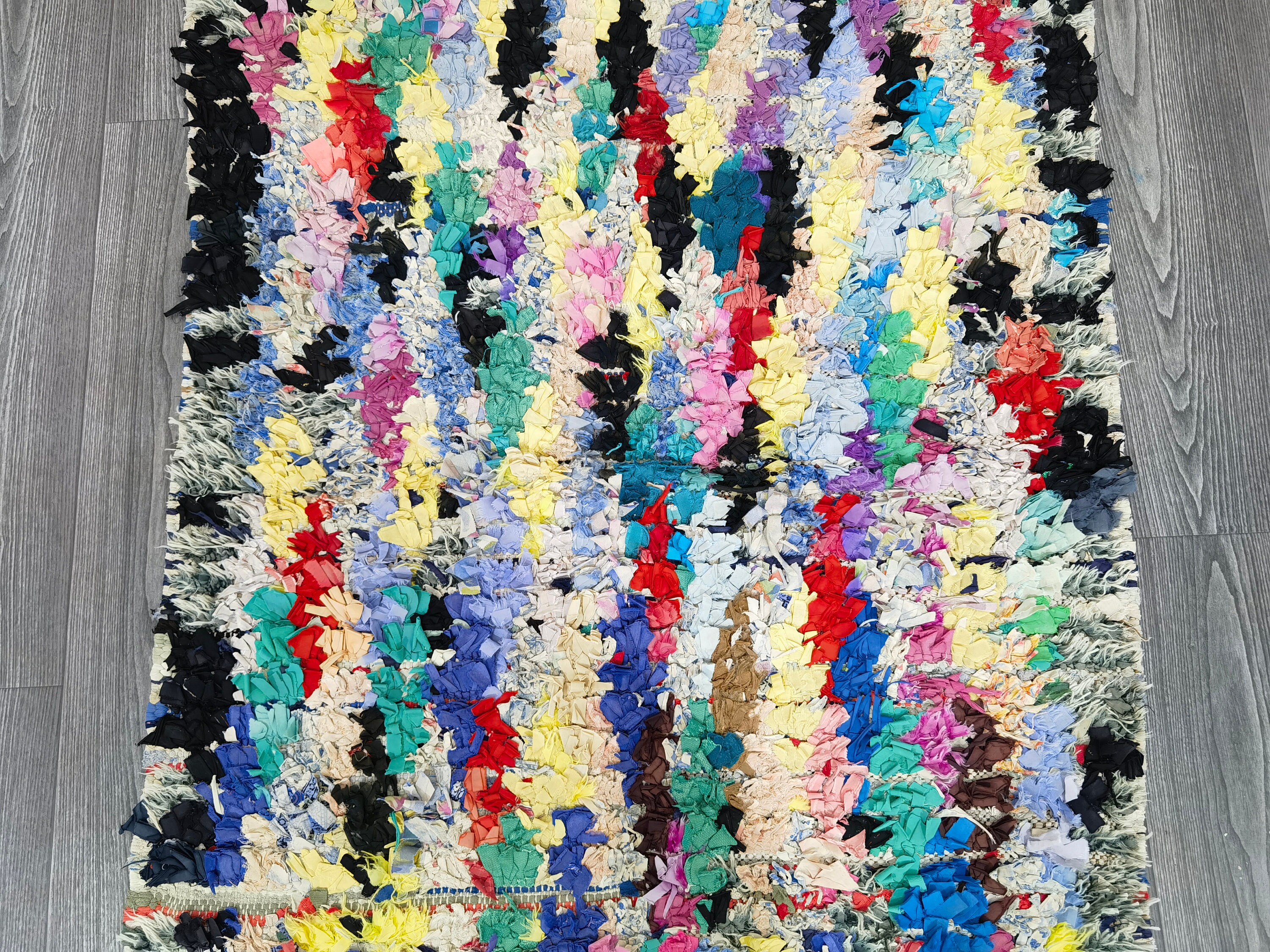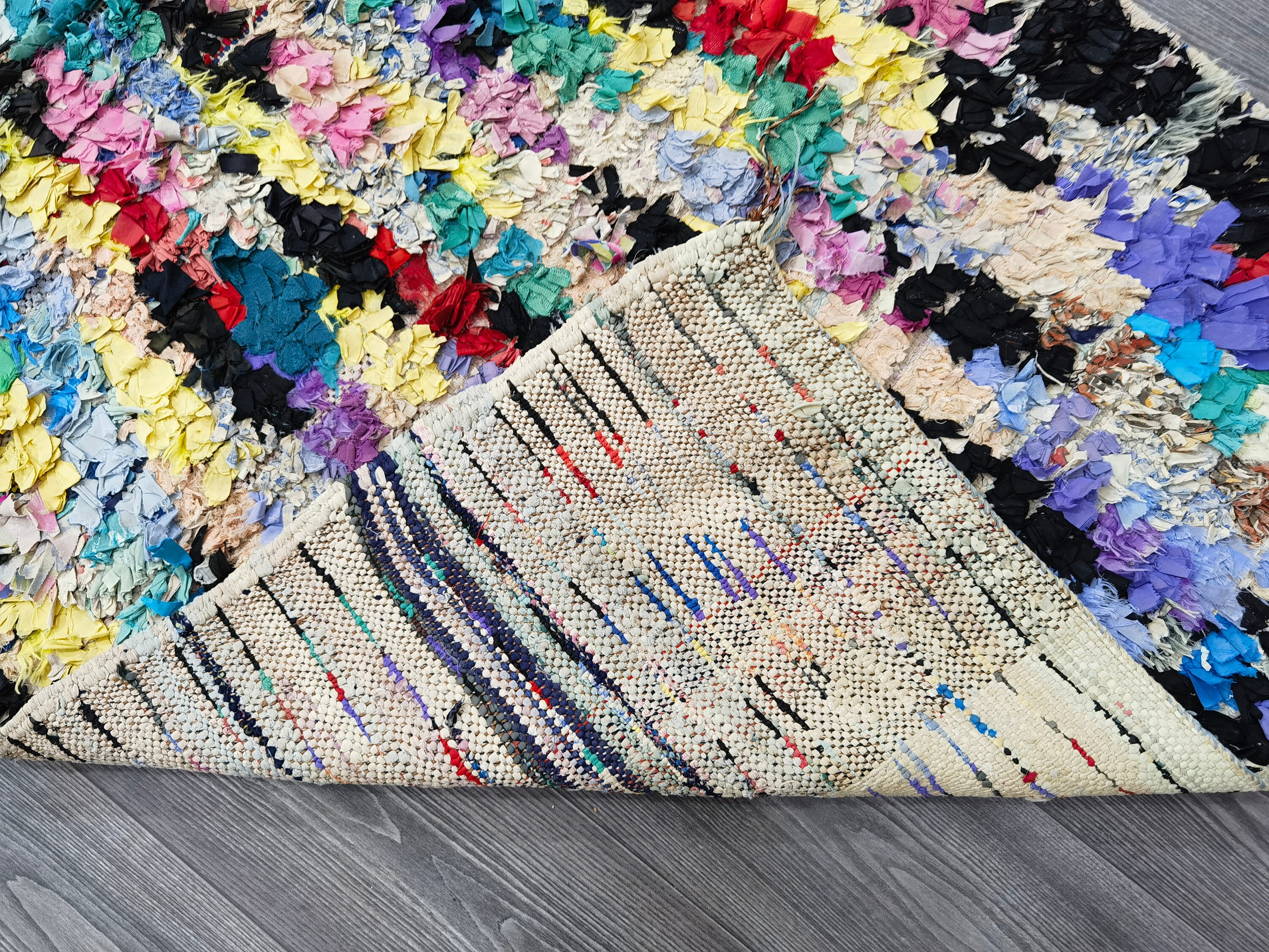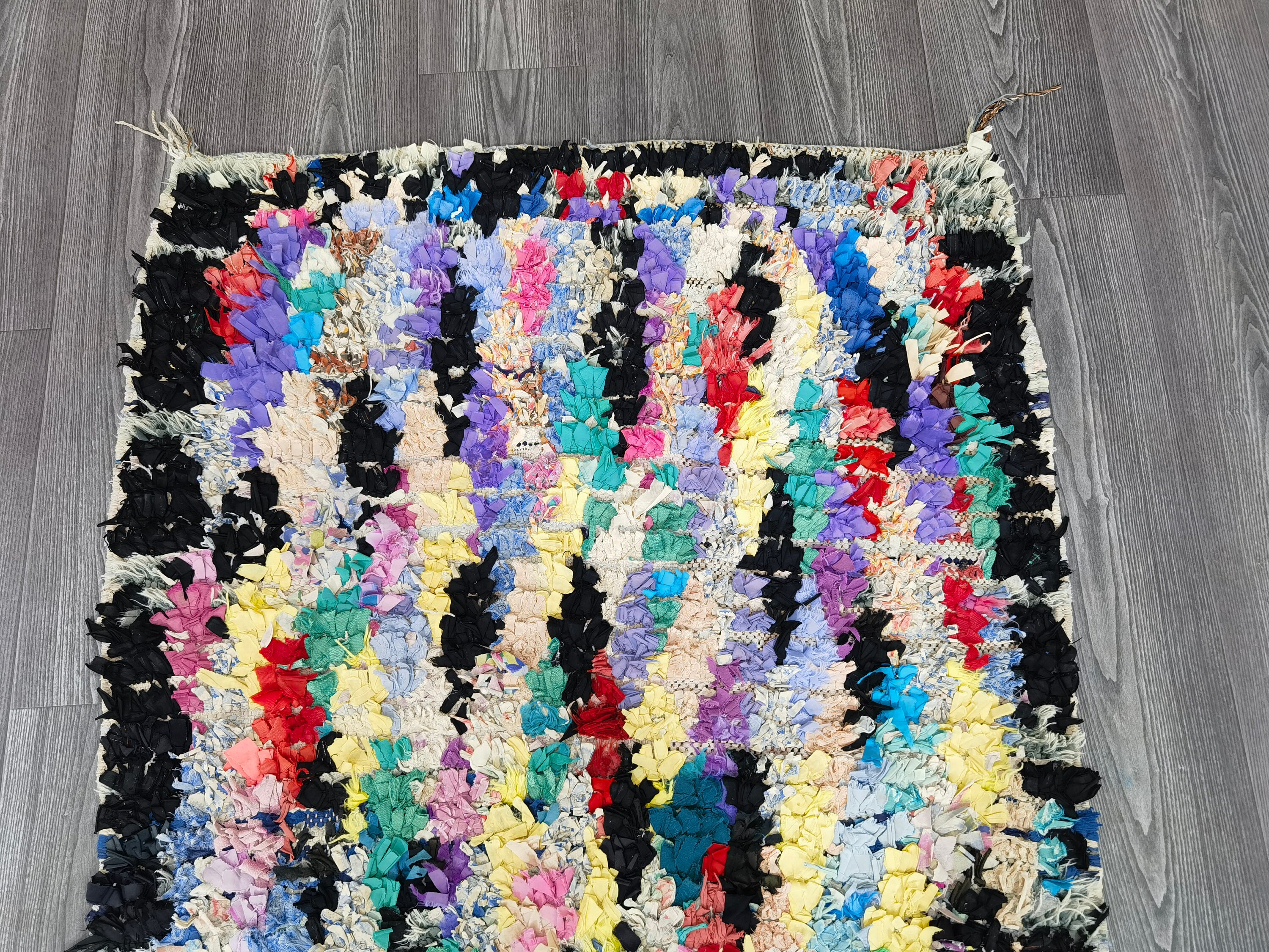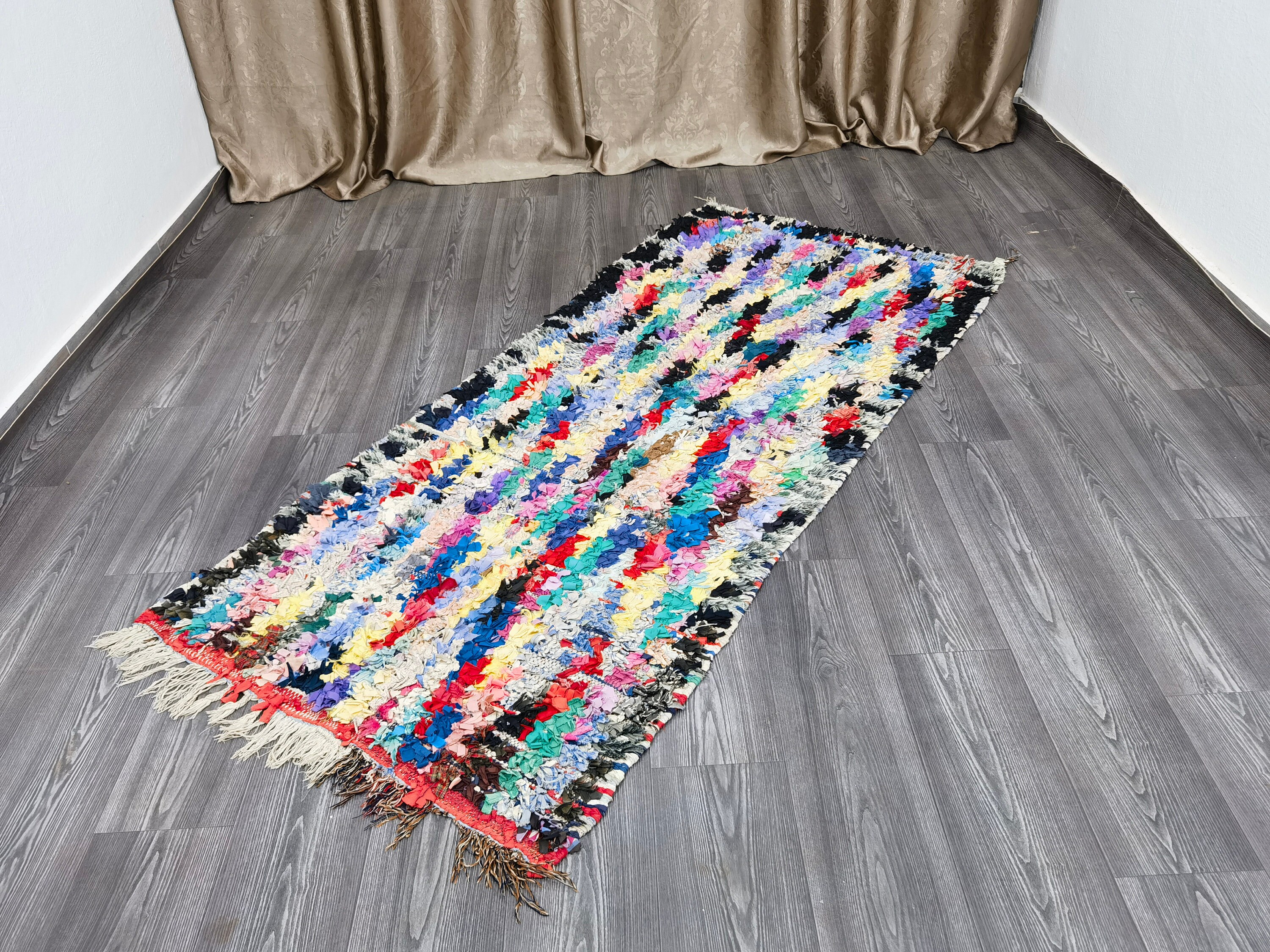Gorgeous Handmade Moroccan Bohemian Shag Rug - Moroccan Colorful Boucherouite Rug - Old Boucherouite Rug 3x6.9 FT ( 92 X 210 Cm) .