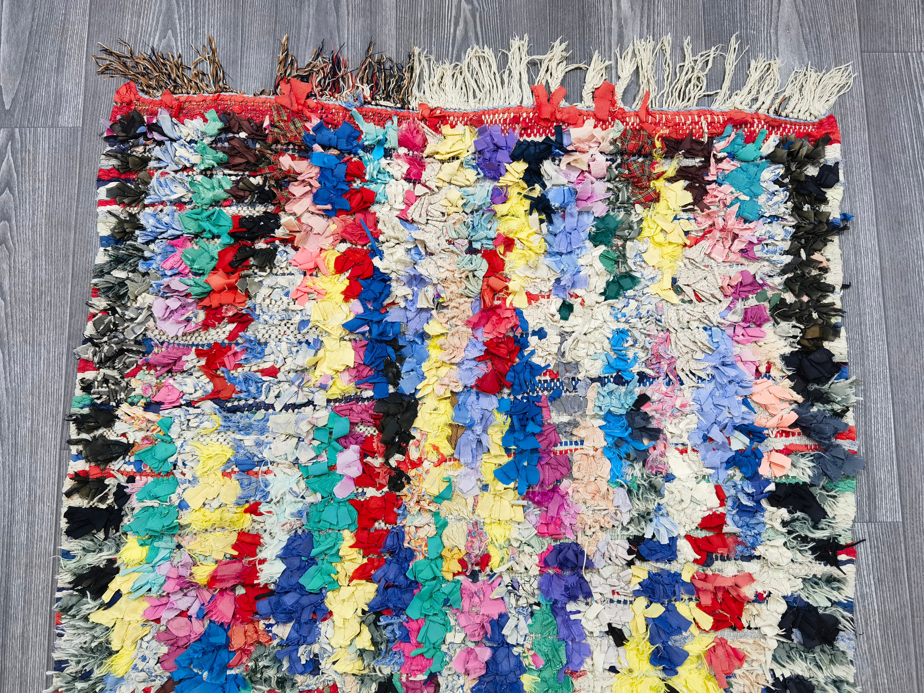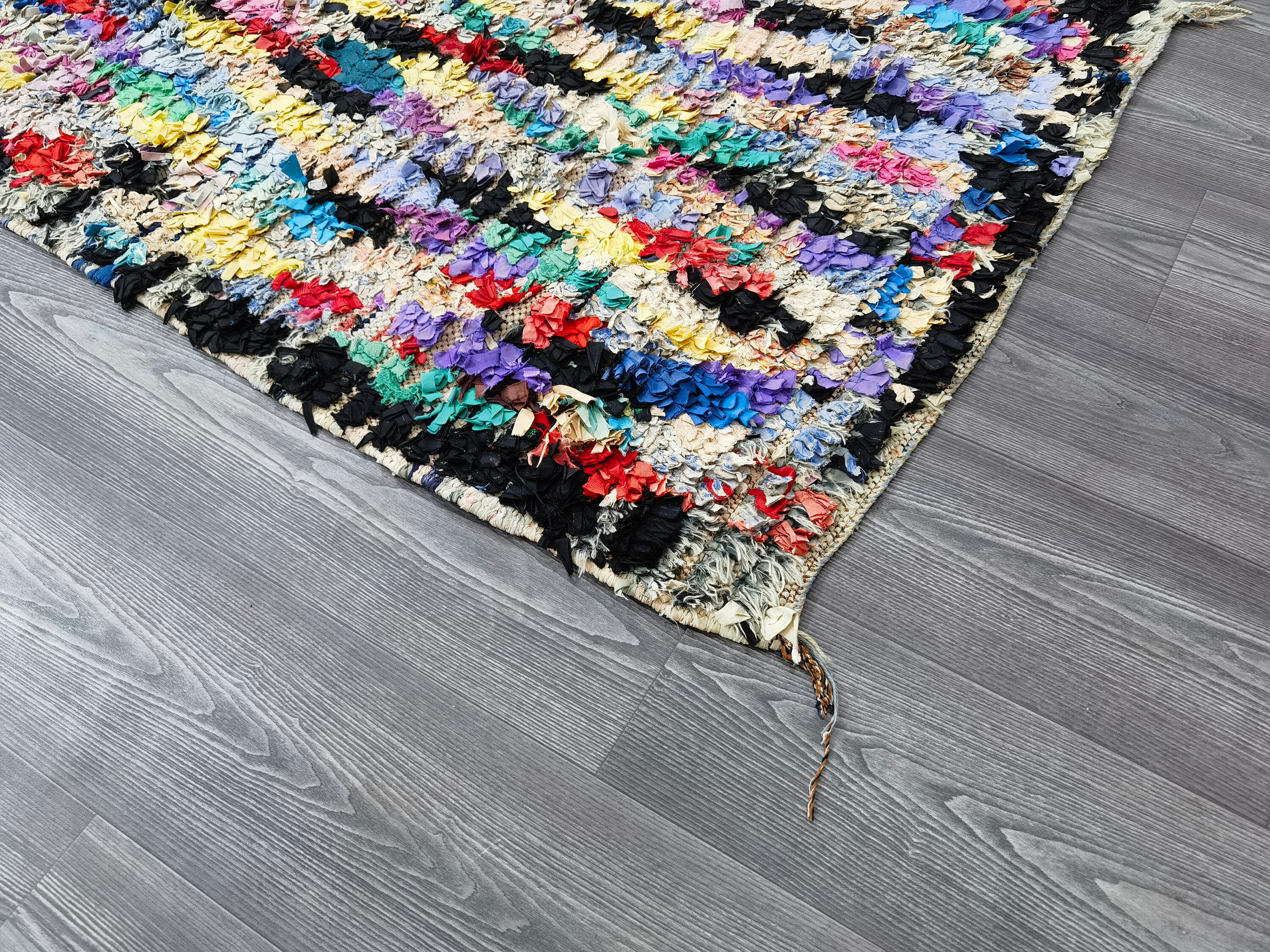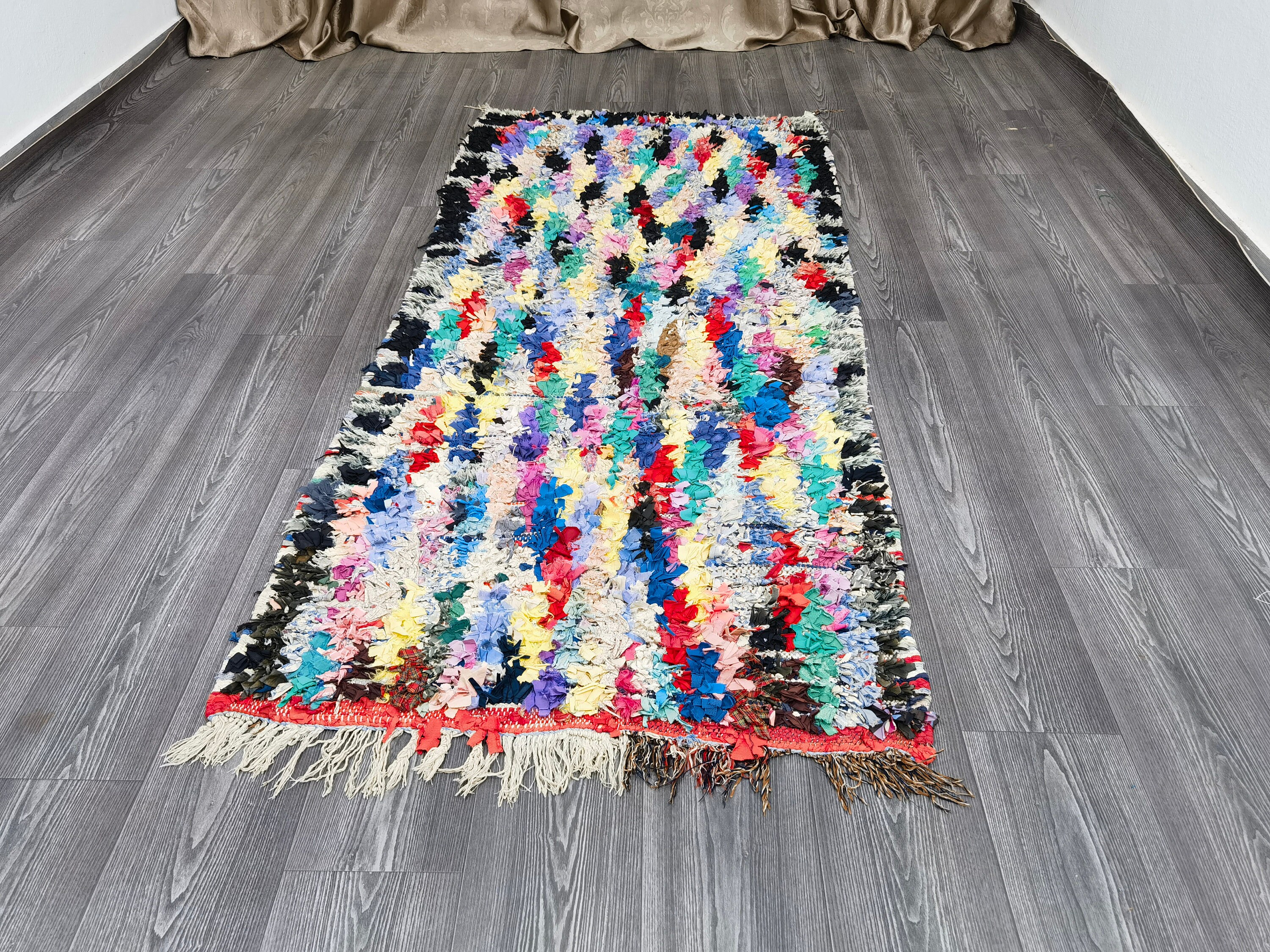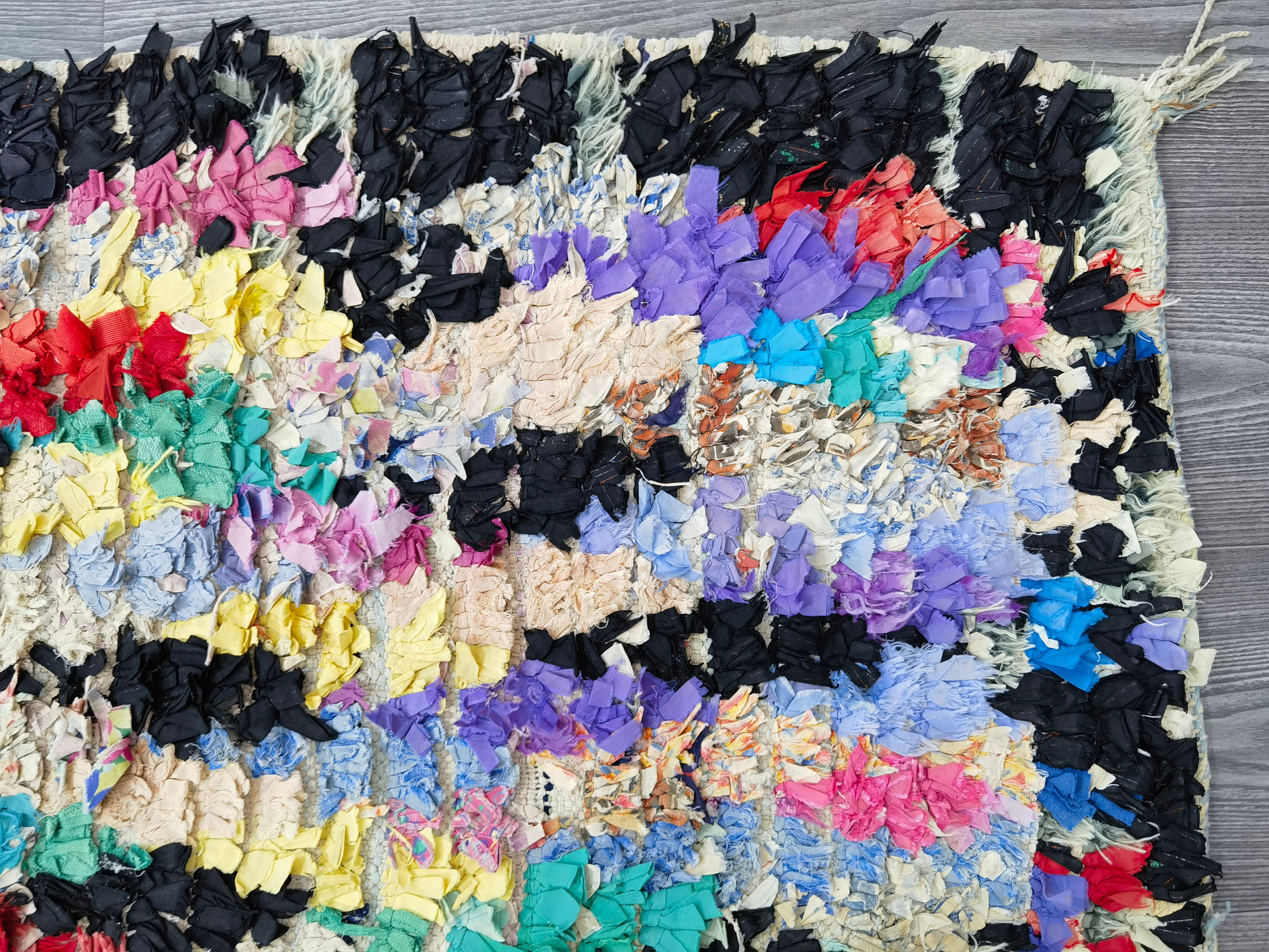 Gorgeous Handmade Moroccan Bohemian Shag Rug - Moroccan Colorful Boucherouite Rug - Old Boucherouite Rug 3x6.9 FT ( 92 X 210 Cm) .