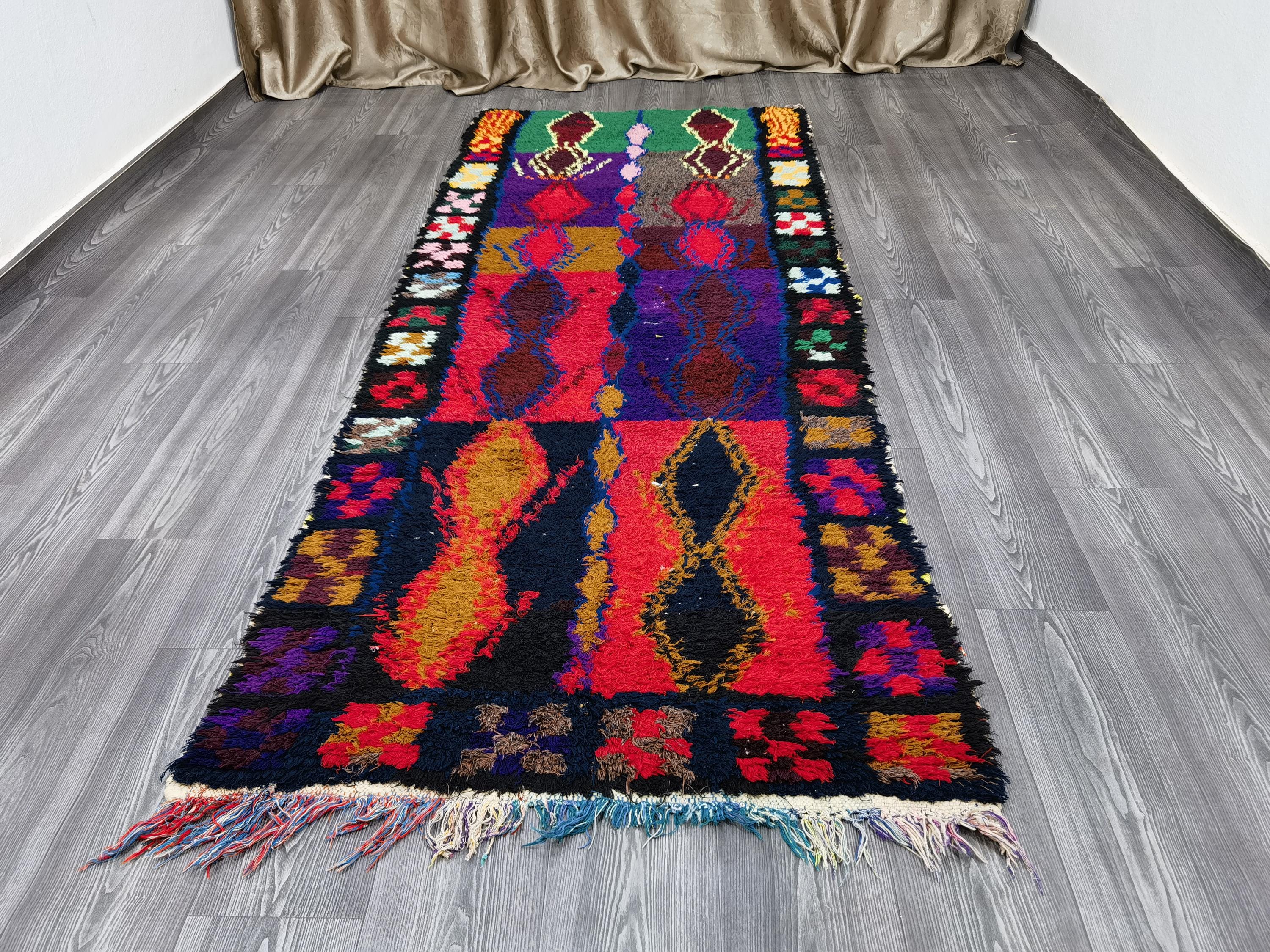 Hand-Knotted Wool Boujaad Runner Rug: Colorful Moroccan Berber Hallway Rug (3.4x8.8 Ft)