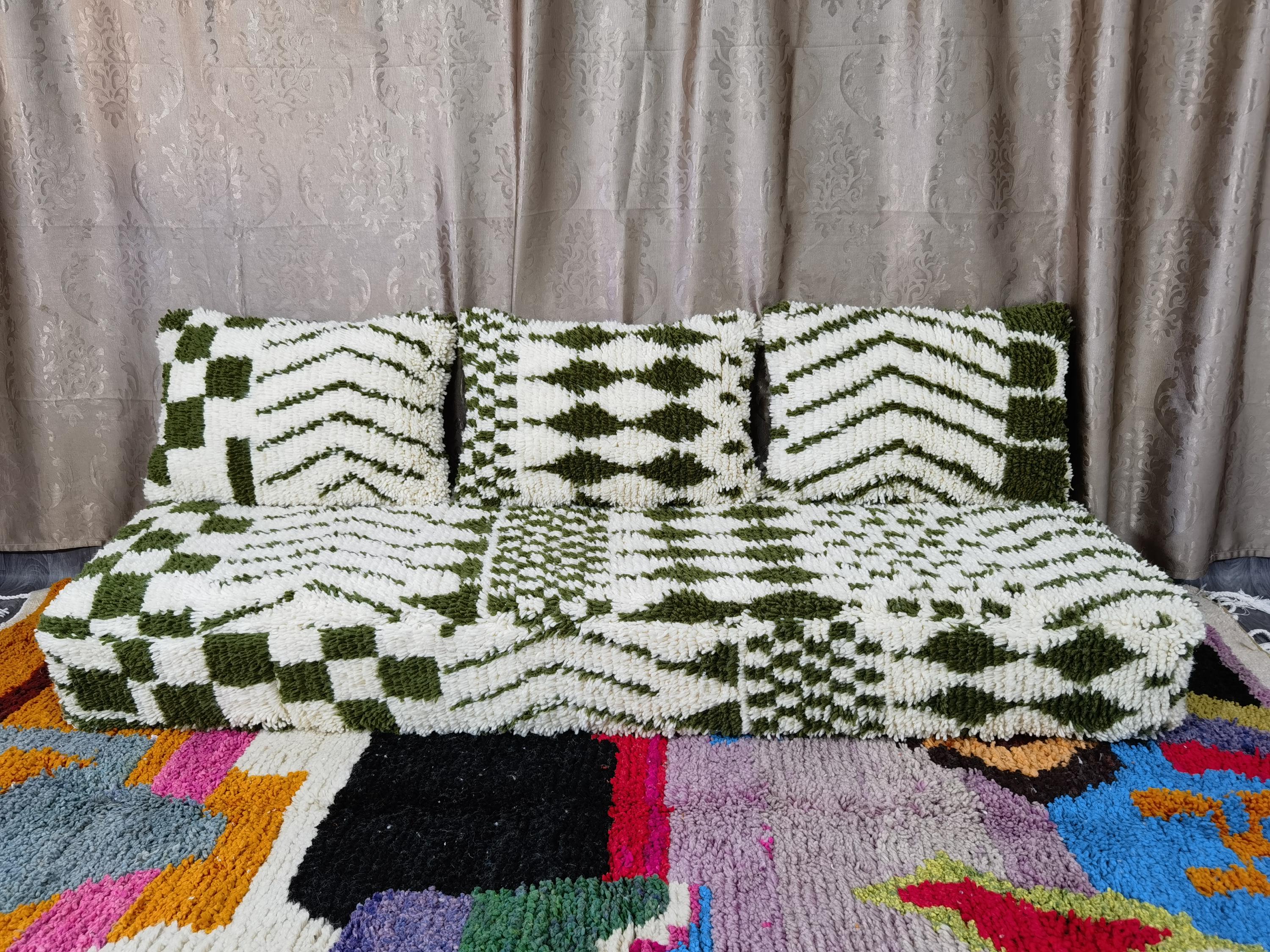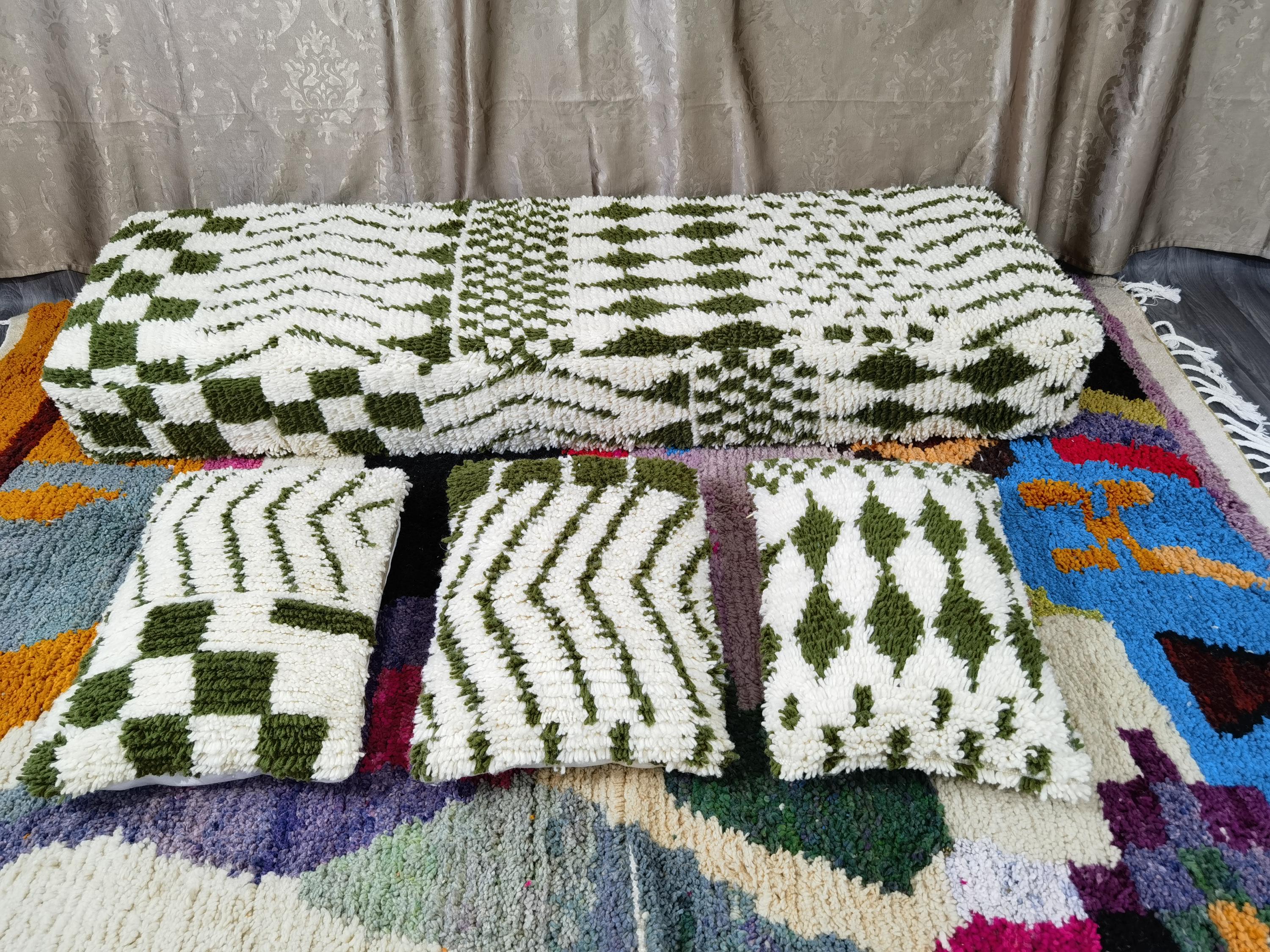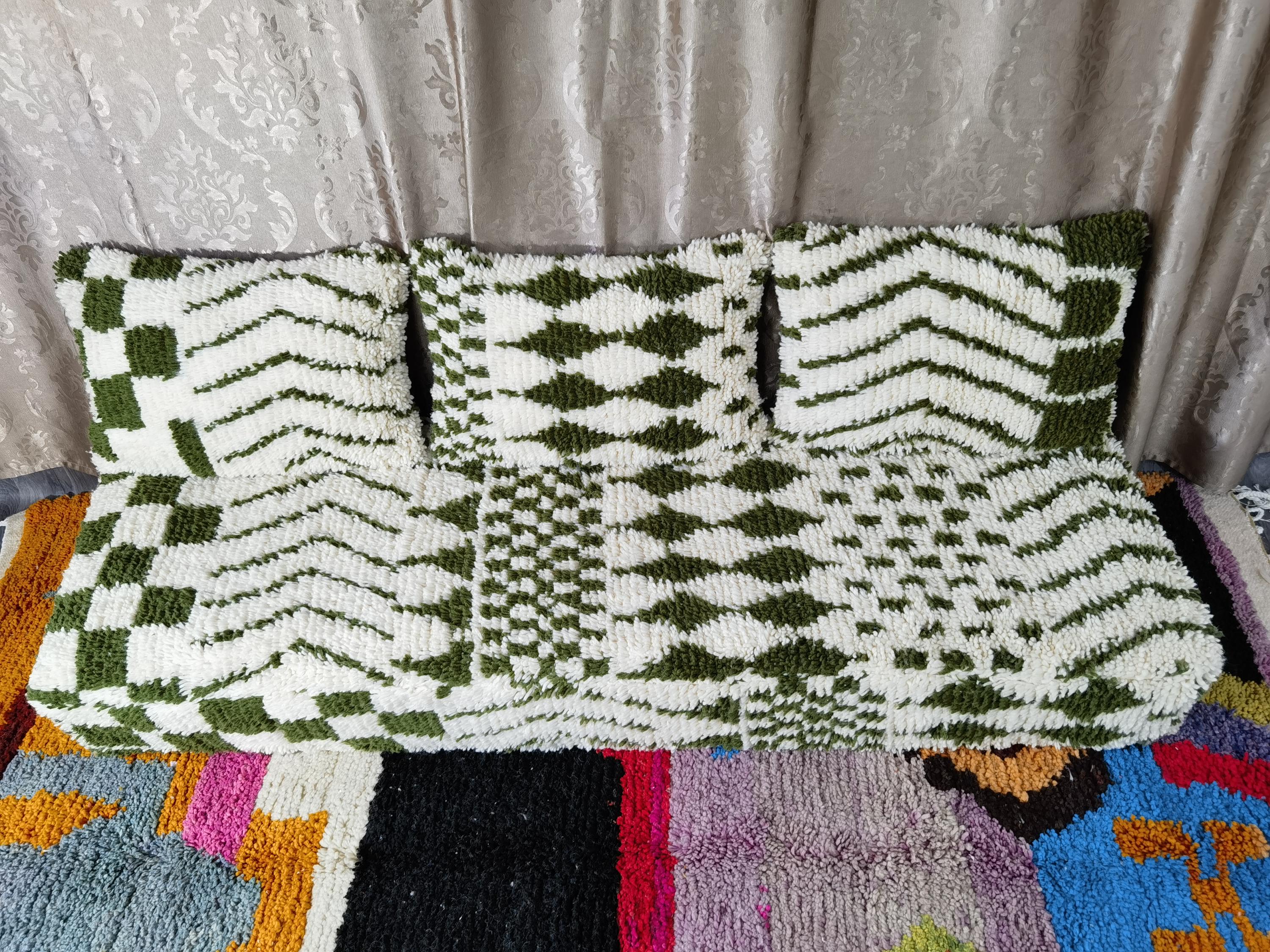 Moroccan Green and White Floor couch - Unstuffed Complete set Long Floor Cushion , Set of 6 ft (180x60x20 cm) + Back Pillows, Pillow cases