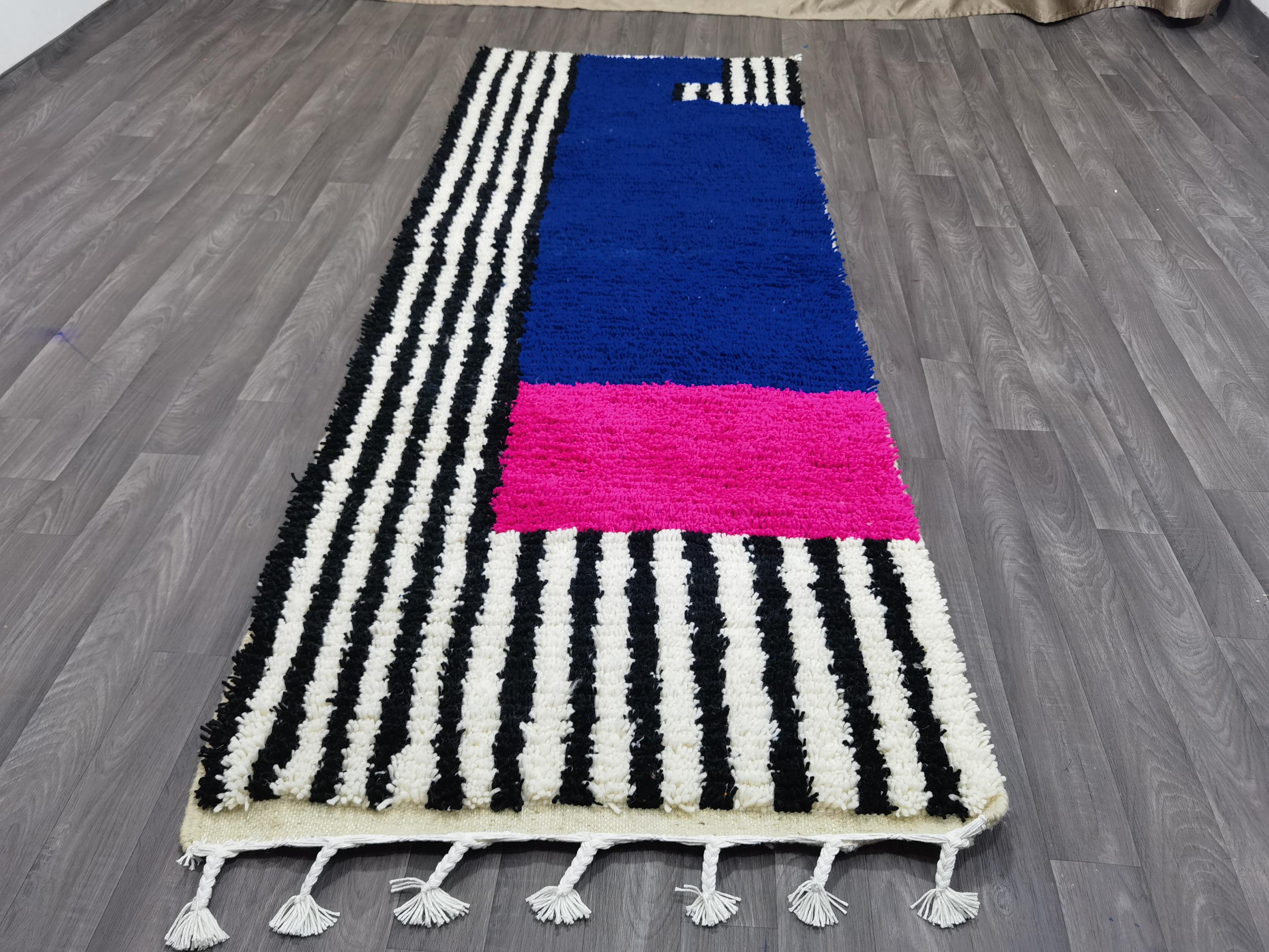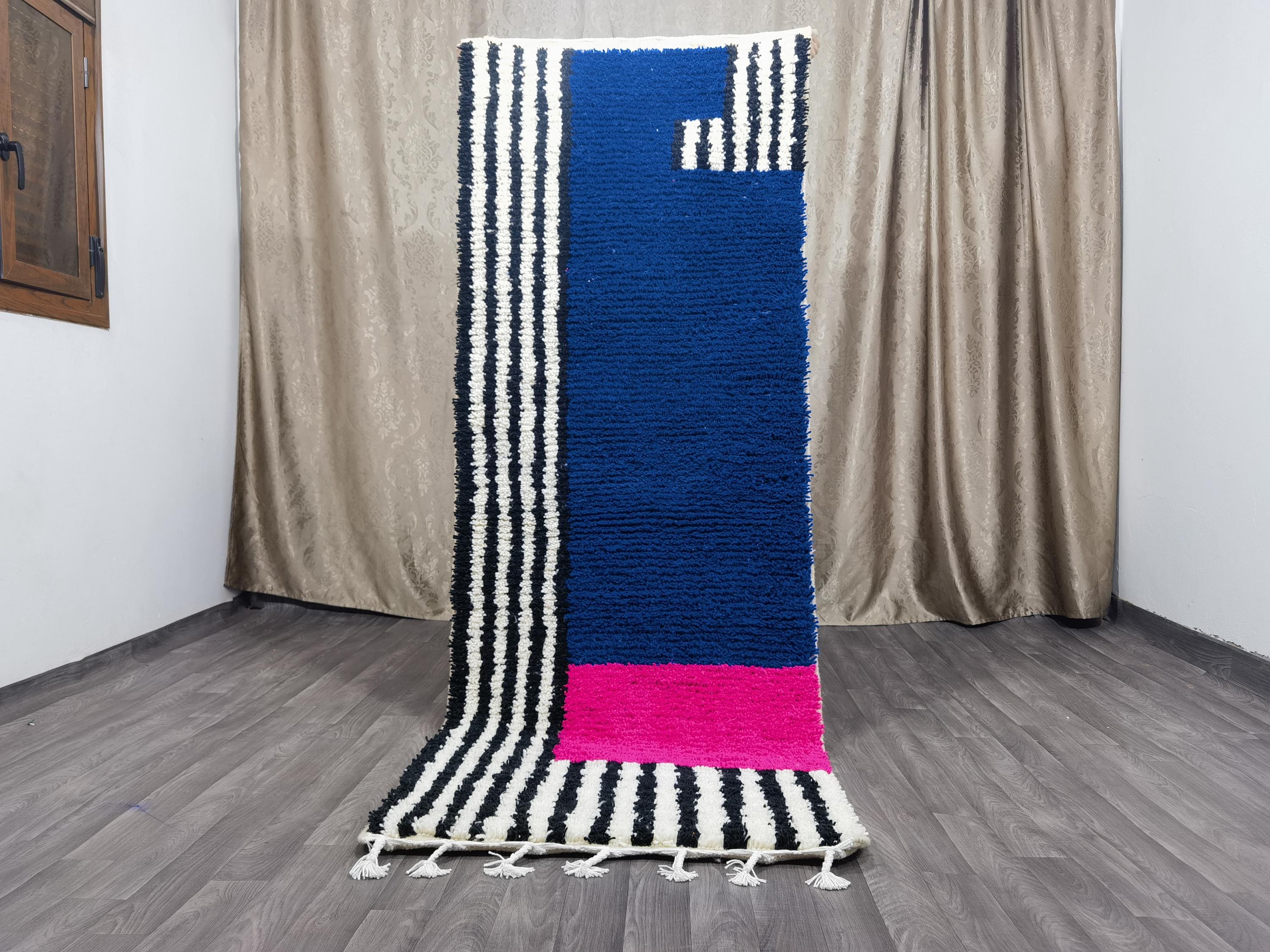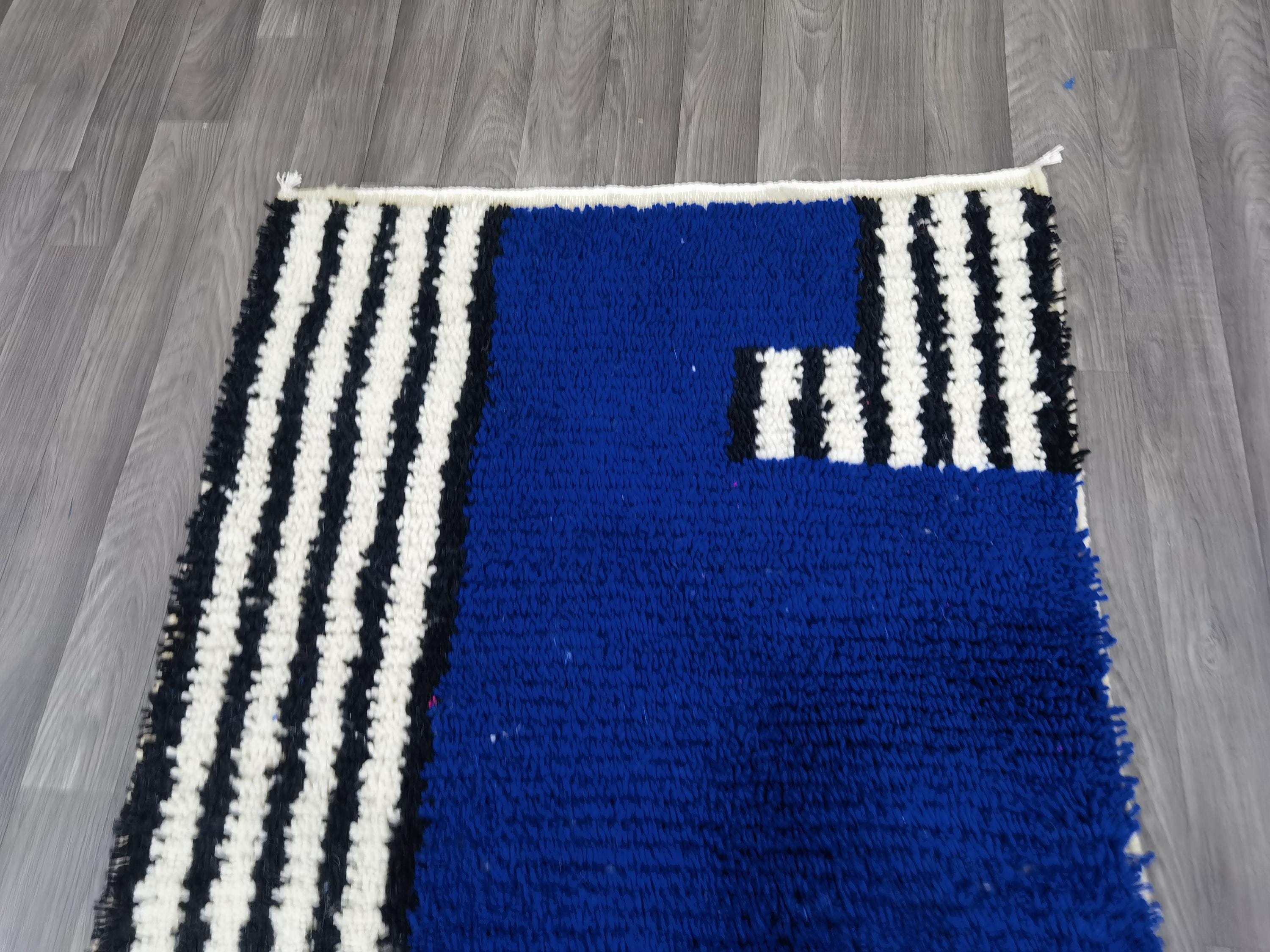 Blue Beni Ourain Shaggy Runner – Handmade Moroccan Wool Rug .