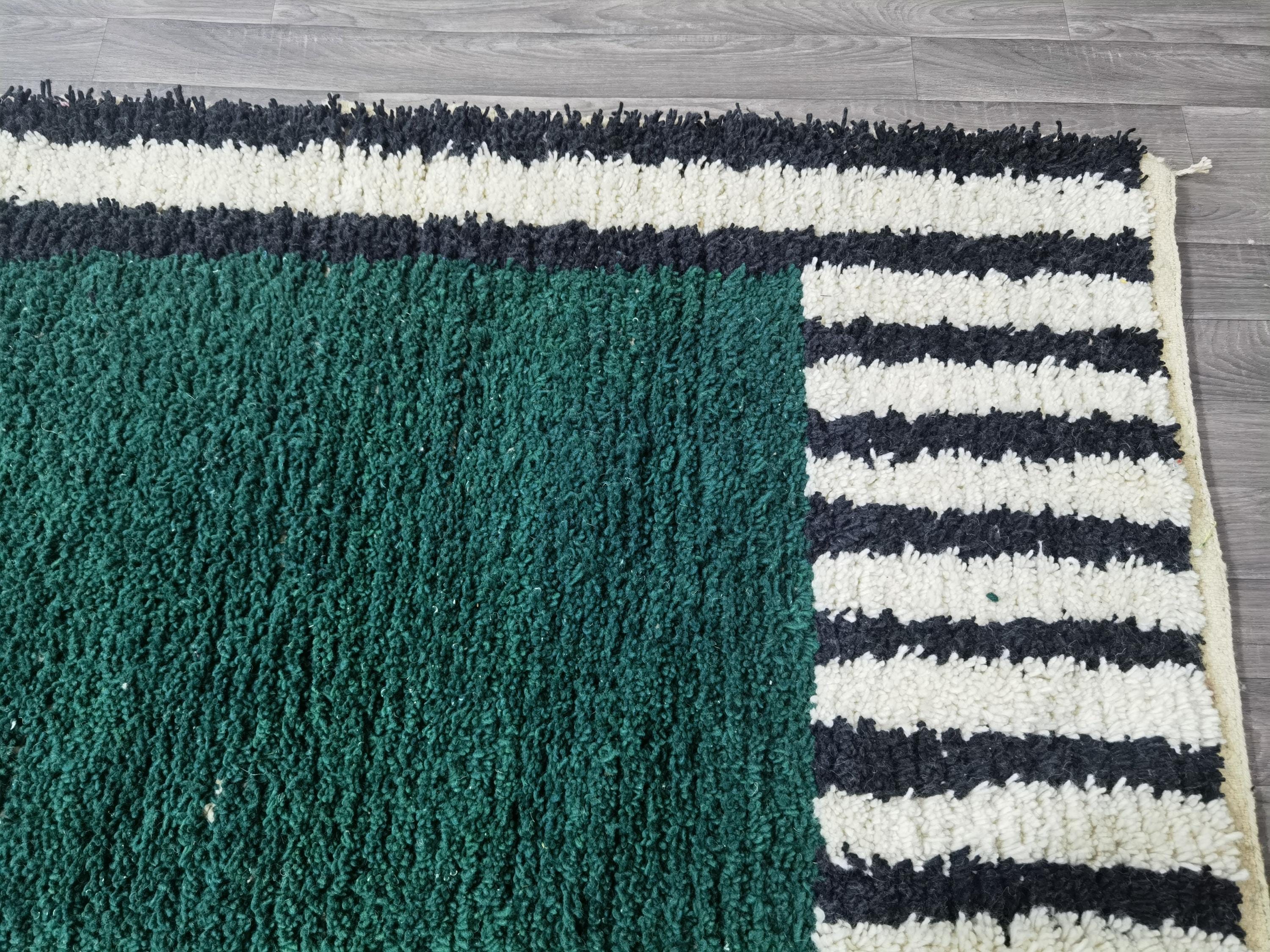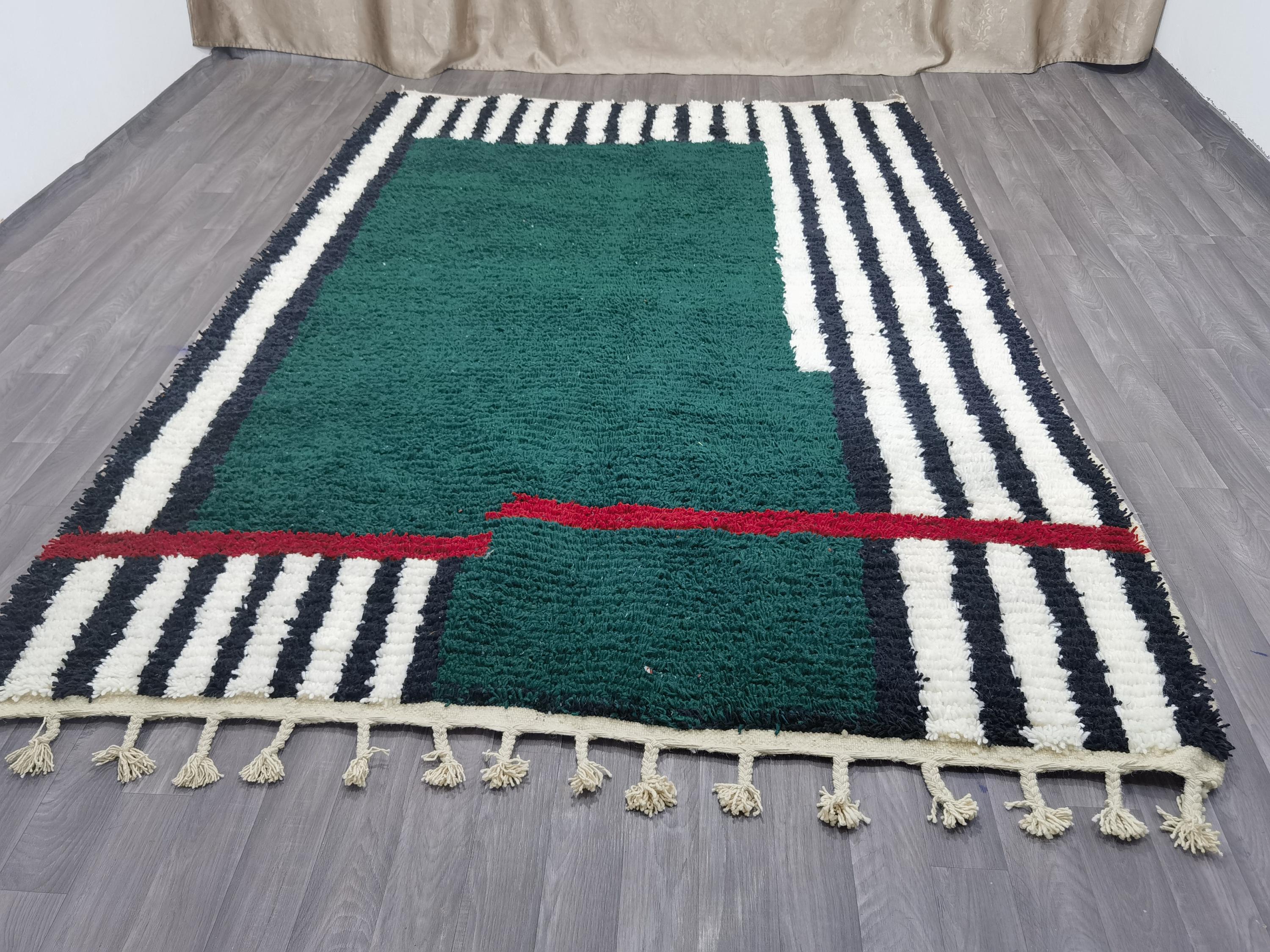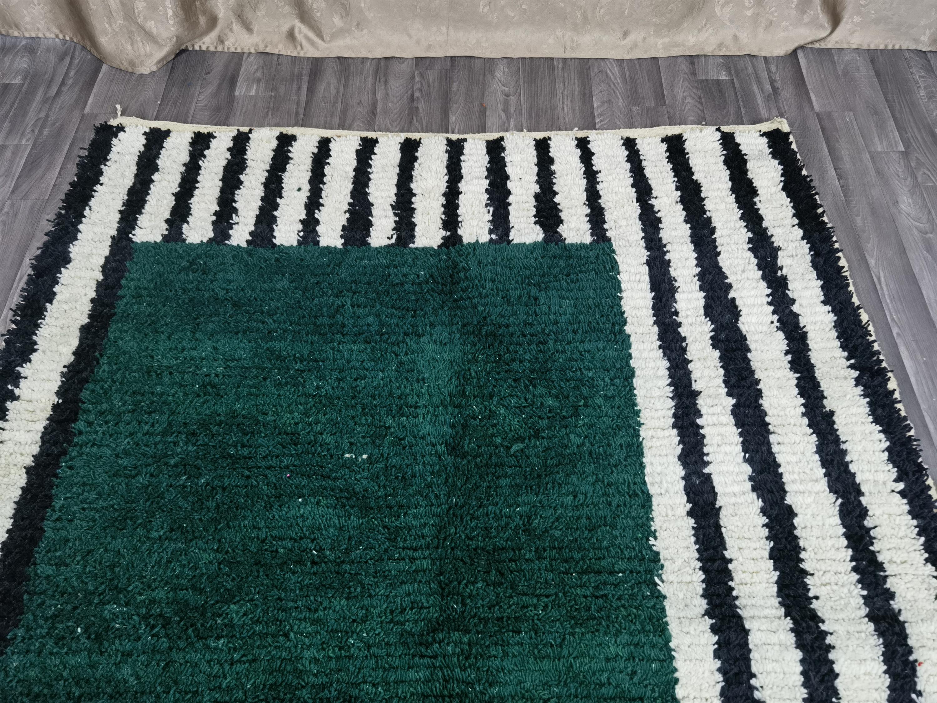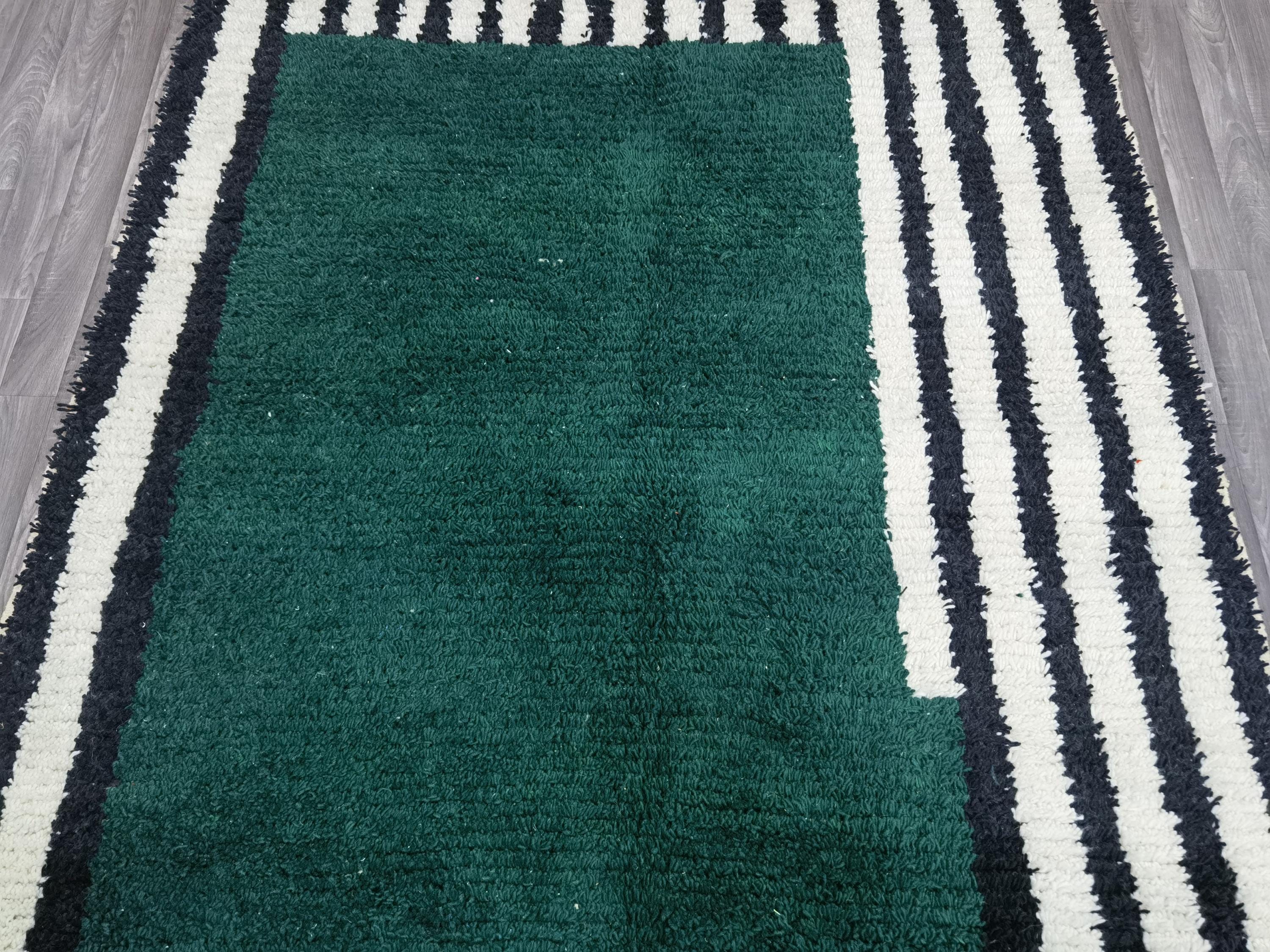 Carefully handwoven by skilled Moroccan artisans using 100% natural sheep wool, this rug offers exceptional softness, durability, and timeless beauty. The deep green center combined with striped Berber patterns creates a modern yet authentic Moroccan style loved by interior designers.