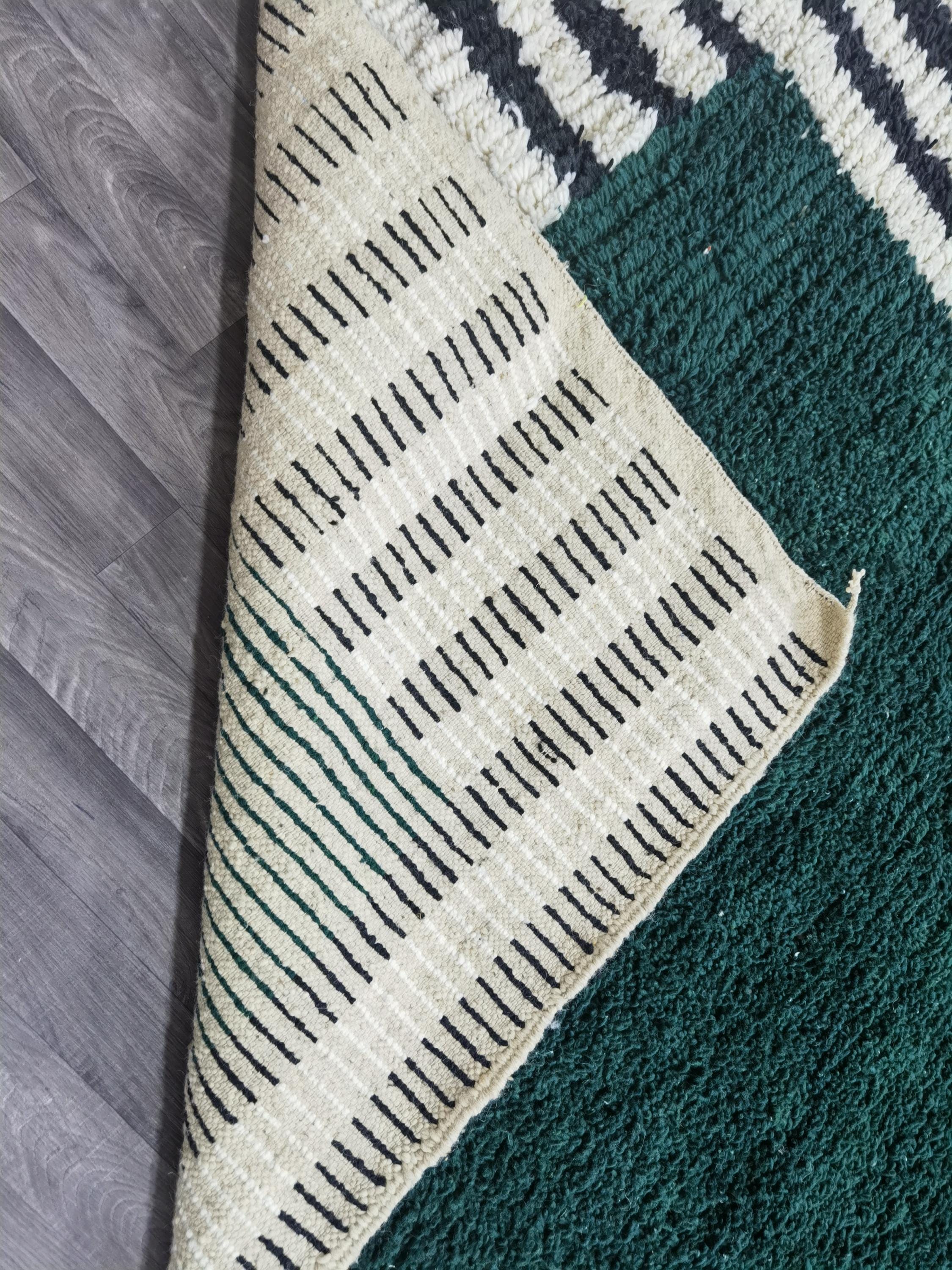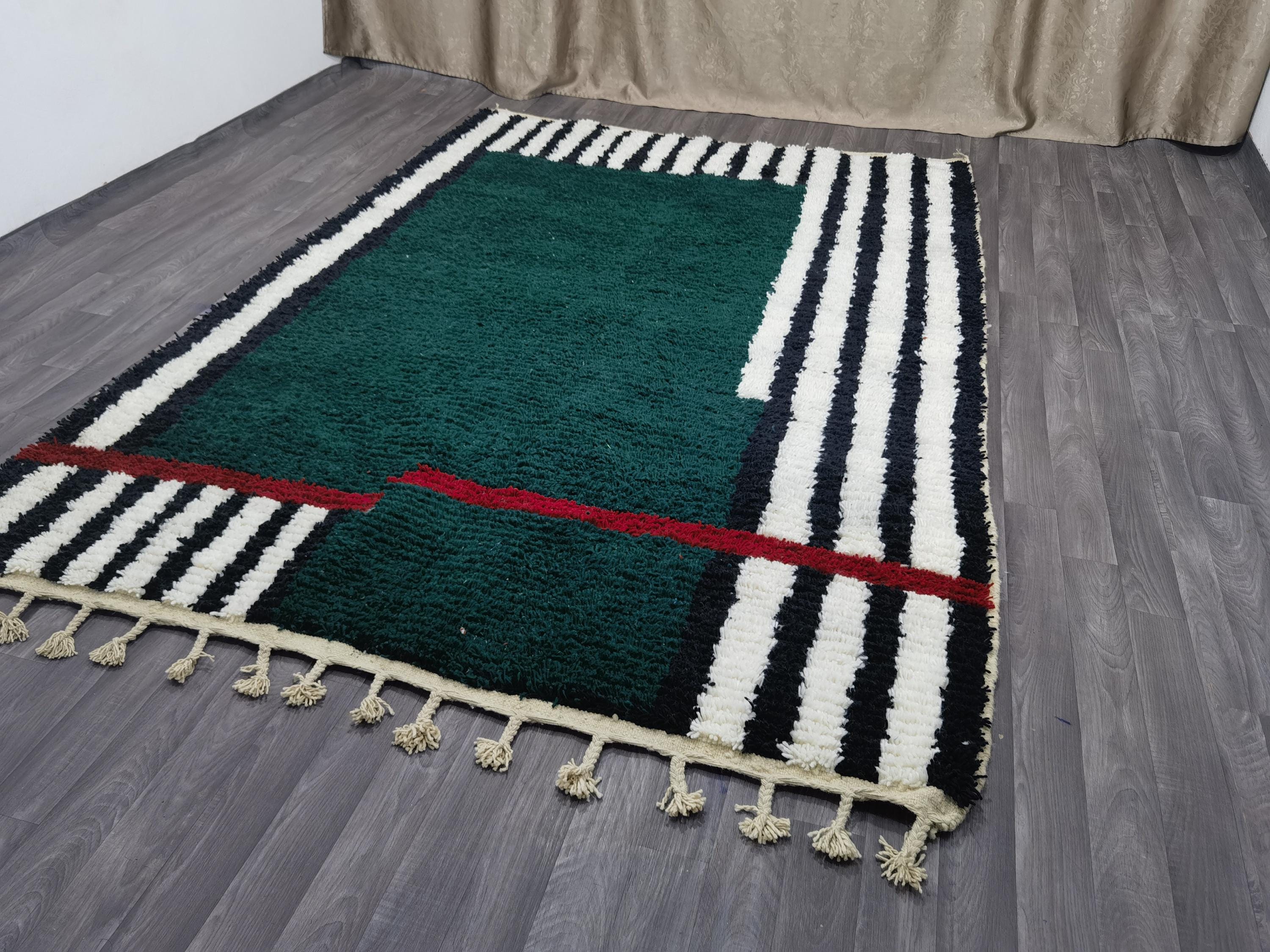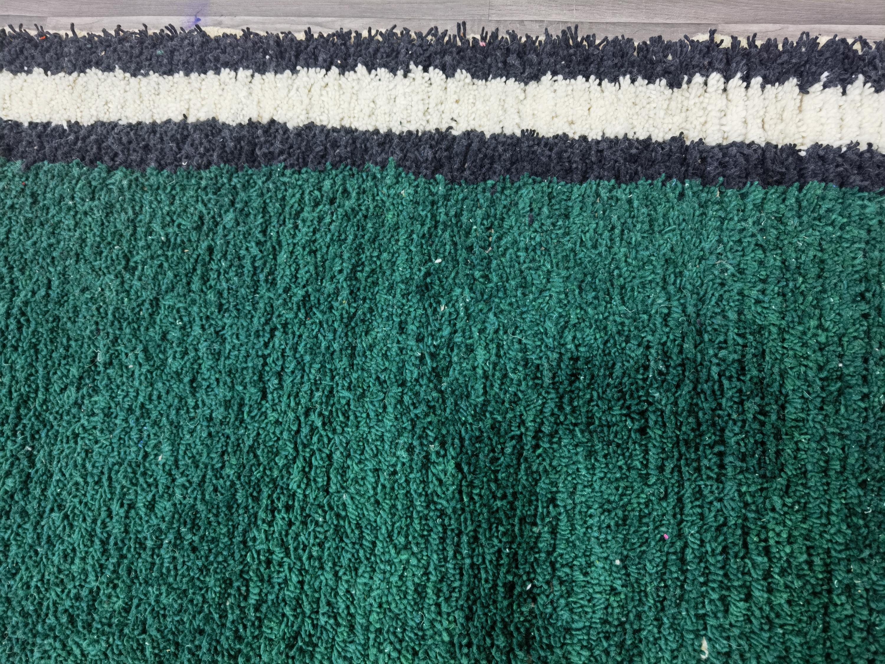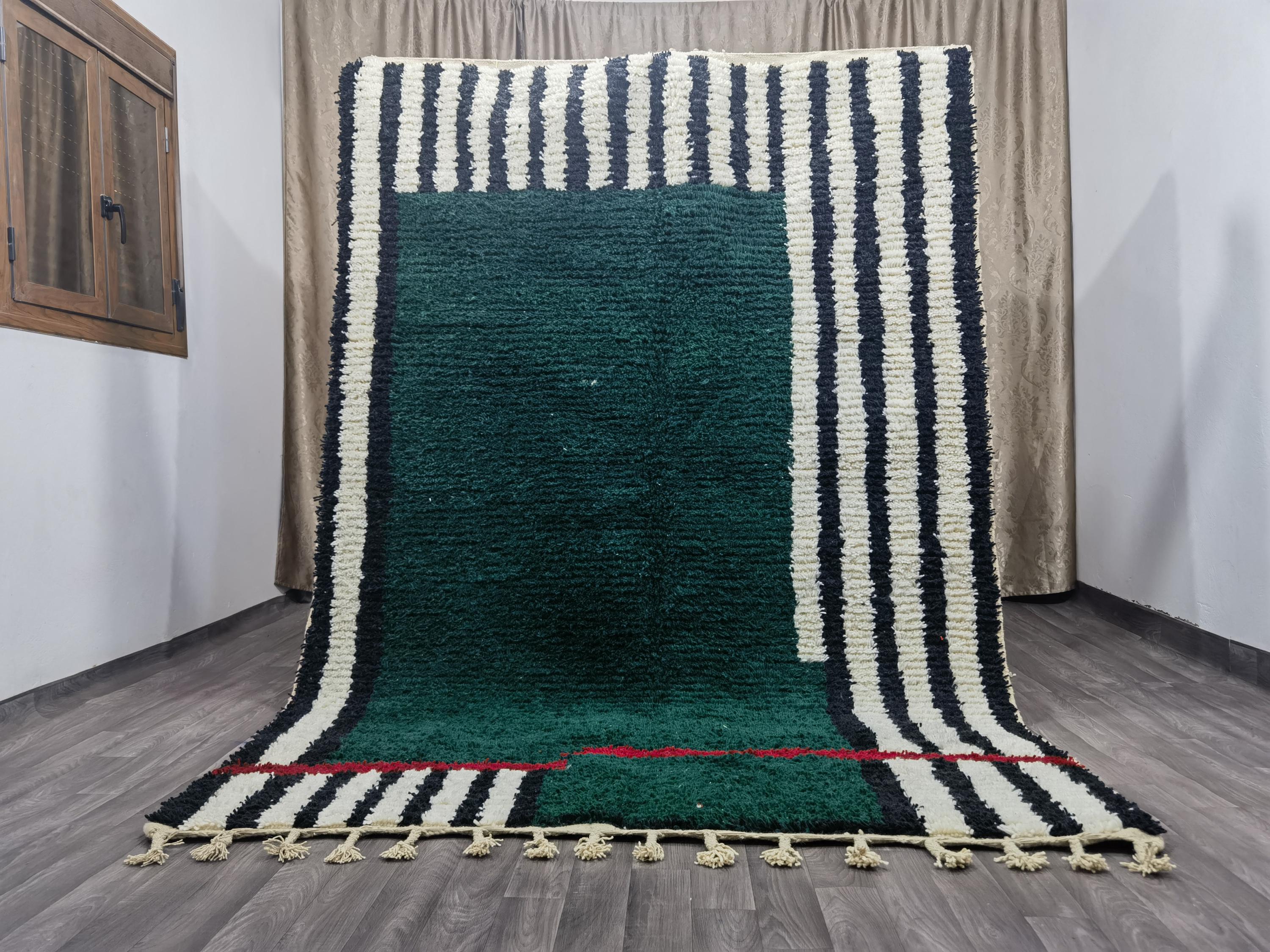 Carefully handwoven by skilled Moroccan artisans using 100% natural sheep wool, this rug offers exceptional softness, durability, and timeless beauty. The deep green center combined with striped Berber patterns creates a modern yet authentic Moroccan style loved by interior designers.