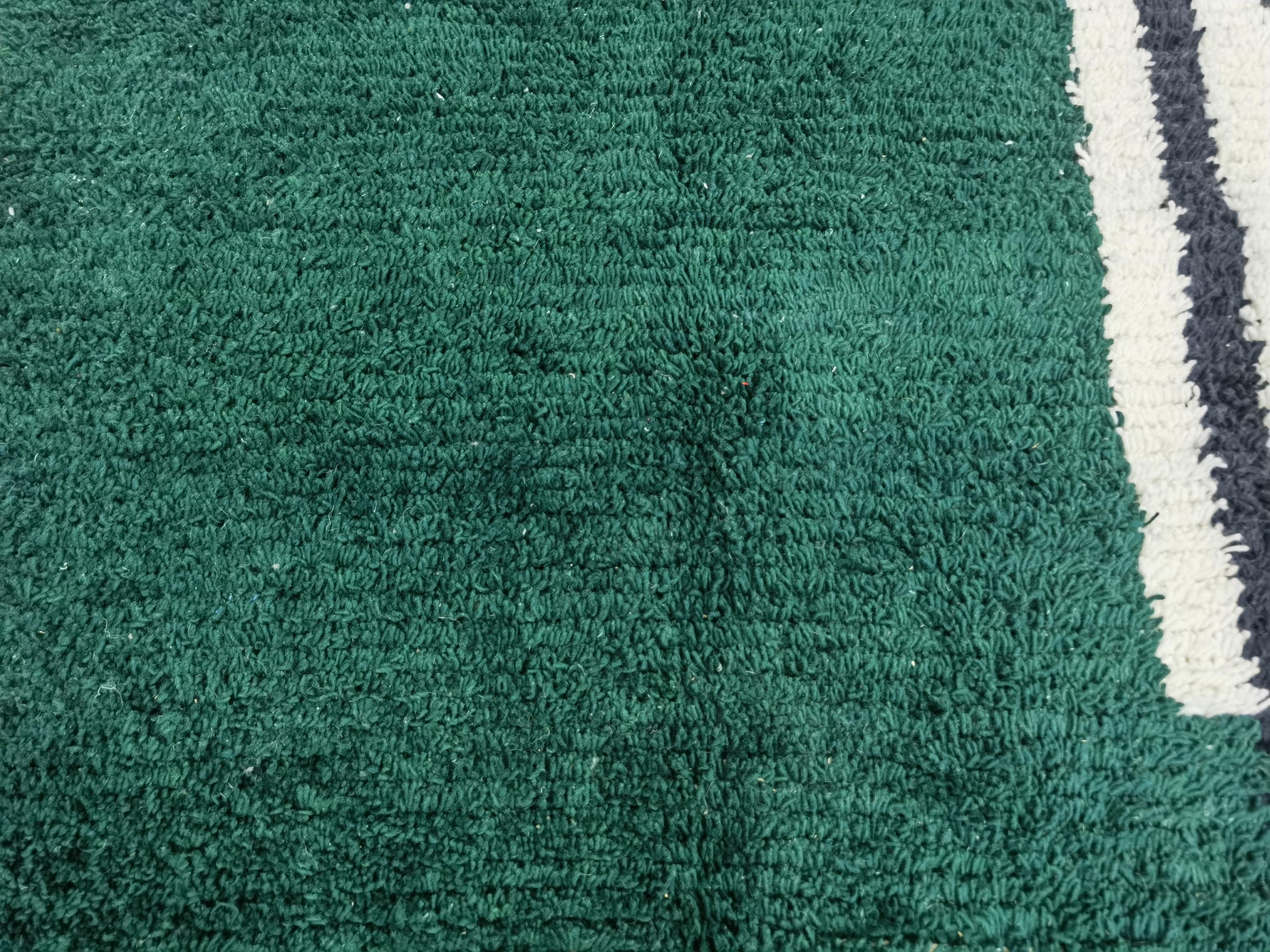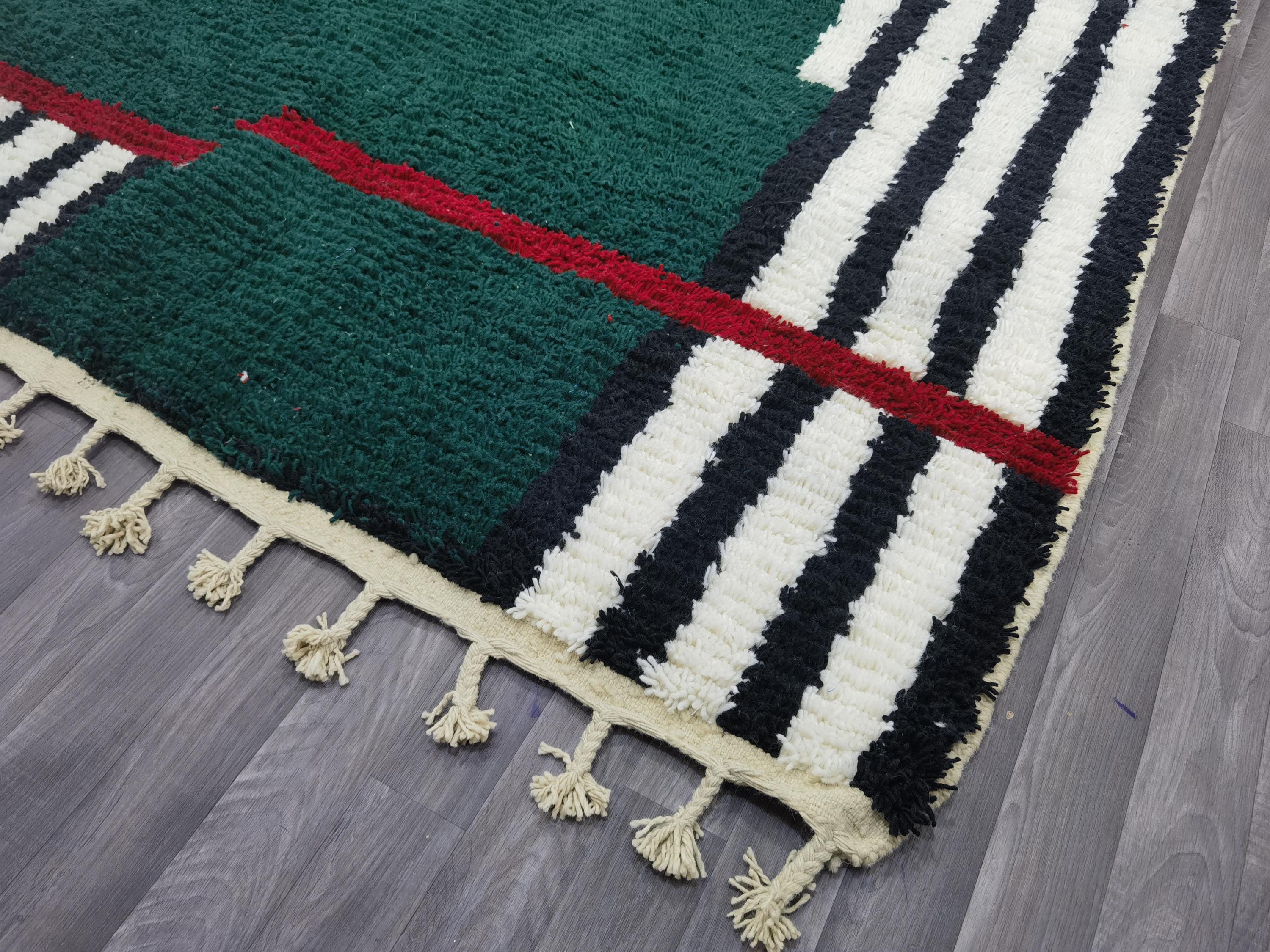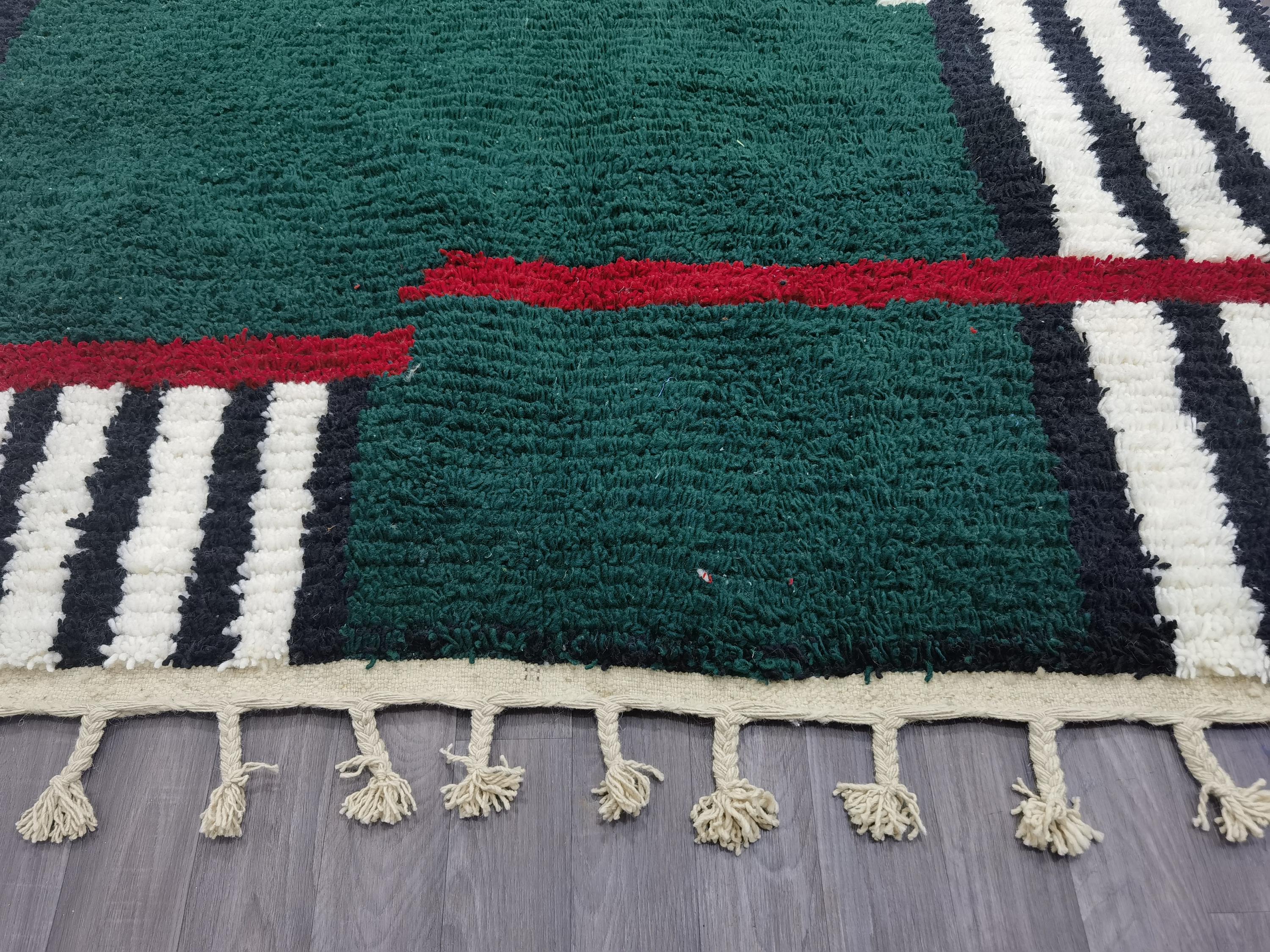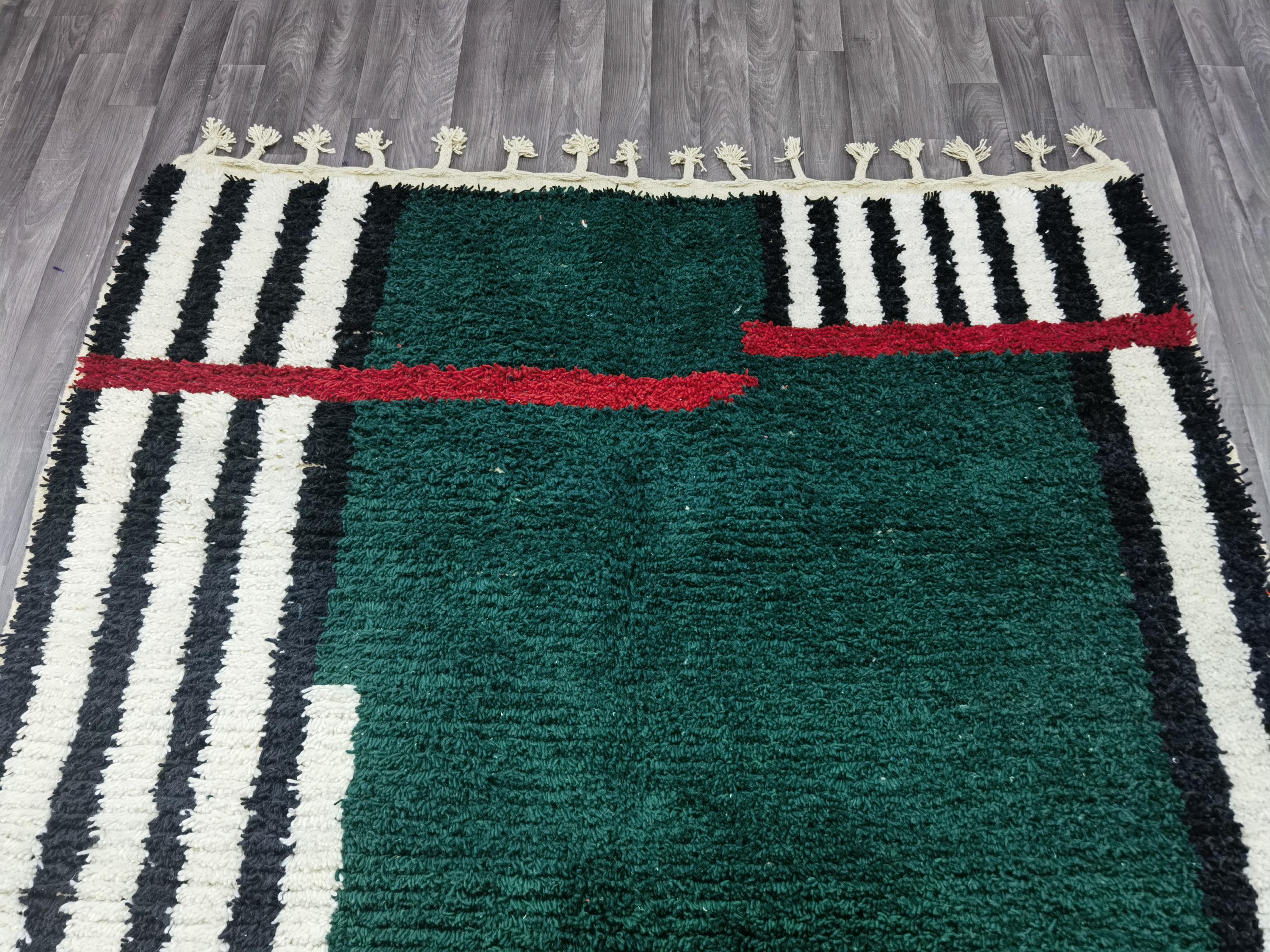 Carefully handwoven by skilled Moroccan artisans using 100% natural sheep wool, this rug offers exceptional softness, durability, and timeless beauty. The deep green center combined with striped Berber patterns creates a modern yet authentic Moroccan style loved by interior designers.